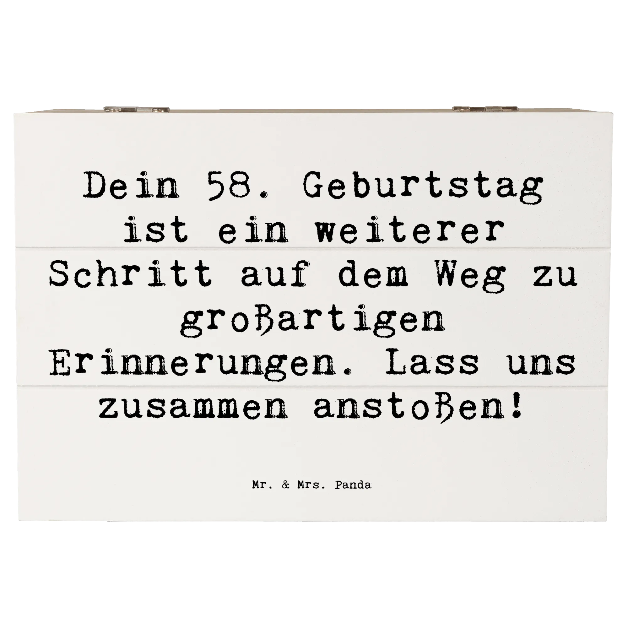 Entdecke die zauberhafte Holzkiste von Mr. & Mrs. Panda! Diese wunderschöne Kiste ist nicht nur ein echter Blickfang, sondern auch der perfekte Aufbewahrungsort für deine kostbarsten Erinnerungen. Ob für Fotos, kleine Schätze oder als Geschenkbox für einen unvergesslichen Anlass – mit einem liebevollen Design und dem Motto 'Dein 58. Geburtstag ist ein weiterer Schritt auf dem Weg zu großartigen Erinnerungen. Lass uns zusammen anstoßen!' sorgt diese Erinnerungskiste für das i-Tüpfelchen bei jedem Geburtstag.