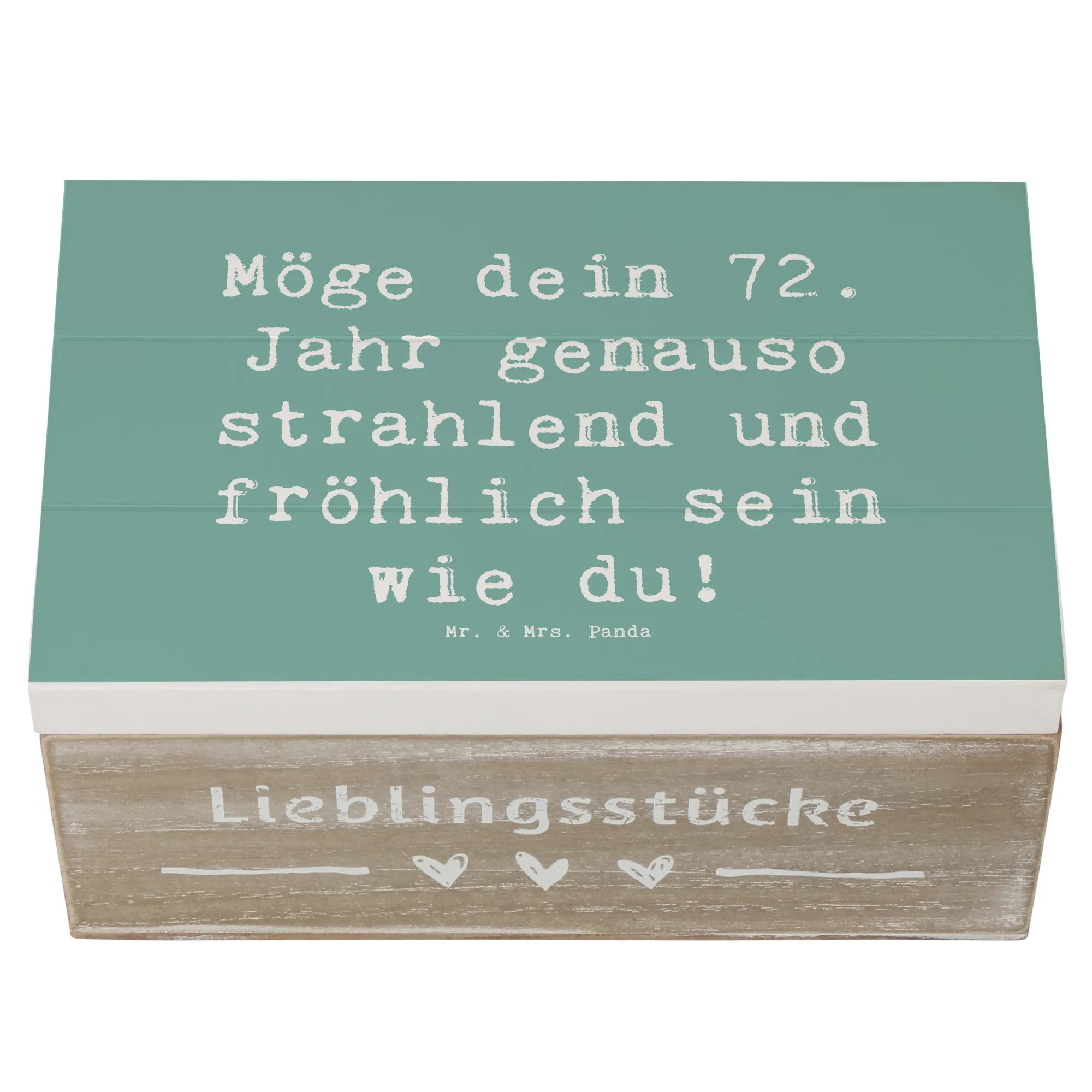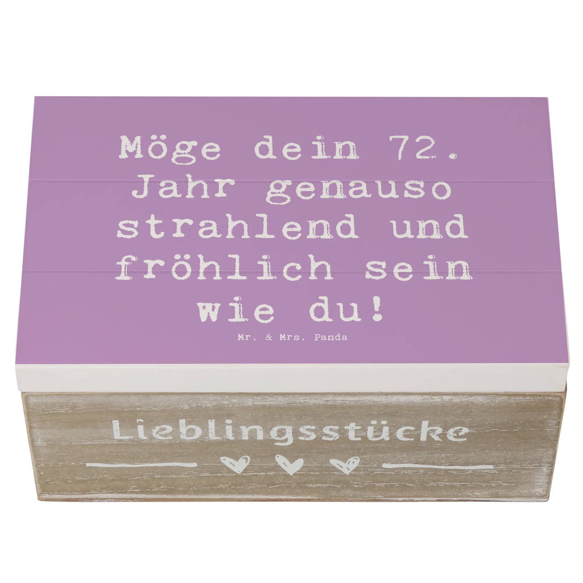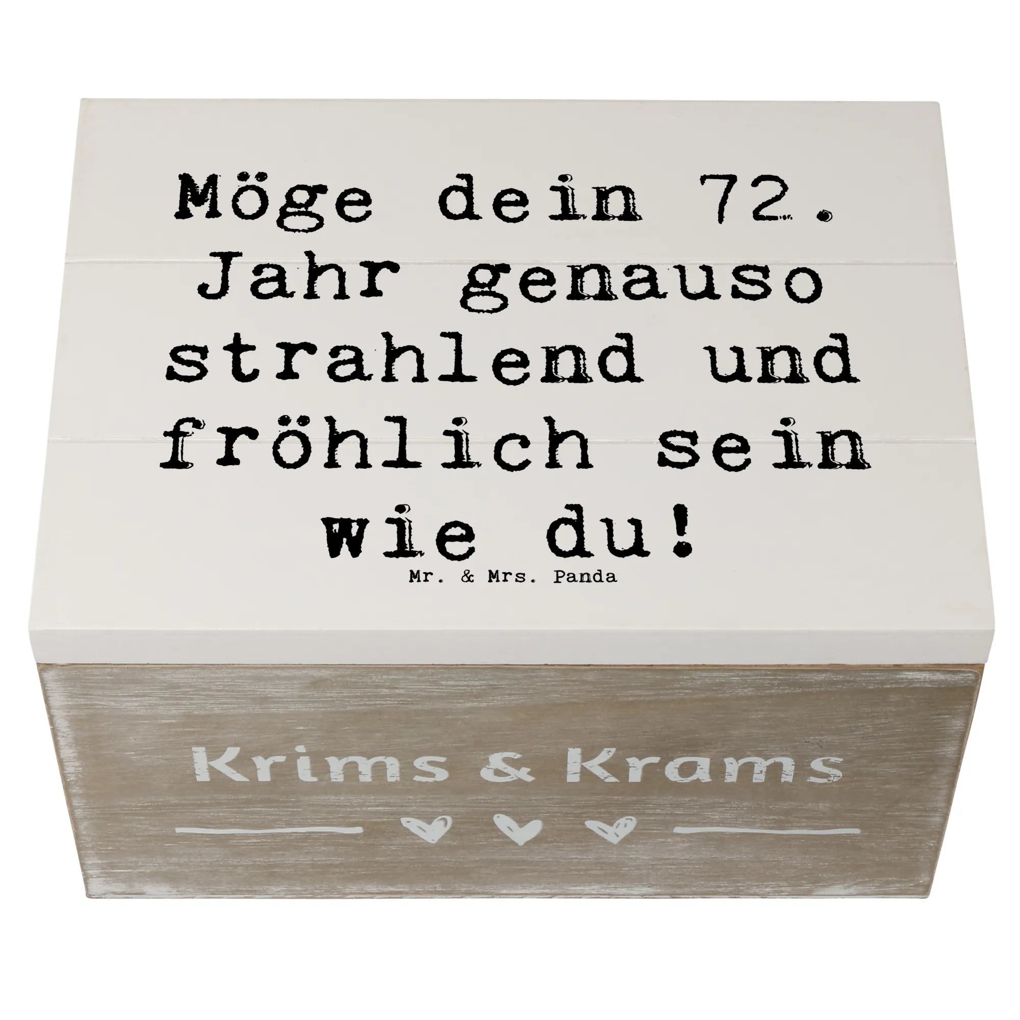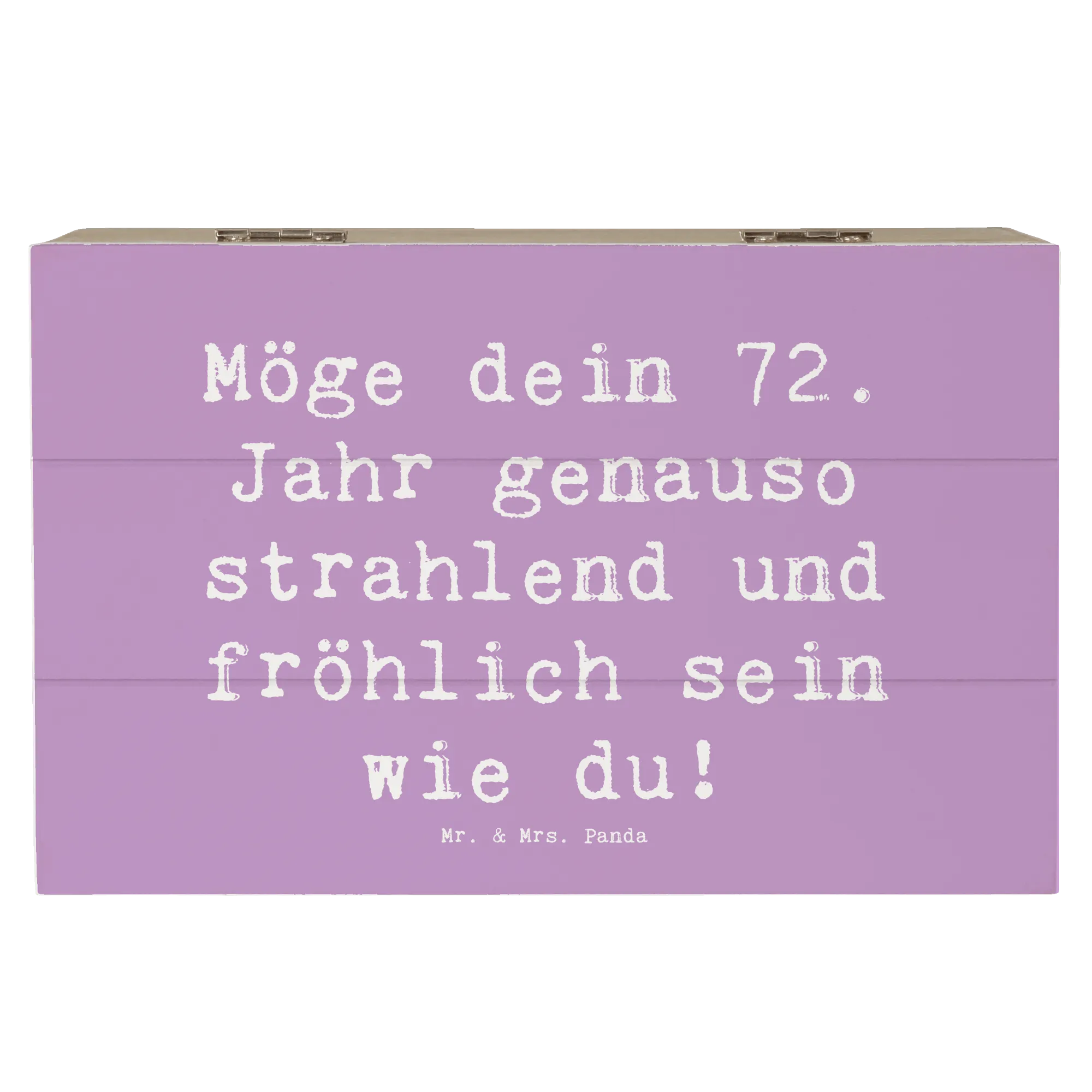Die wunderschöne Holzkiste von Mr. & Mrs. Panda ist der perfekte Begleiter zum 72. Geburtstag. Der Spruch "Möge dein 72. Jahr genauso strahlend und fröhlich sein wie du!" ziert die Kiste und bringt Freude und Glück für den Beschenkten.
