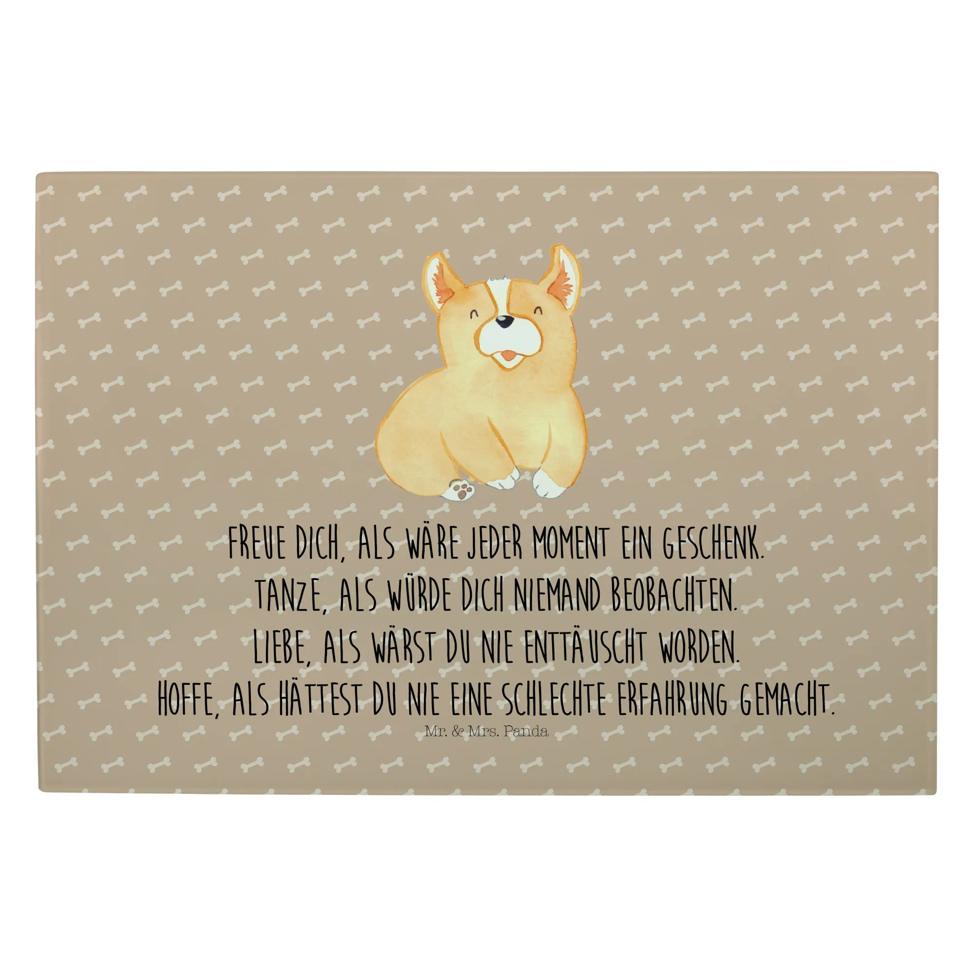 Entdecke das bezaubernde Medium Glas Schneidbrett mit dem süßen Corgie-Motiv aus unserer Hunde Kollektion! Dieses schicke Schneidebrett ist nicht nur ein praktisches Küchenutensil, sondern auch ein echter Hingucker in deiner Küche. Das einzigartige Design zeigt einen niedlichen Corgie und wird durch den liebevollen Spruch "Freue dich, als wäre jeder Moment ein Geschenk. Tanze, als würde dich niemand beobachten. Liebe, als wärst du nie enttäuscht worden. Hoffe, als hättest du nie eine schlechte Erfahrung gemacht." besonders lebendig. Es bringt Lebensfreude in deine täglichen Kochabenteuer und motiviert dich dazu, die kleinen Dinge im Leben zu genießen!