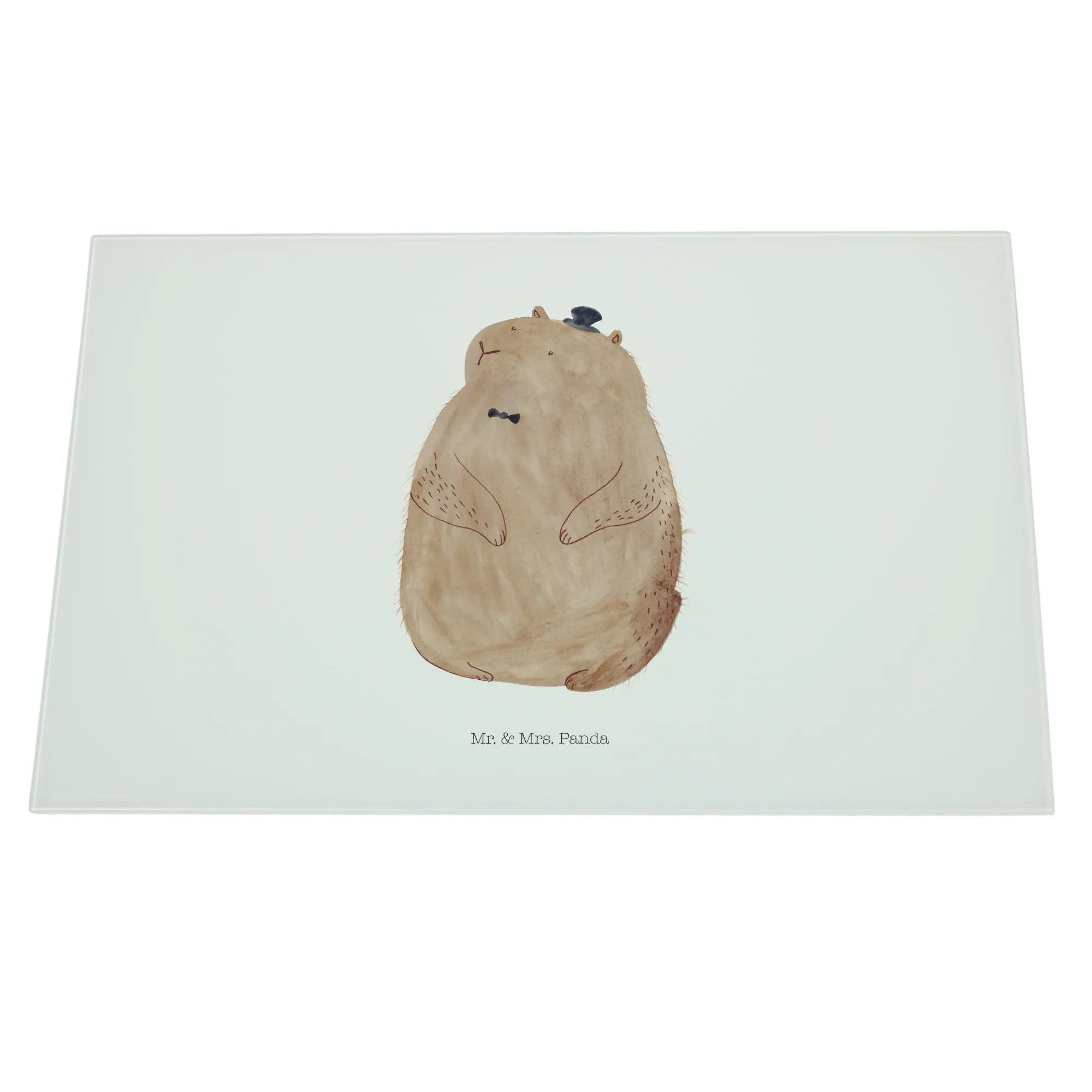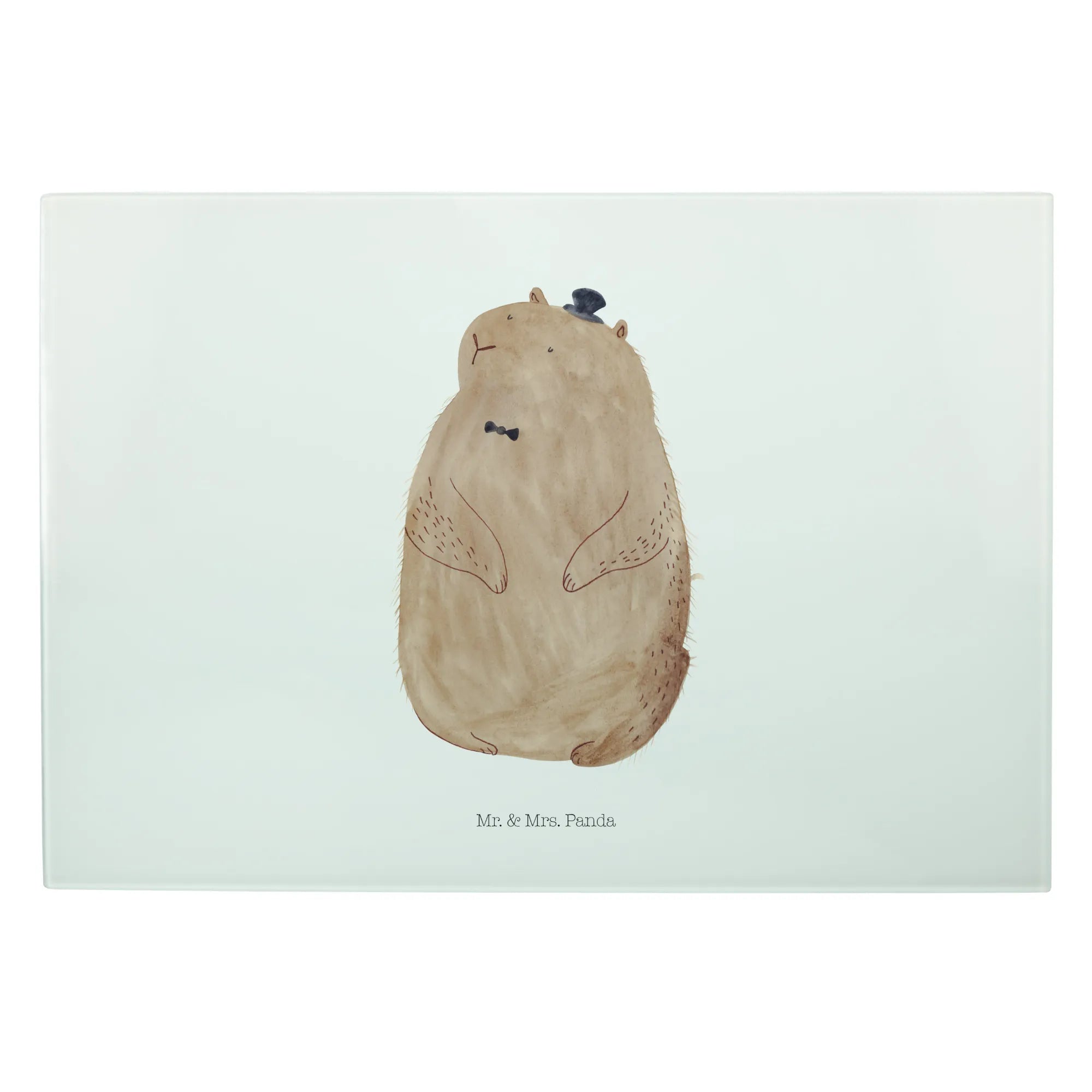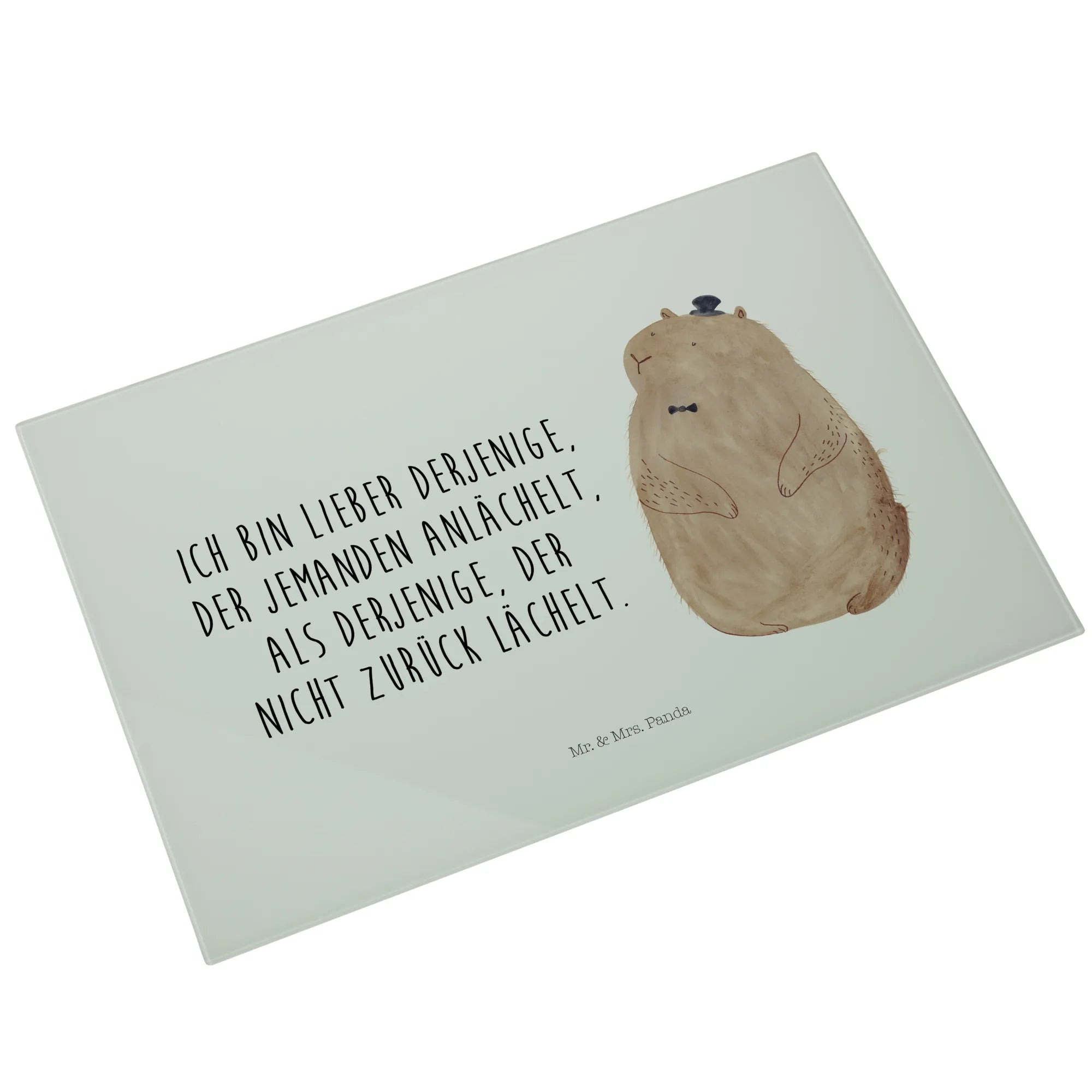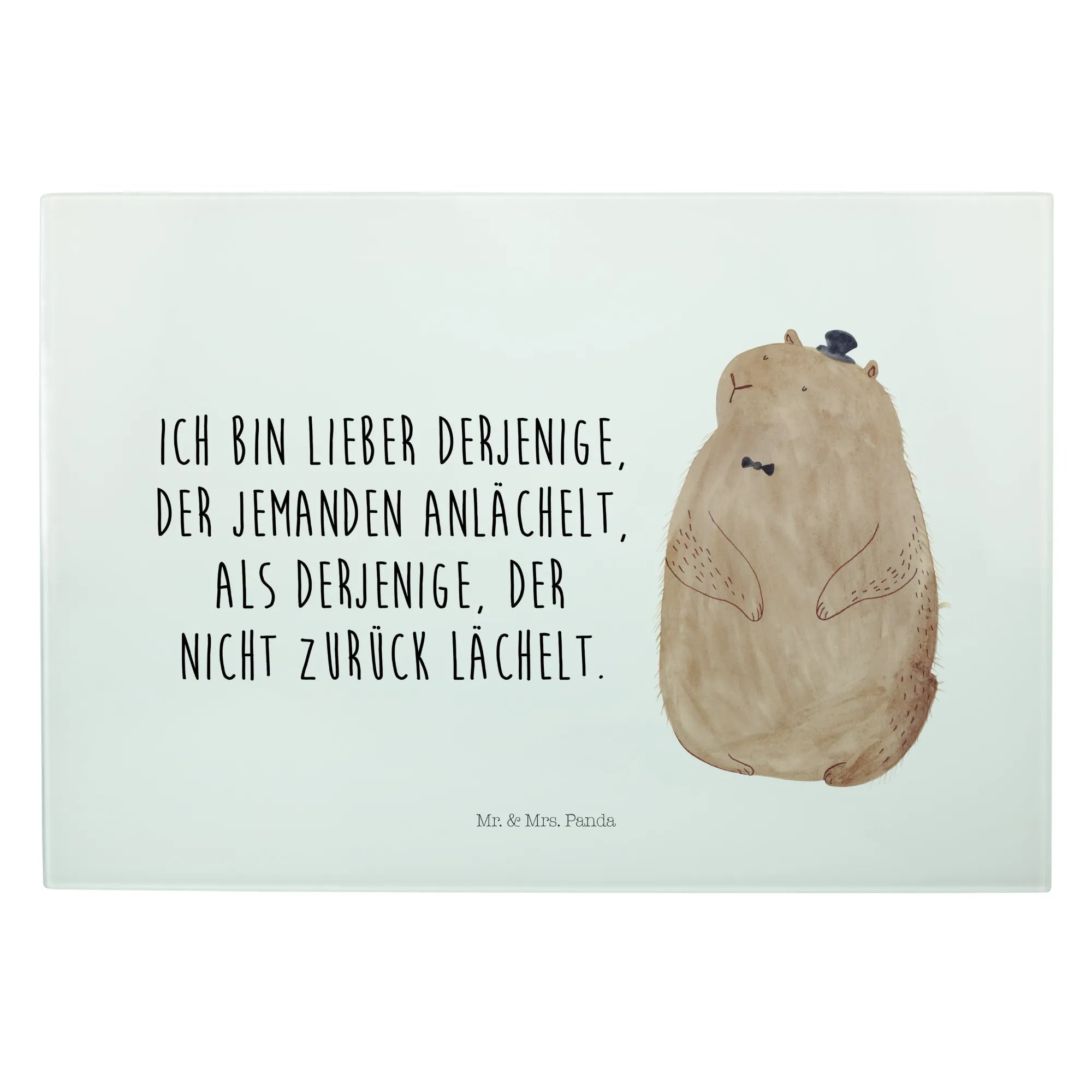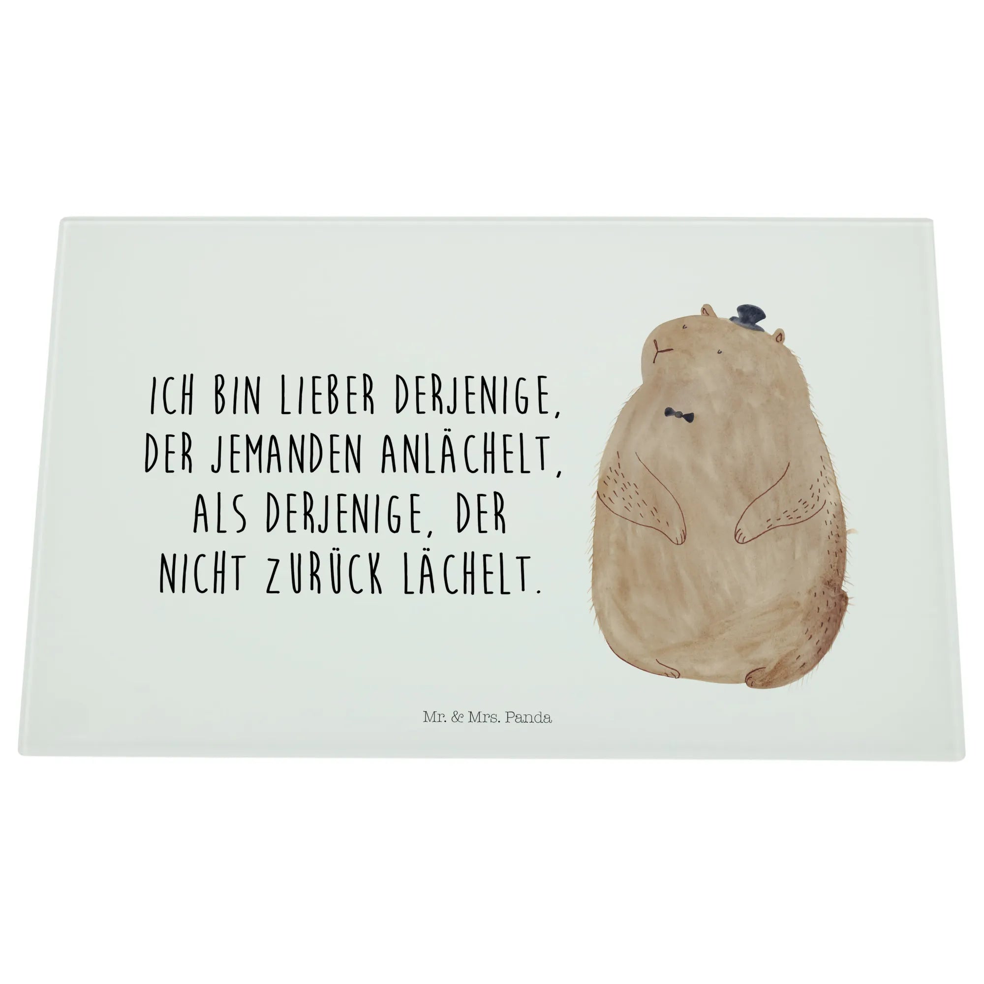 Das Medium Glas Schneidbrett mit dem fröhlichen Murmeltier-Motiv von Mr. & Mrs. Panda ist mehr als nur ein praktisches Küchenutensil. Es ist ein Stück Lebensfreude, dass beim Kochen und Vorbereiten von leckeren Speisen gute Laune verbreitet. Mit einer Größe von 284 mm x 200 mm ist dieses Schneidebrett ideal geeignet, um Gemüse, Obst oder Fleisch zu schneiden. Das süße Murmeltier, das einen Zylinder auf dem Kopf trägt, bringt nicht nur einen Hauch von Niedlichkeit in Deine Küche, sondern vermittelt auch eine Botschaft der Freundlichkeit und des Respekts.