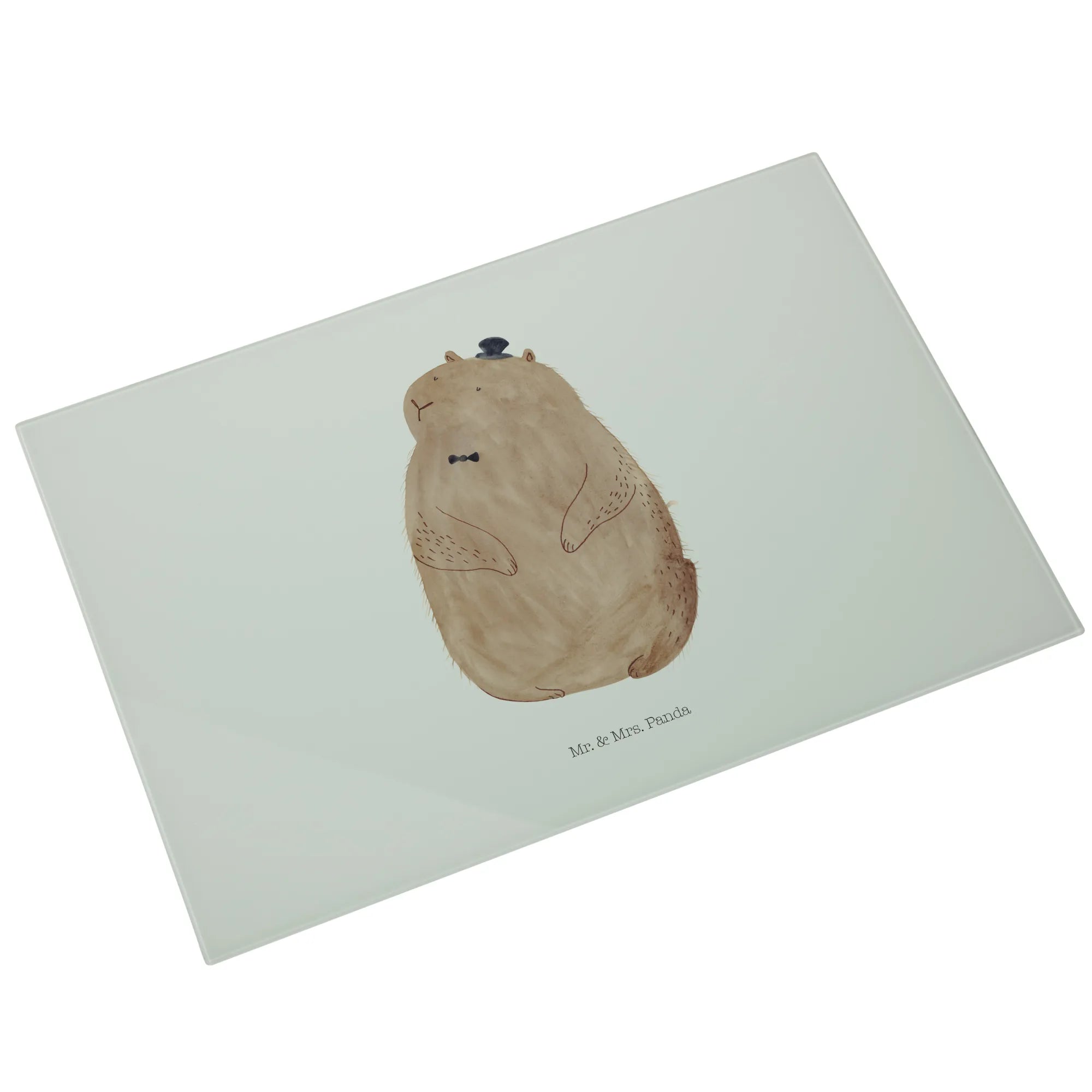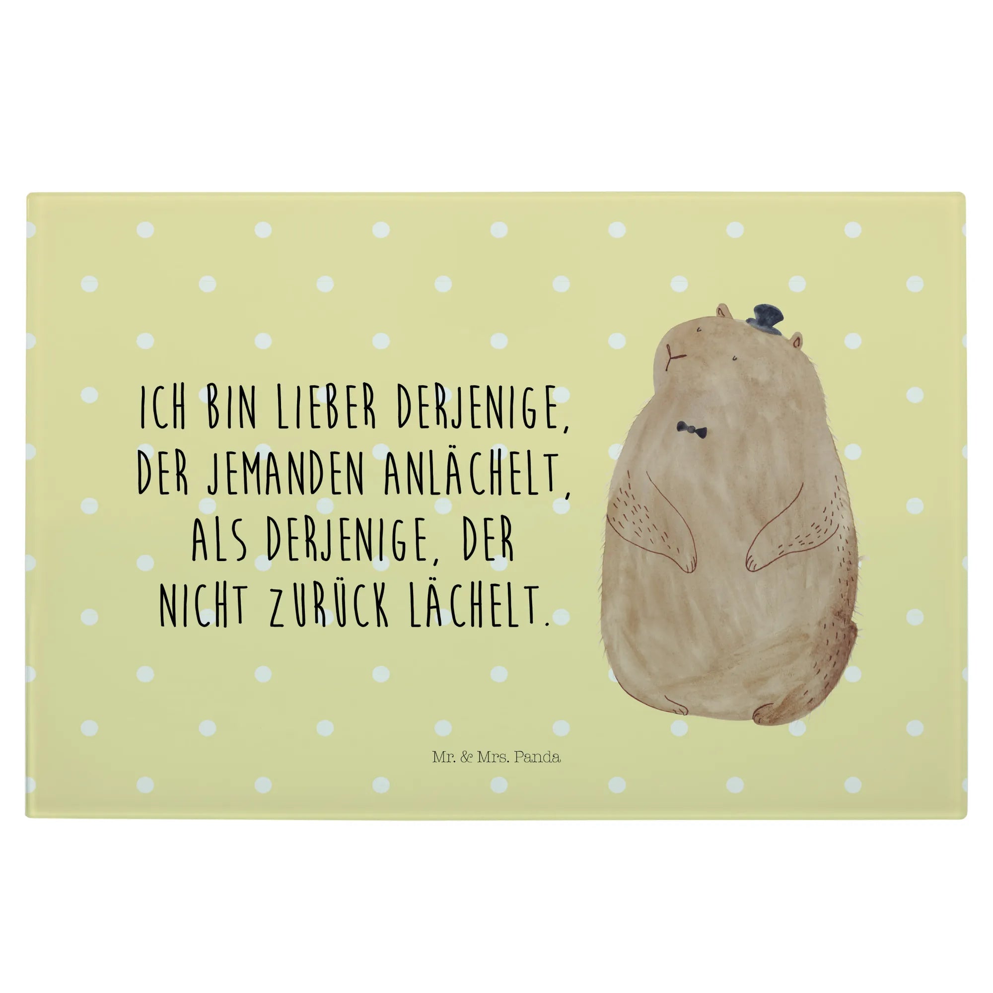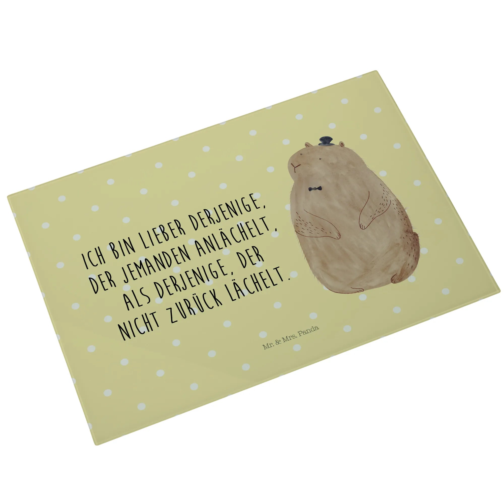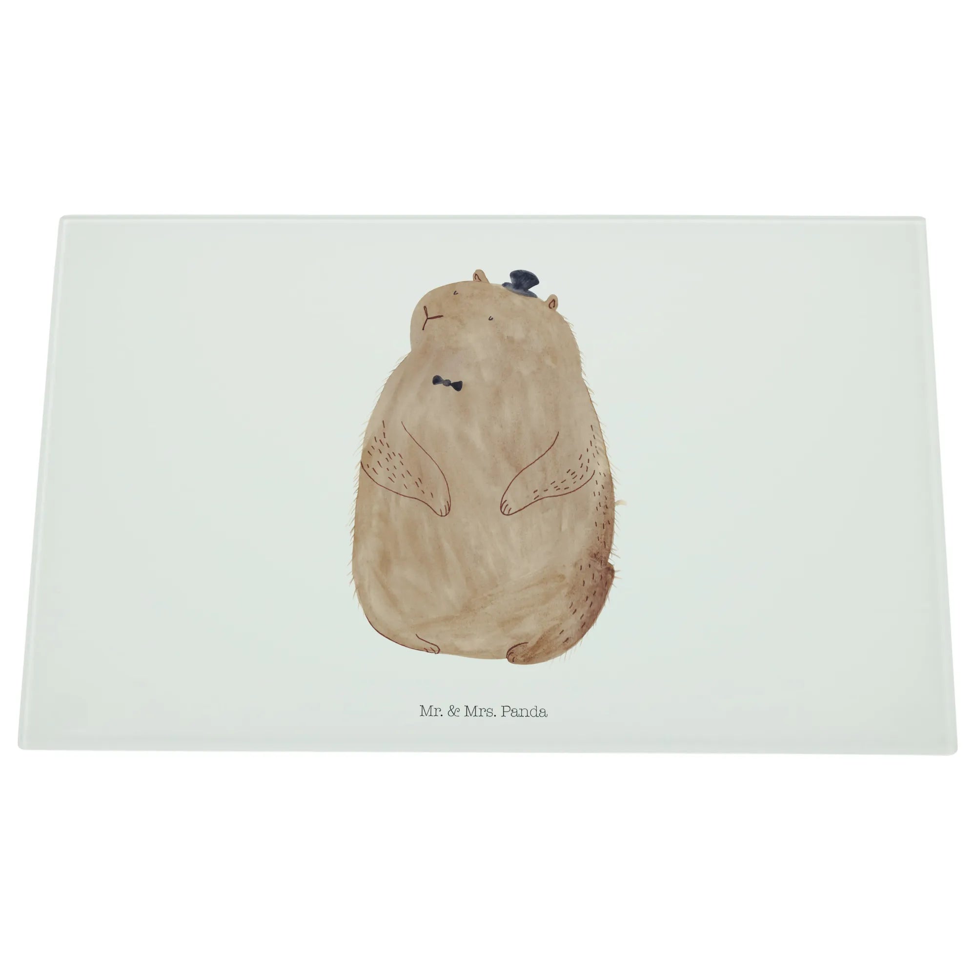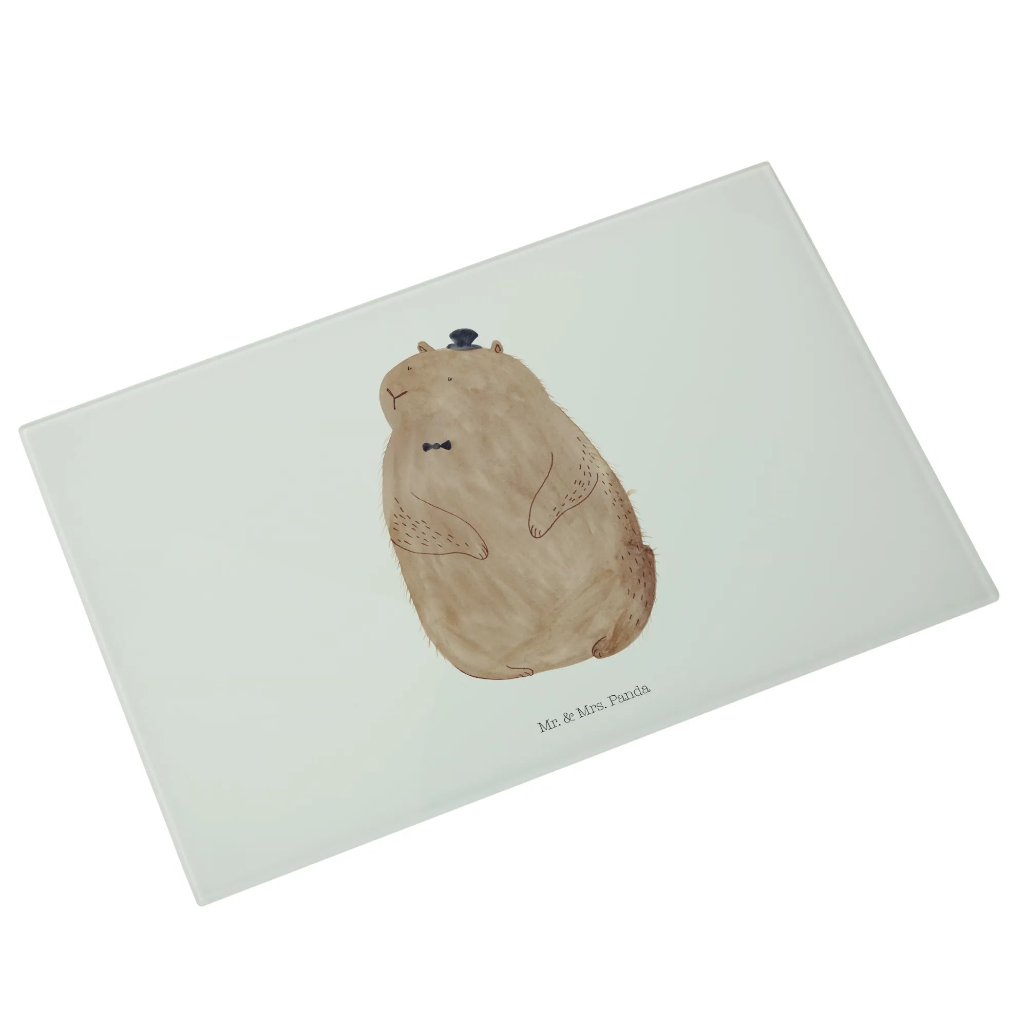 Das Medium Glas Schneidbrett mit dem fröhlichen Murmeltier-Motiv von Mr. & Mrs. Panda ist mehr als nur ein praktisches Küchenutensil. Es ist ein Stück Lebensfreude, dass beim Kochen und Vorbereiten von leckeren Speisen gute Laune verbreitet. Mit einer Größe von 284 mm x 200 mm ist dieses Schneidebrett ideal geeignet, um Gemüse, Obst oder Fleisch zu schneiden. Das süße Murmeltier, das einen Zylinder auf dem Kopf trägt, bringt nicht nur einen Hauch von Niedlichkeit in Deine Küche, sondern vermittelt auch eine Botschaft der Freundlichkeit und des Respekts.