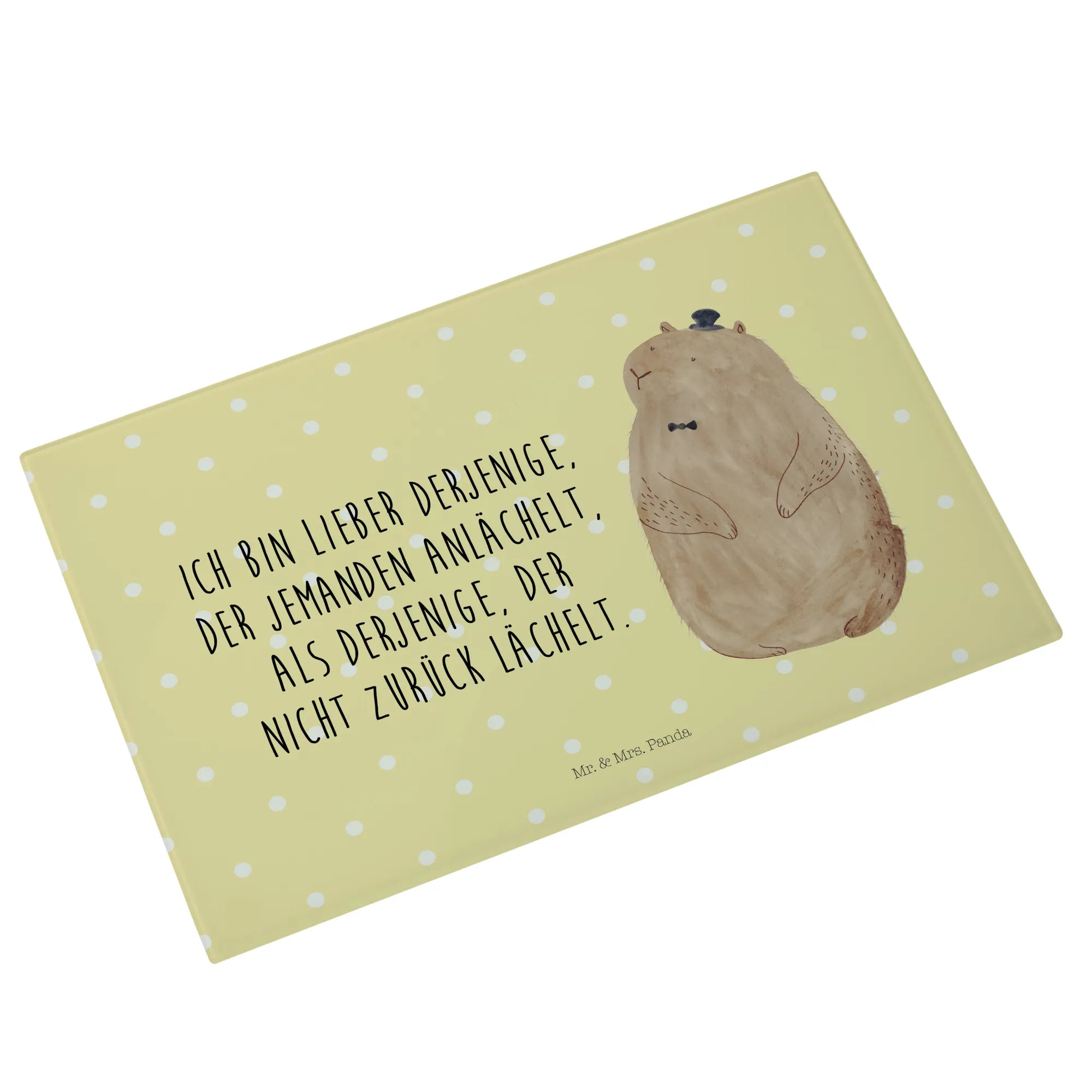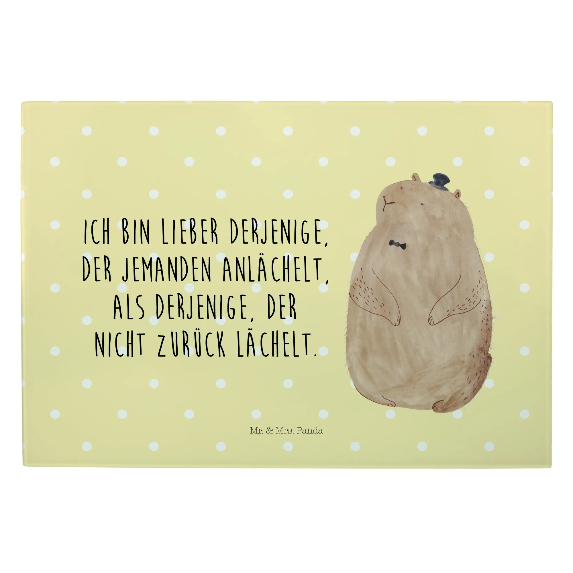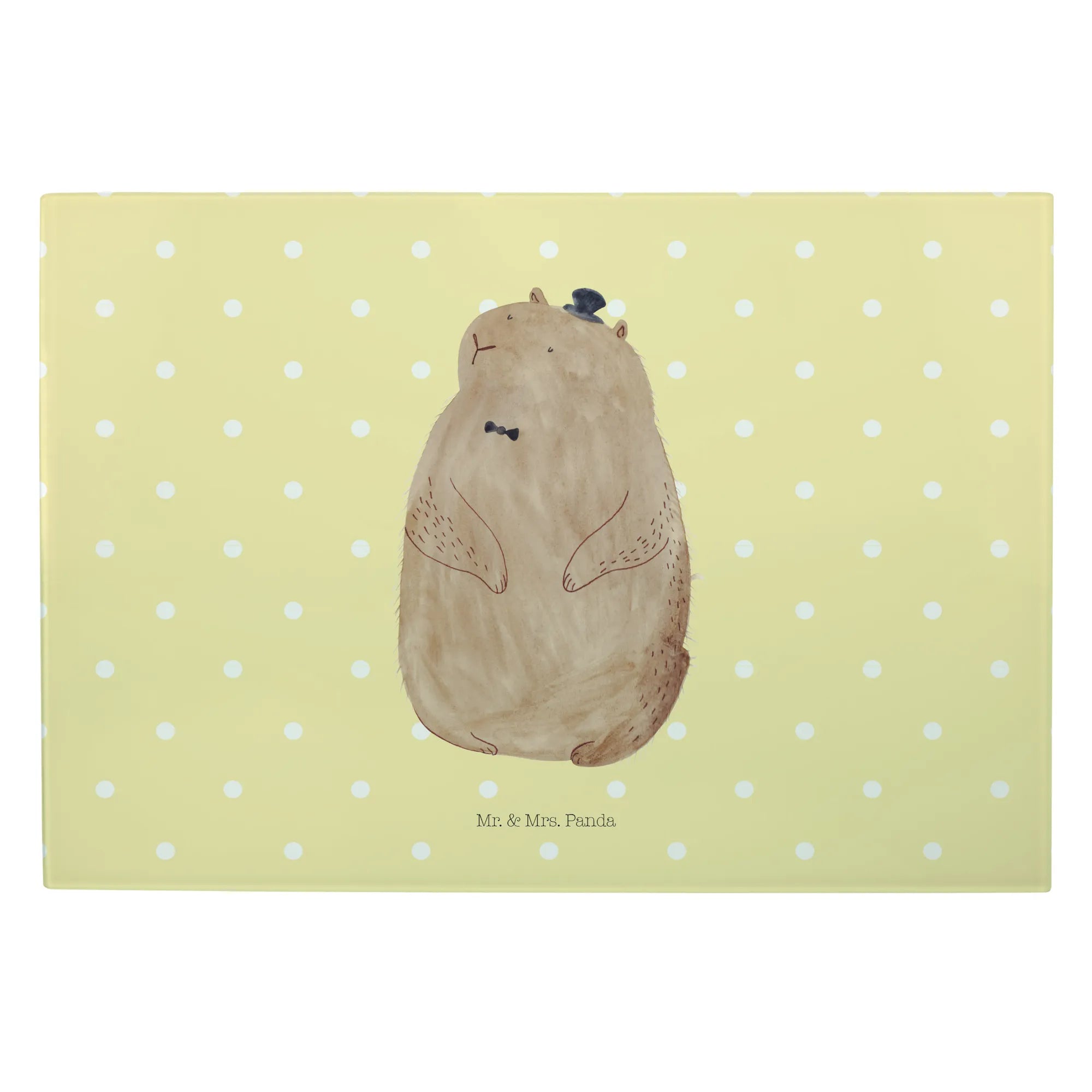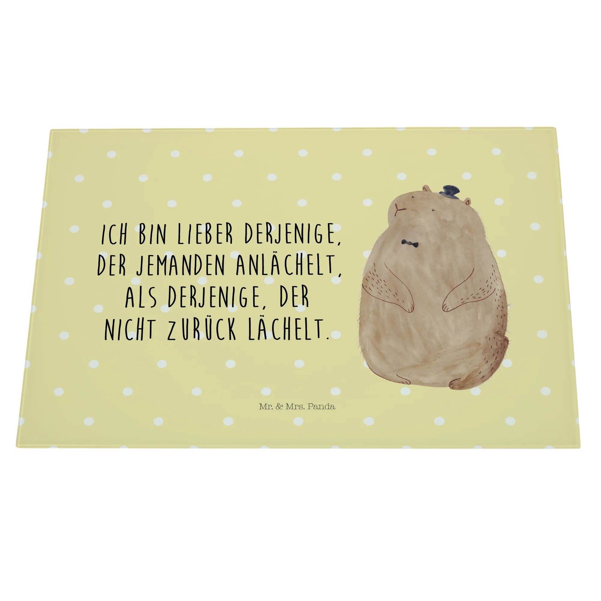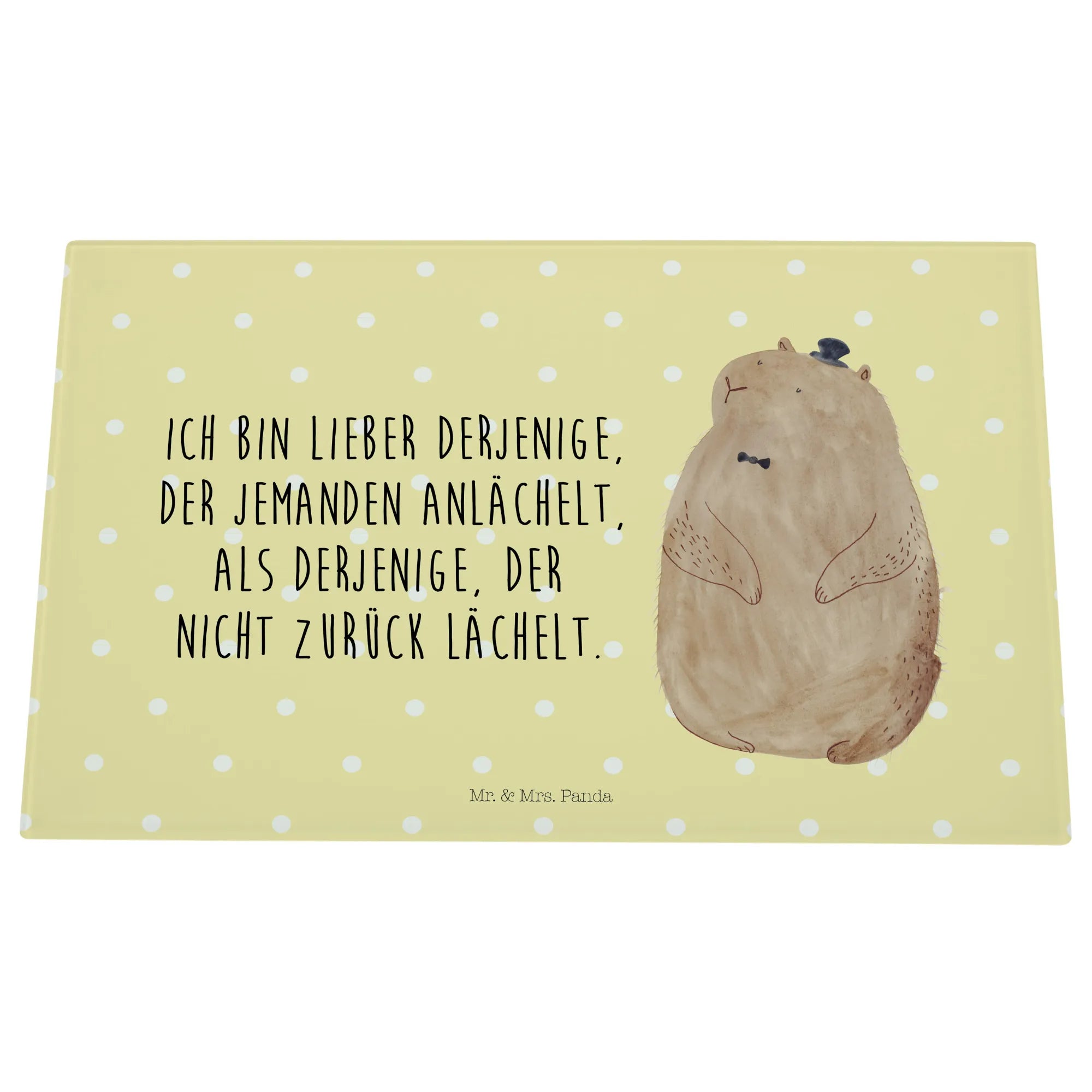 Das Medium Glas Schneidbrett mit dem fröhlichen Murmeltier-Motiv von Mr. & Mrs. Panda ist mehr als nur ein praktisches Küchenutensil. Es ist ein Stück Lebensfreude, dass beim Kochen und Vorbereiten von leckeren Speisen gute Laune verbreitet. Mit einer Größe von 284 mm x 200 mm ist dieses Schneidebrett ideal geeignet, um Gemüse, Obst oder Fleisch zu schneiden. Das süße Murmeltier, das einen Zylinder auf dem Kopf trägt, bringt nicht nur einen Hauch von Niedlichkeit in Deine Küche, sondern vermittelt auch eine Botschaft der Freundlichkeit und des Respekts.