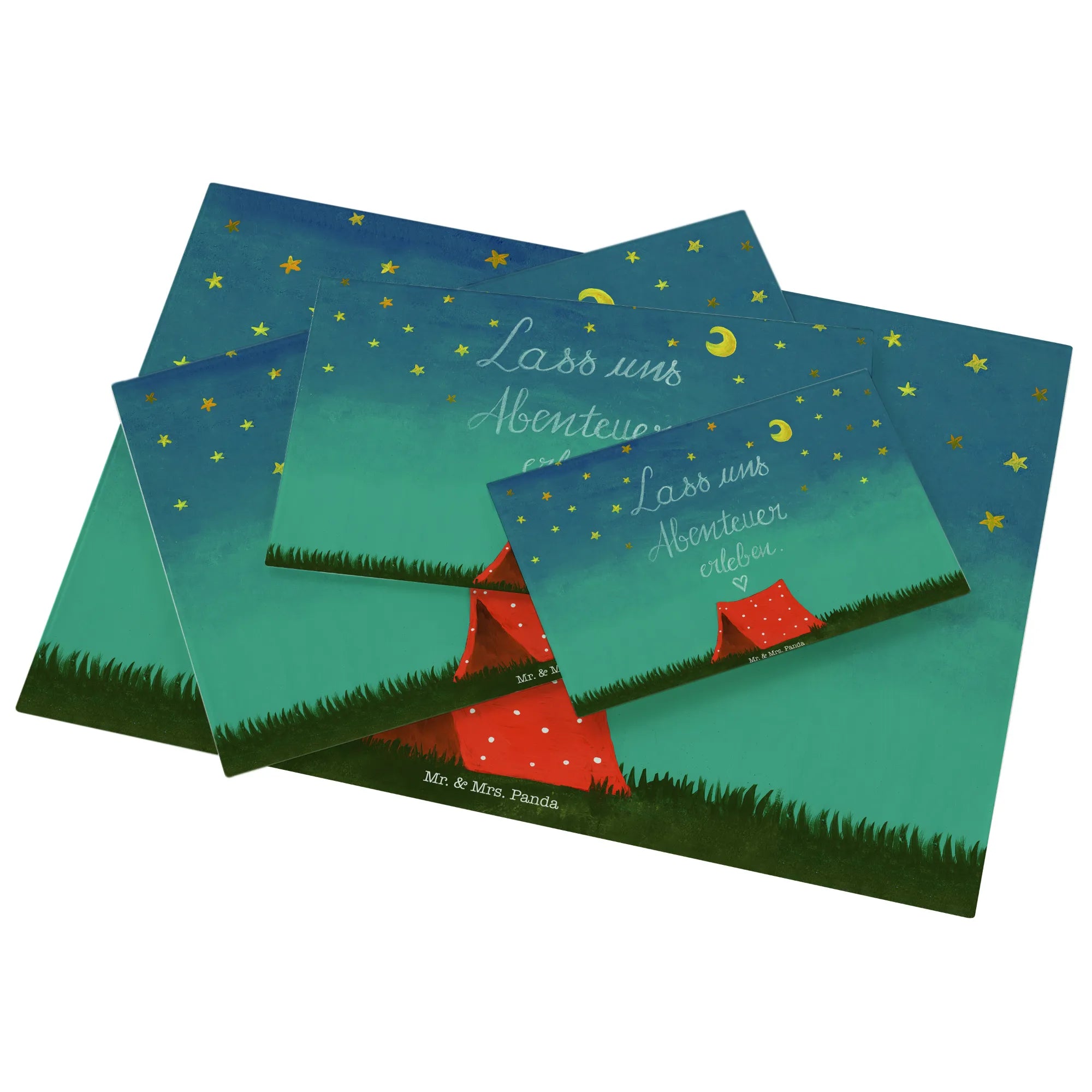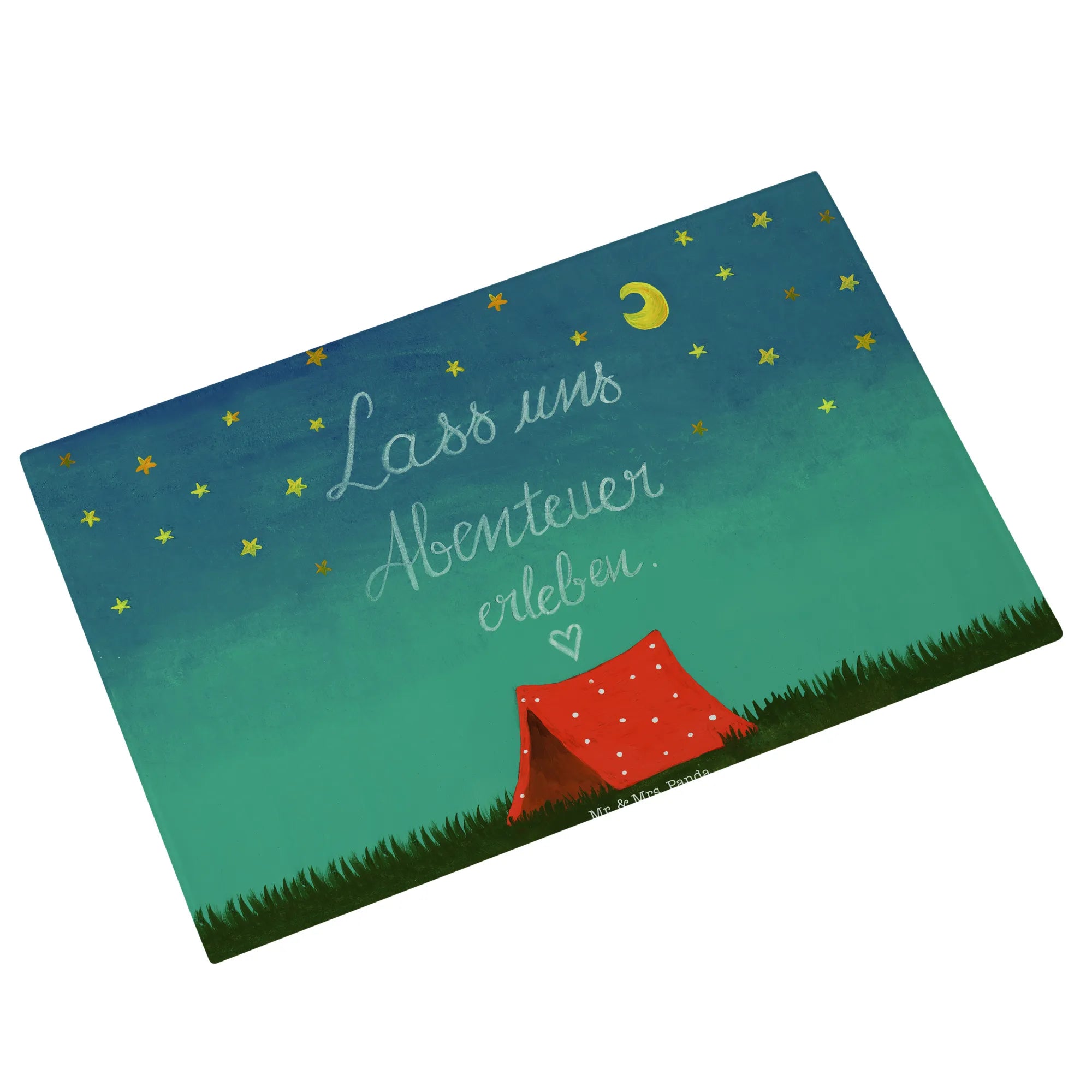 Mr. & Mrs. Panda Medium Glas Schneidebrett „Abenteuer“ – Ein zauberhaftes, handgezeichnetes Motiv aus der Collection Wild & Free, das Fernweh und Zusammenhalt in deine Küche bringt. Das Motiv zeigt die Lust auf Aufbruch und trägt den liebevollen Slogan „Lass uns Abenteuer erleben!“. Ein perfektes Geschenk für Naturliebhaber, Camper, Backpacker oder Paare, die das Draußen lieben. 🌿