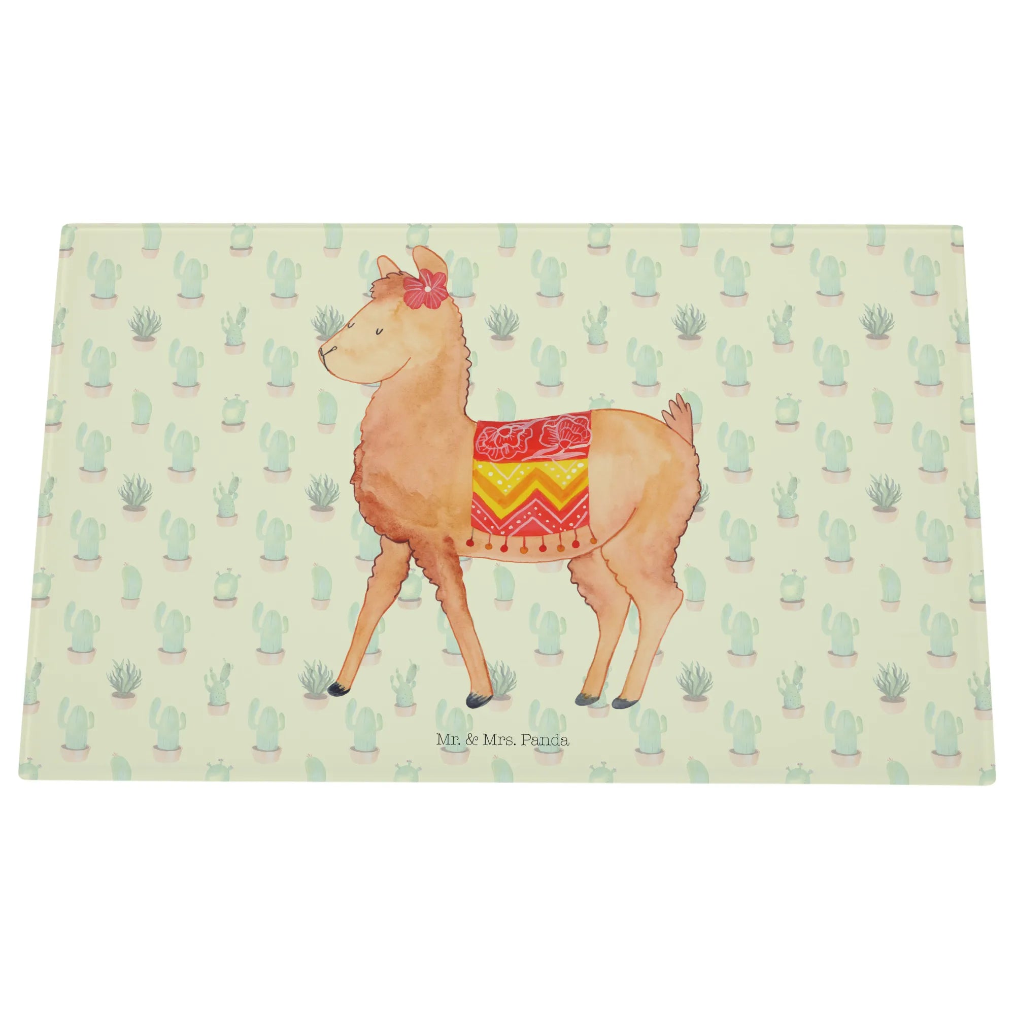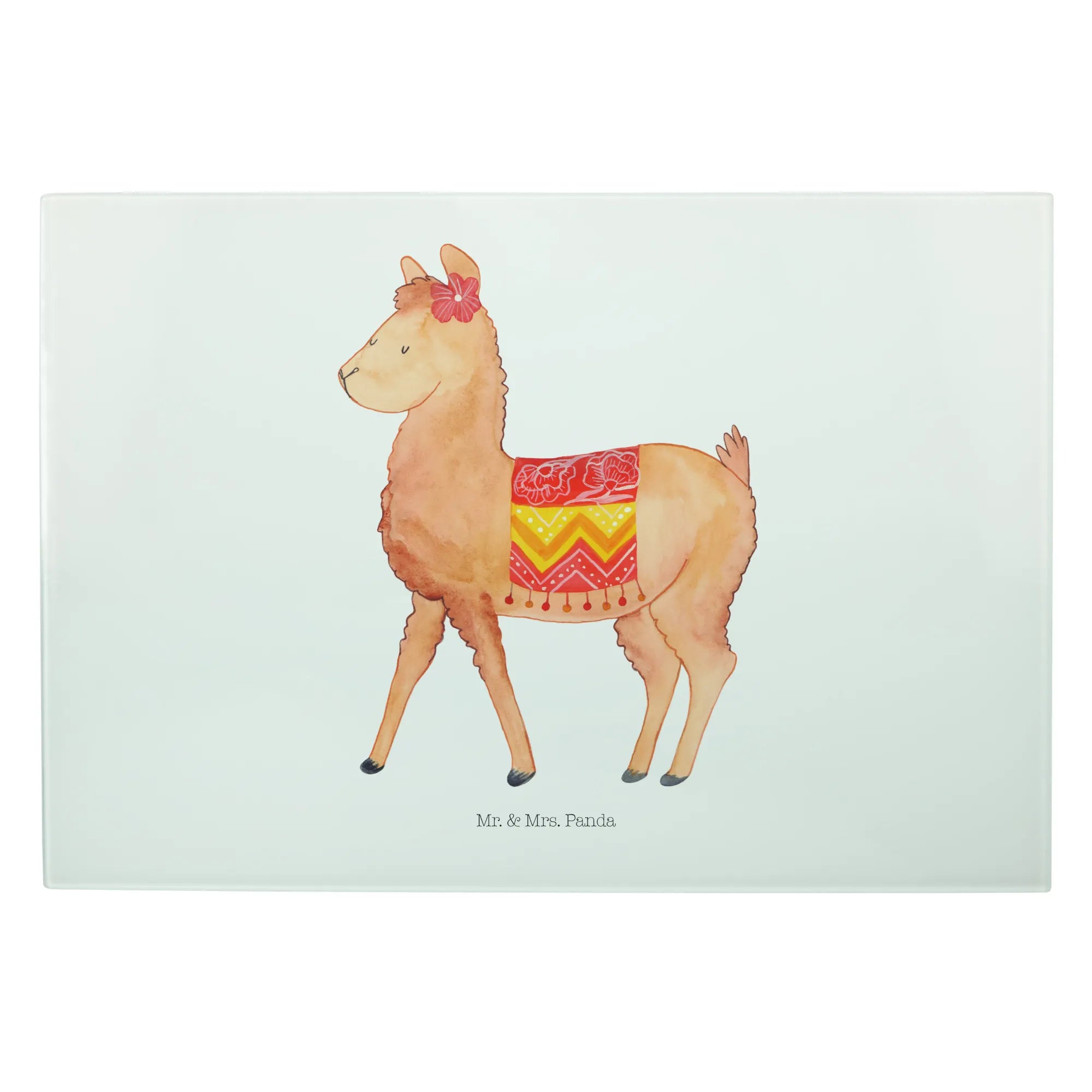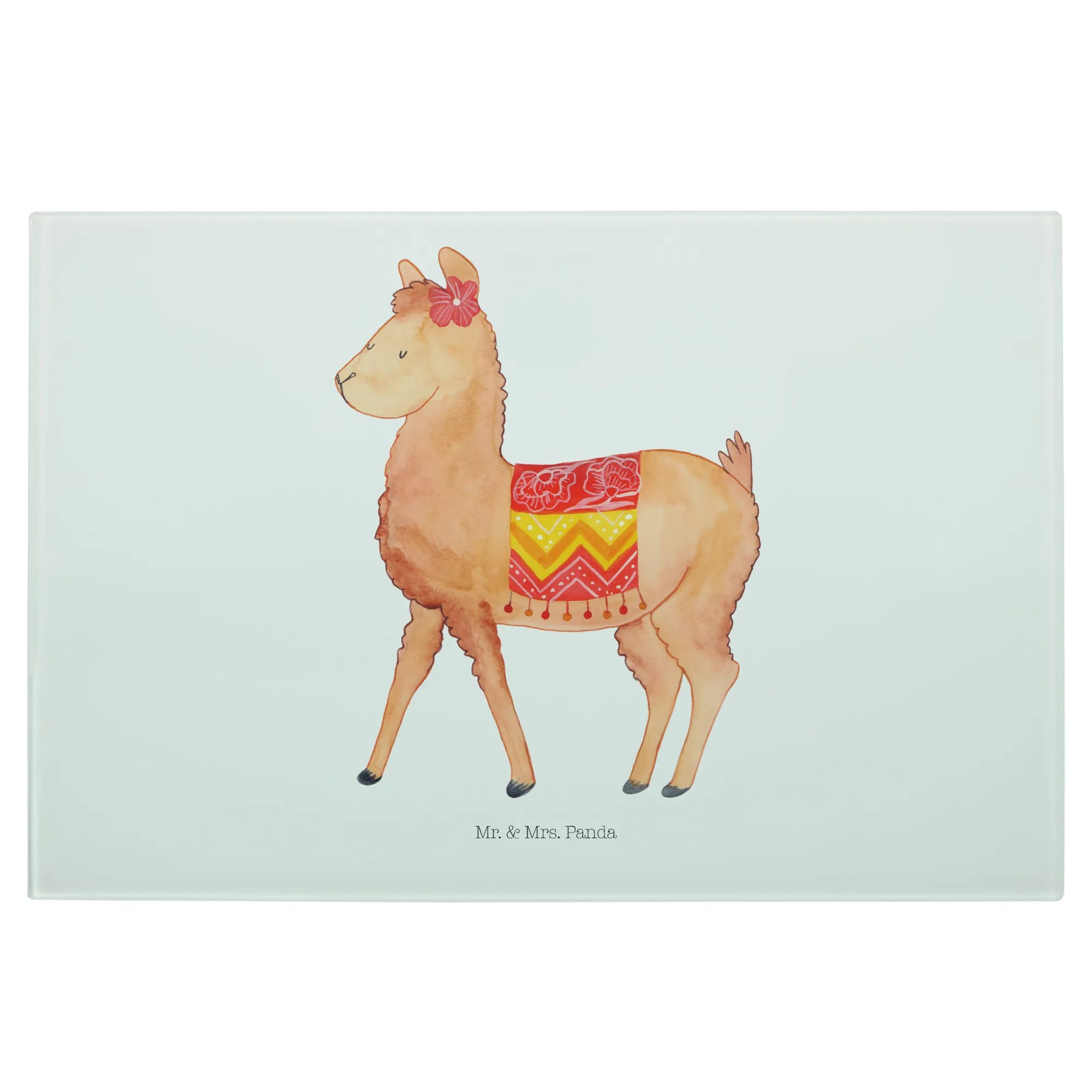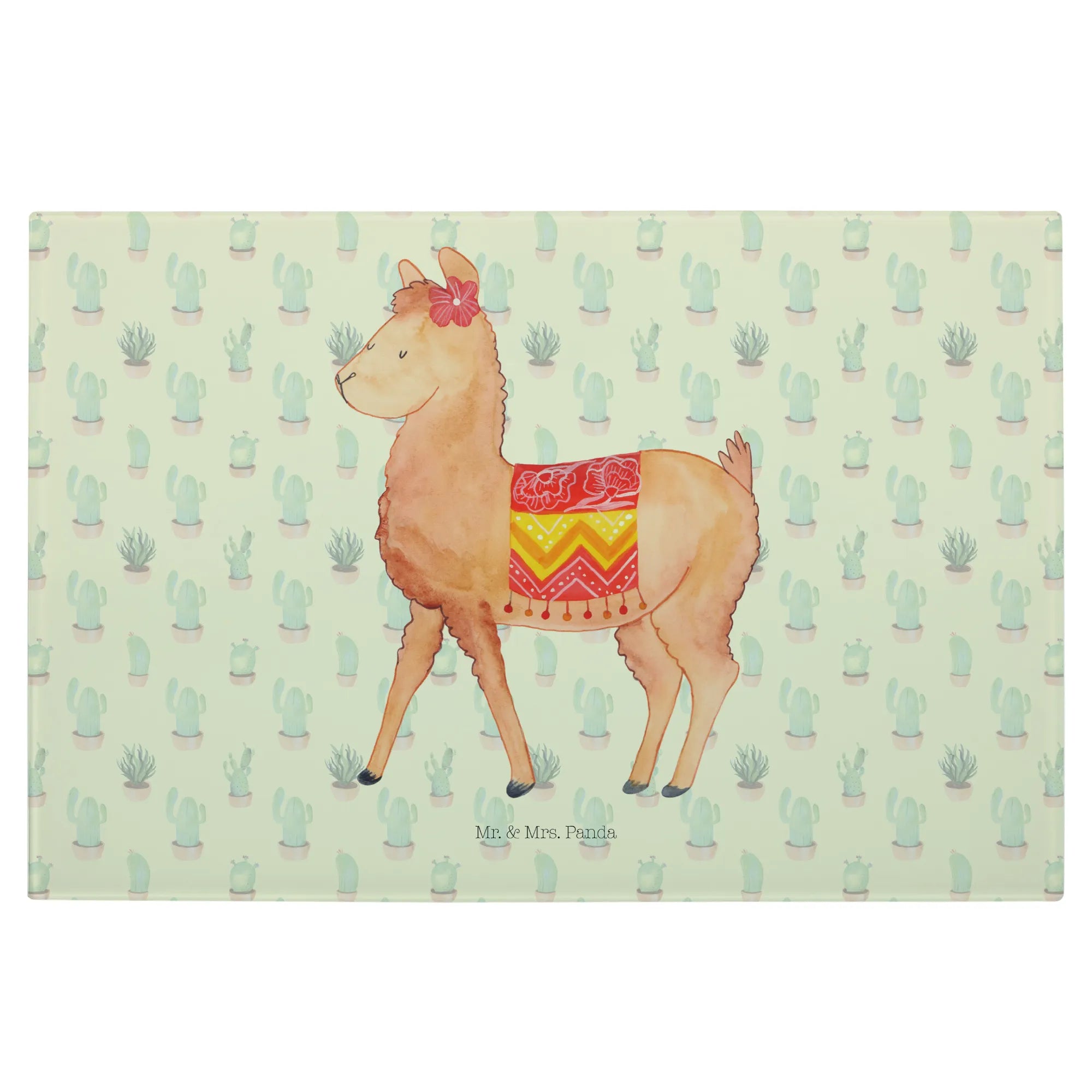 Das XL Glas Schneidbrett "Alpaka stolz" von Mr. & Mrs. Panda ist das perfekte Geschenk für alle Kochliebhaber und Kunstfreunde!