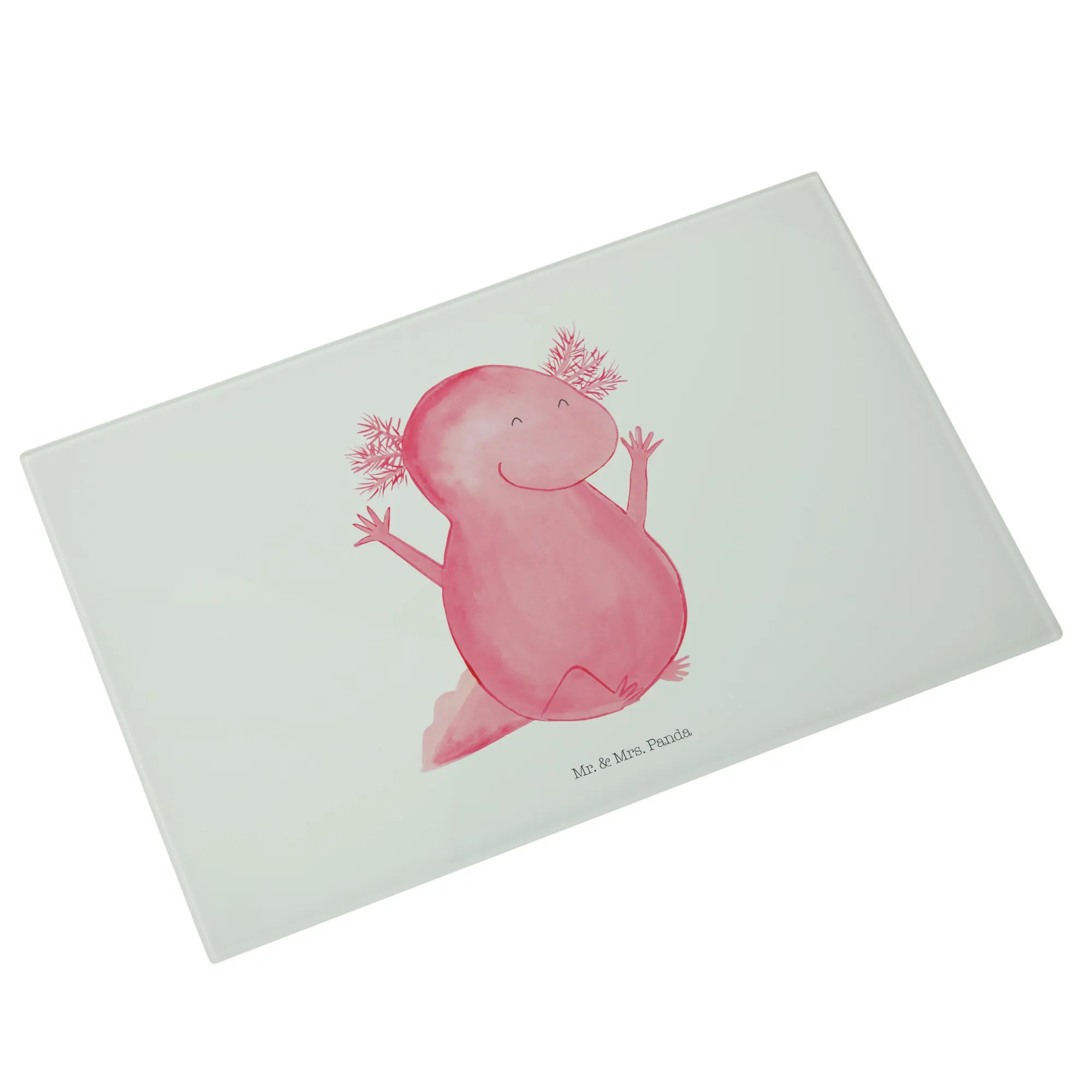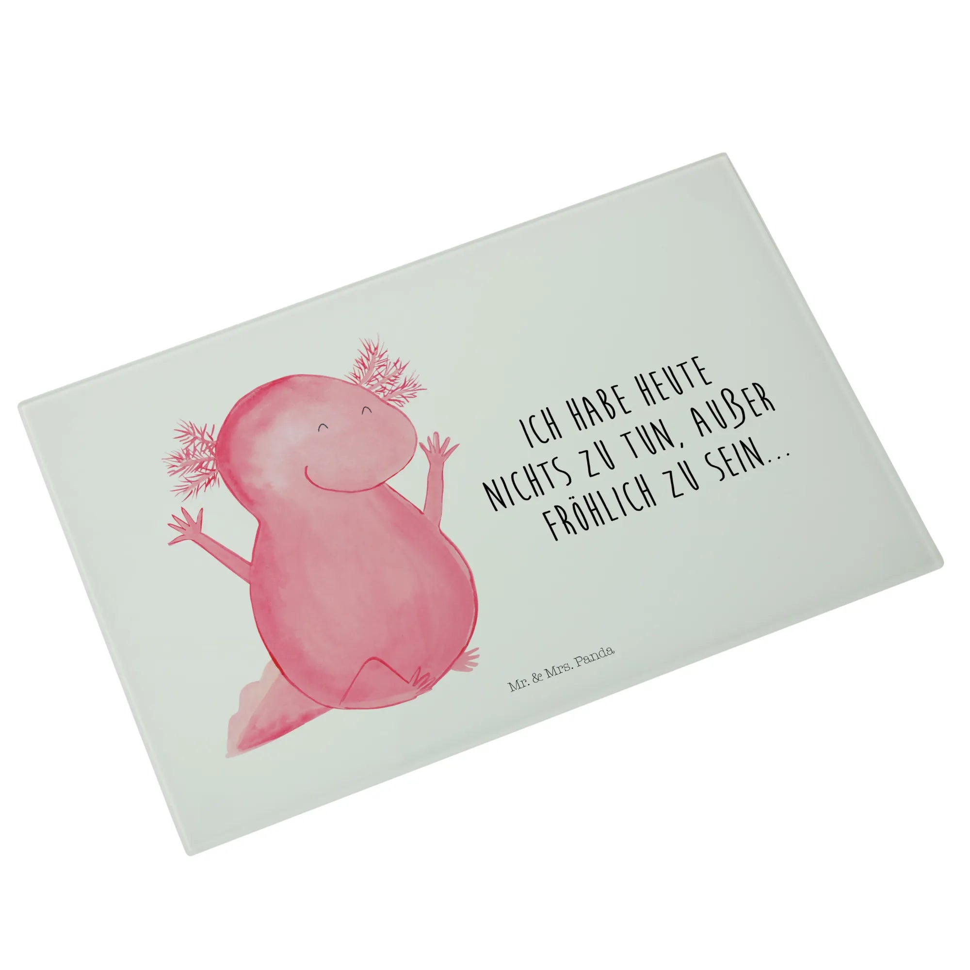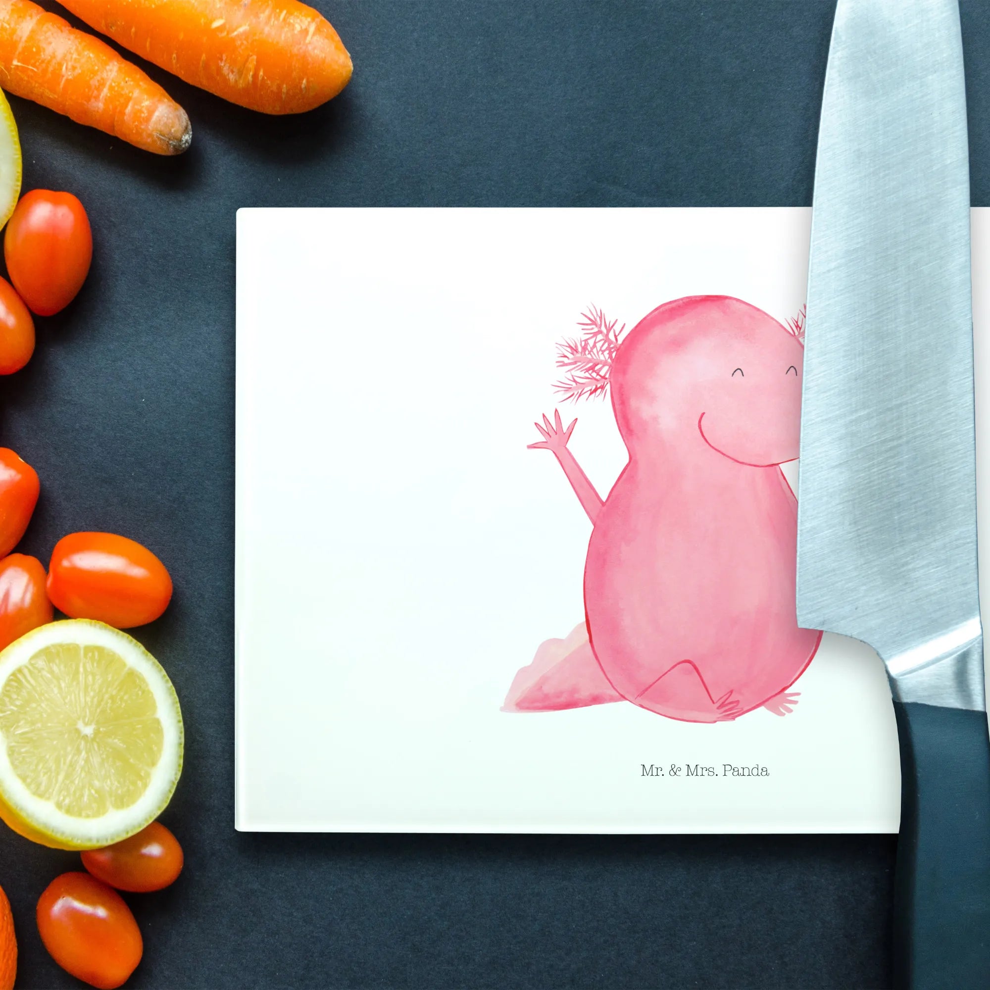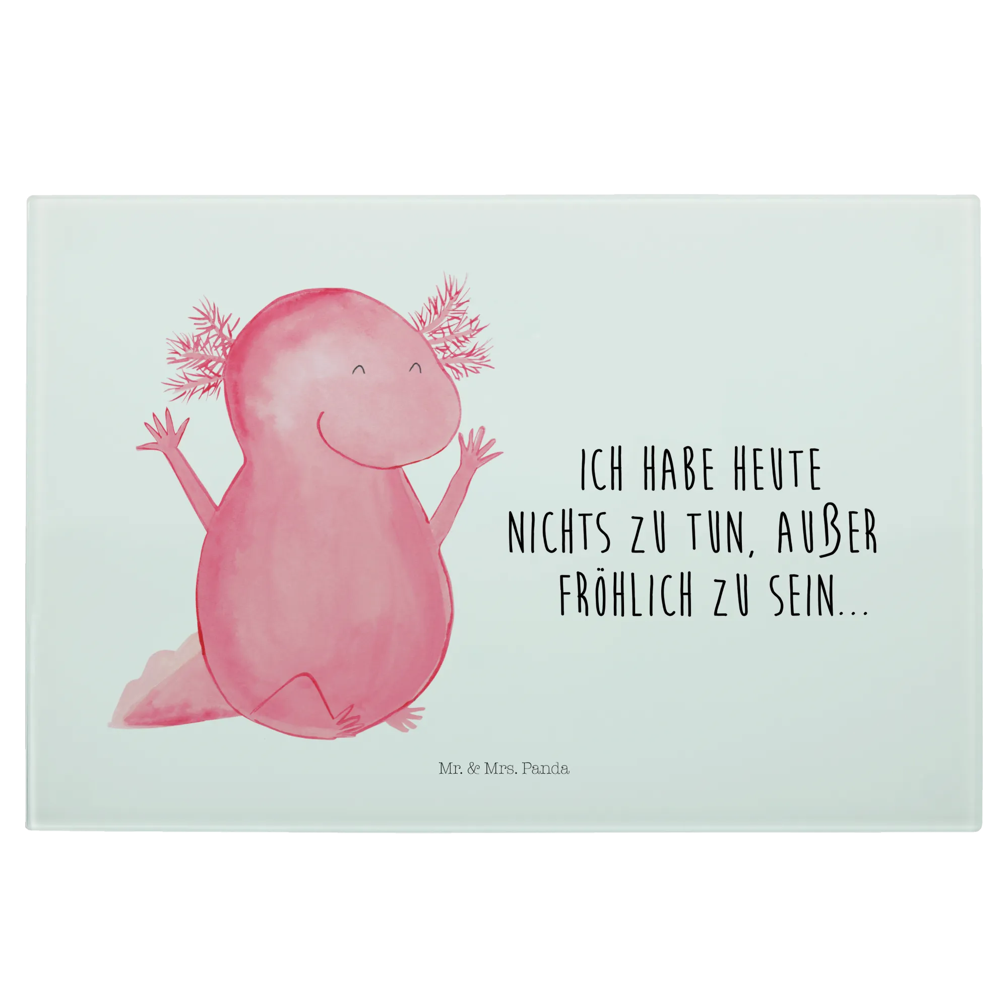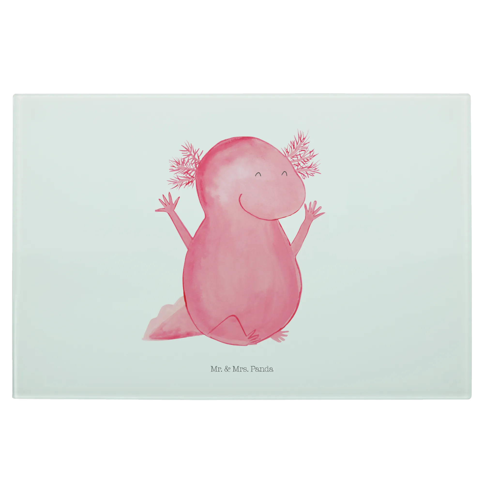 Das Medium Glas Schneidbrett "Axolotl Hurra" von Mr. & Mrs. Panda ist der perfekte Begleiter für alle, die Freude am Kochen und Zubereiten von leckeren Speisen haben. Mit seinen fröhlichen Motiven und dem leuchtenden türkis-blauen Axolotl, der seine Arme voller Lebensfreude in die Höhe reißt, bringt dieses Schneidebrett eine ganz besondere Stimmung in deine Küche. Es ist nicht nur funktional, sondern auch ein richtiger Hingucker!