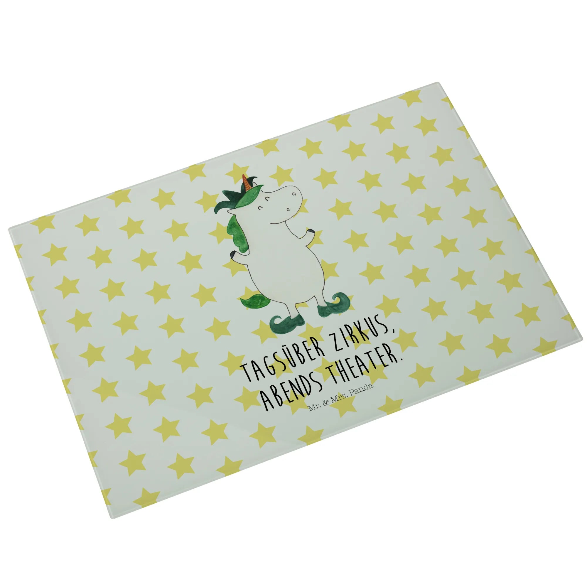 Du liebst Einhörner und die zauberhafte Welt, die sie umgibt? Dann ist das XL Glas Schneidbrett Einhorn Joker aus der exklusiven Einhorn-Kollektion von Mr. & Mrs. Panda genau das Richtige für dich! Mit einem niedlichen Einhorn, das als Hofnarr verkleidet ist, wird dieses Schneidbrett zum absoluten Blickfang in deiner Küche.