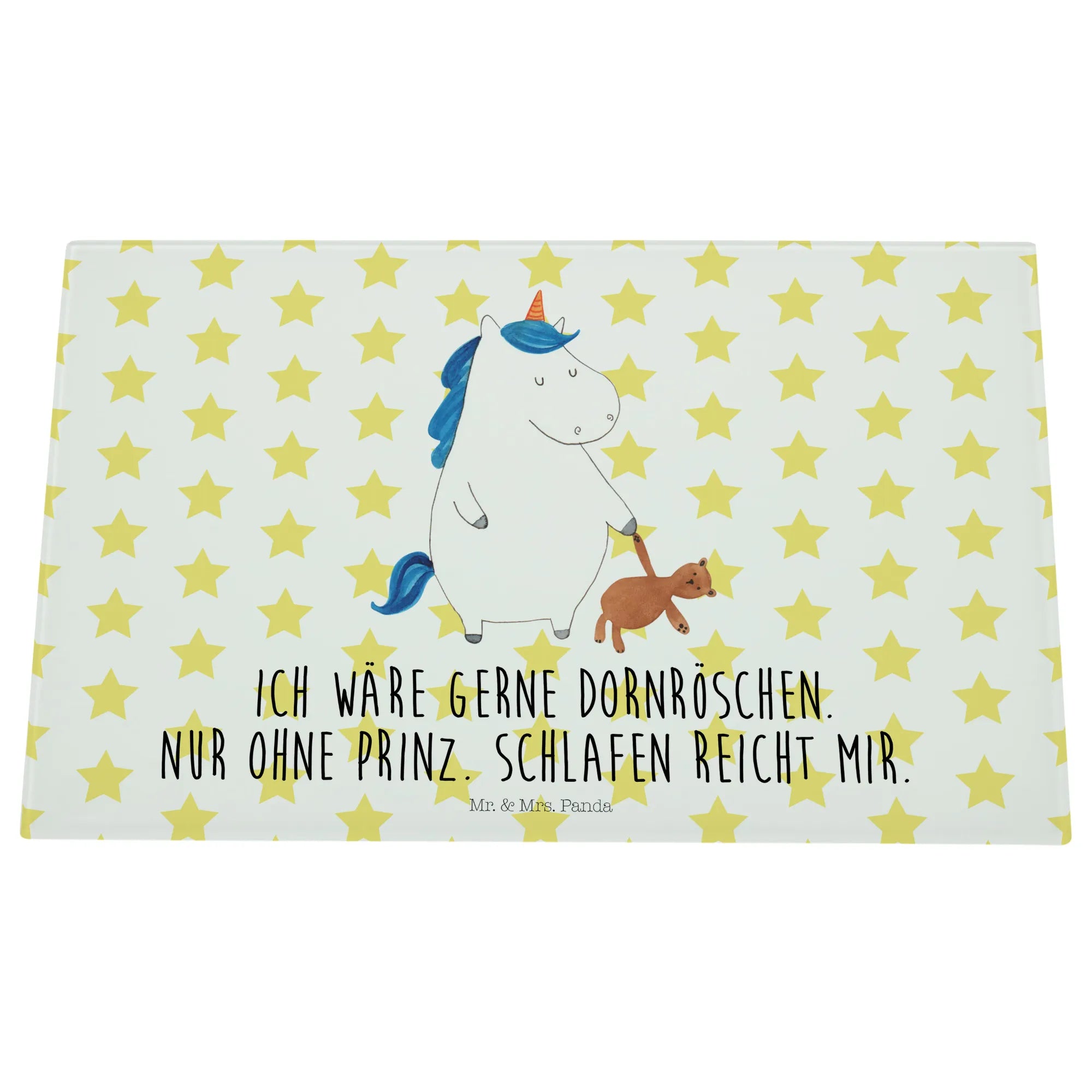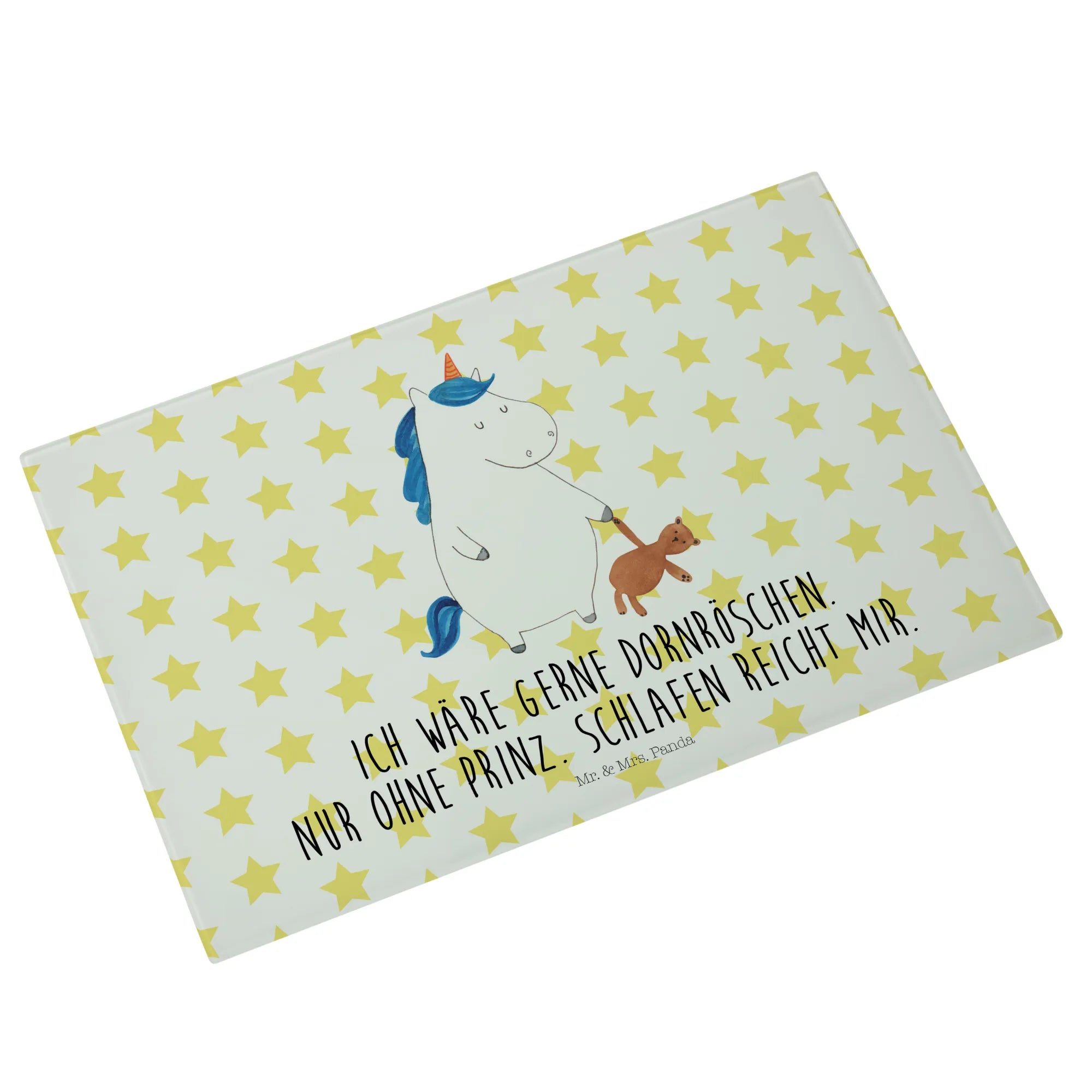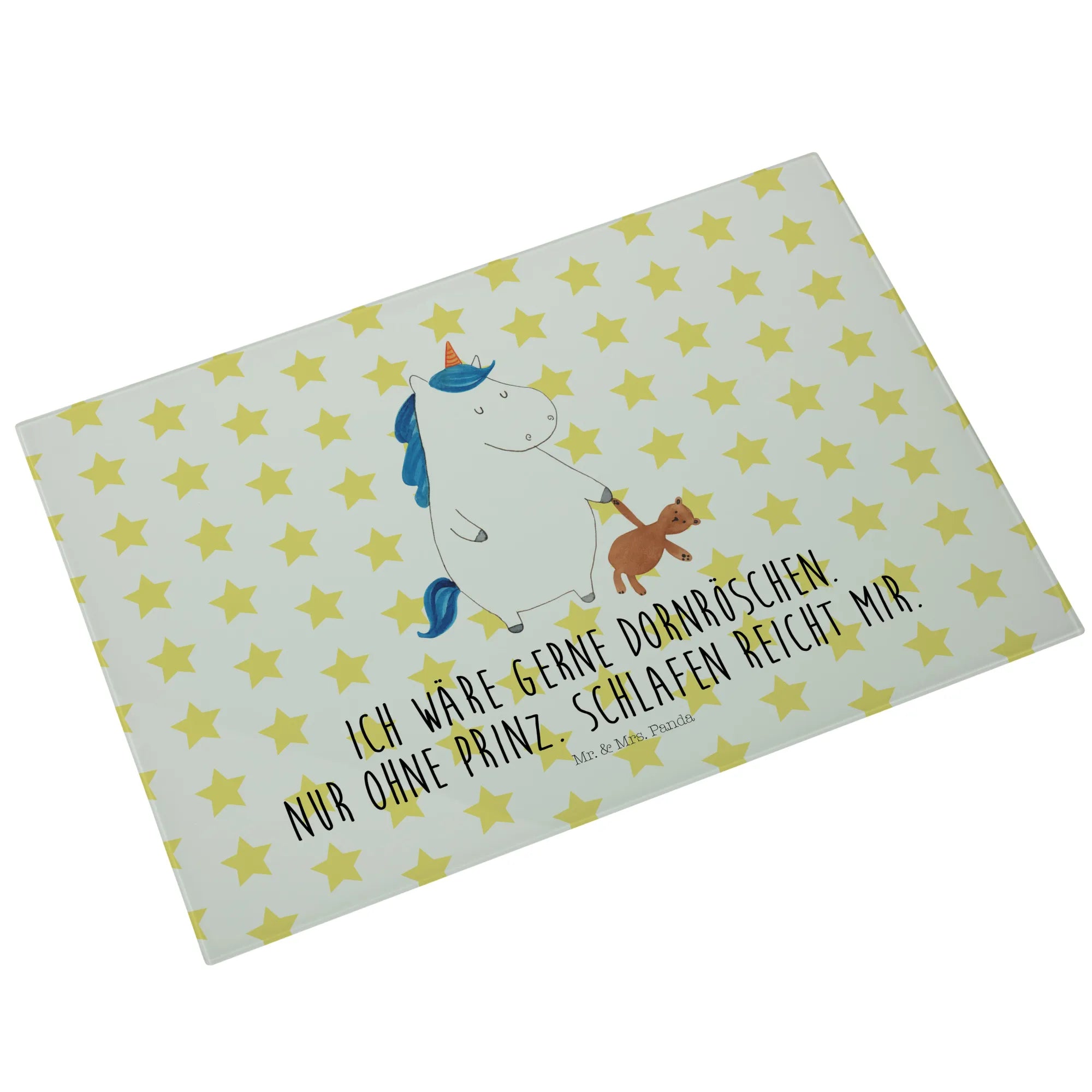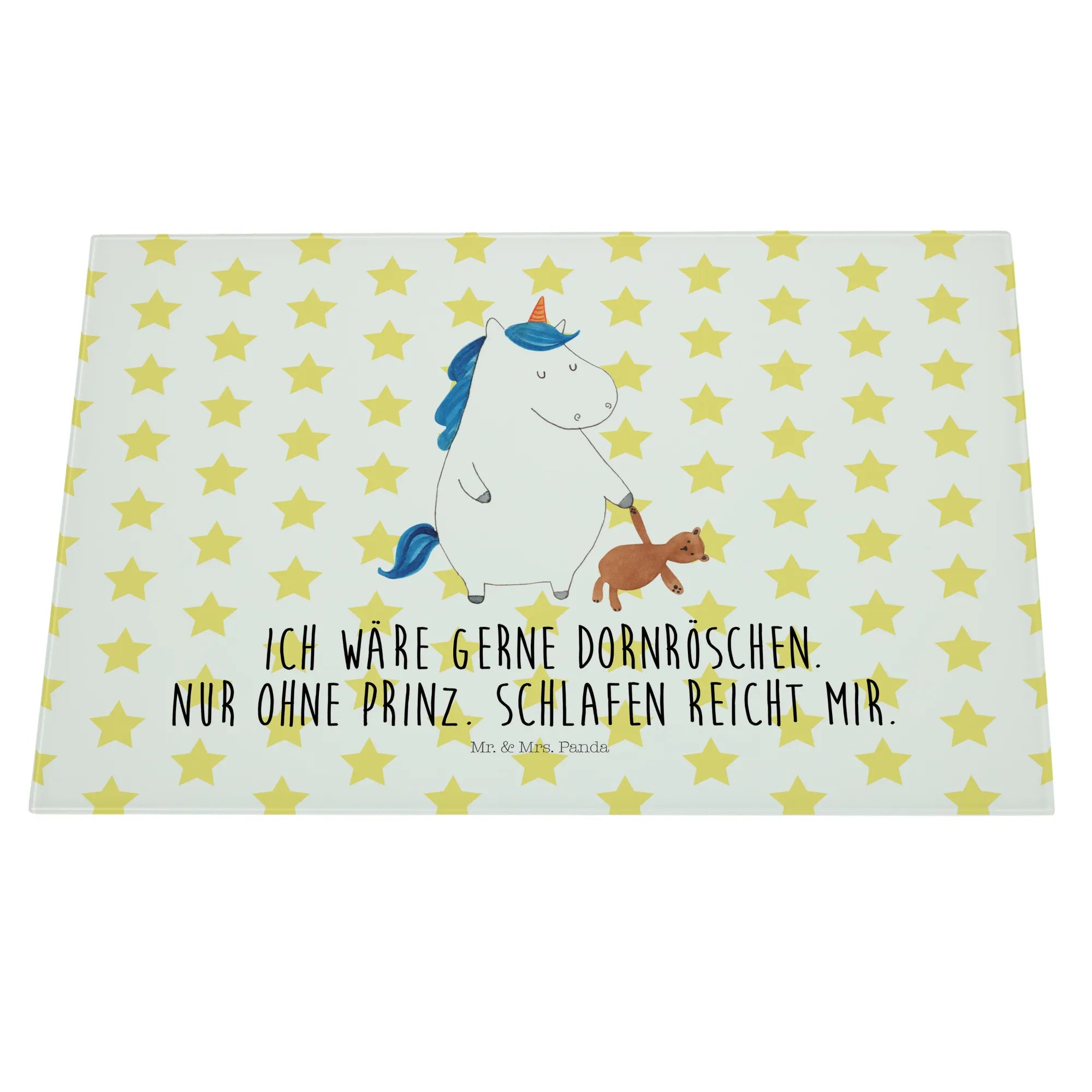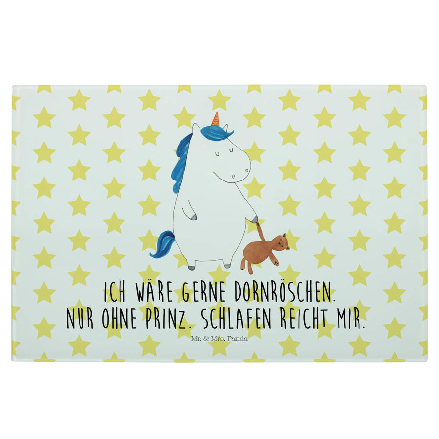Das XL Glas Schneidbrett Einhorn Teddy aus der Einhorn-Kollektion von Mr. & Mrs. Panda ist nicht nur ein praktisches Küchengerät, sondern auch ein zauberhaftes Deko-Element, das jeden Single-Haushalt aufpeppt! Dieses einzigartige und robuste Schneidebrett bringt Magie und Süße in deine Küche. Mit einem handgezeichneten Motiv, das ein verschlafenes Einhorn mit einem Teddy zeigt und dem liebevollen Slogan 'Ich wäre gerne Dornröschen. Nur ohne Prinz. Schlafen reicht mir.' lächelt es dir beim Kochen entgegen.