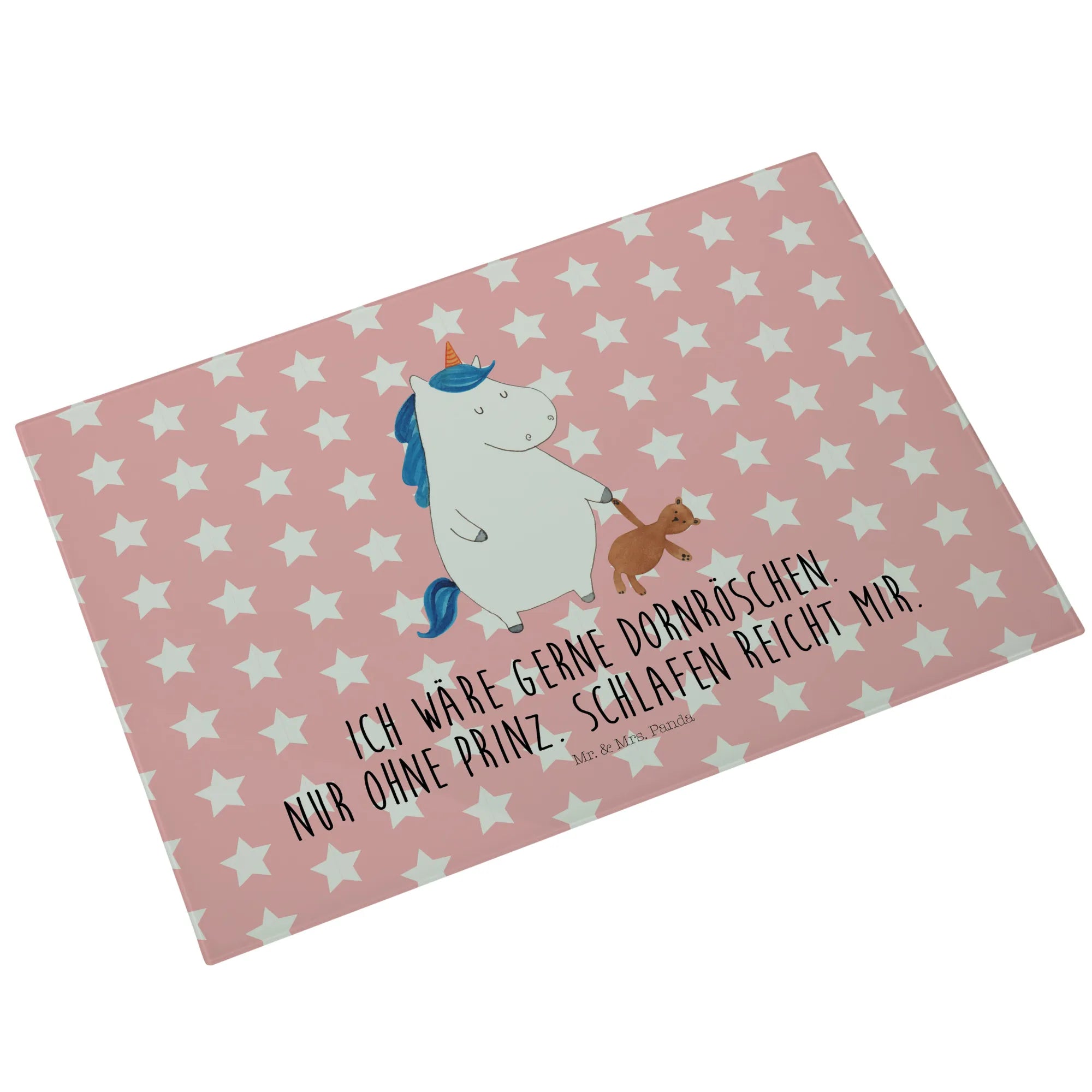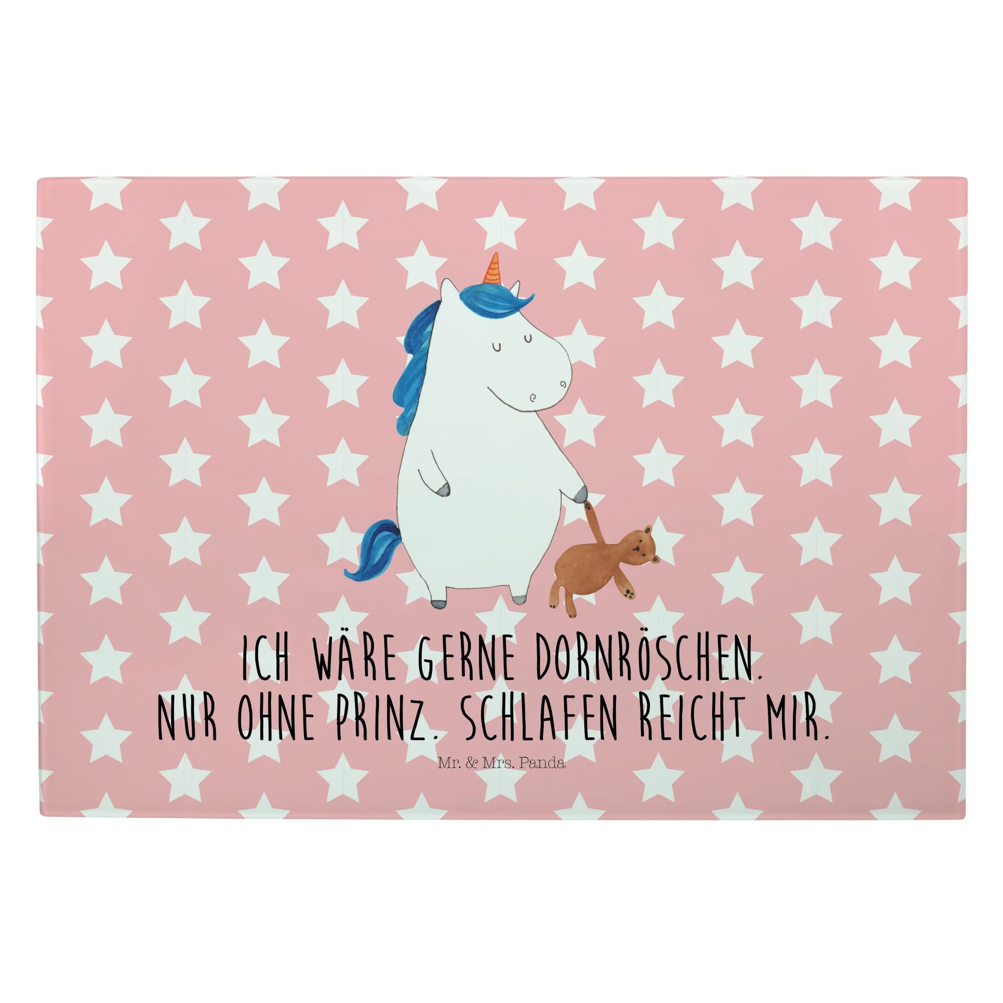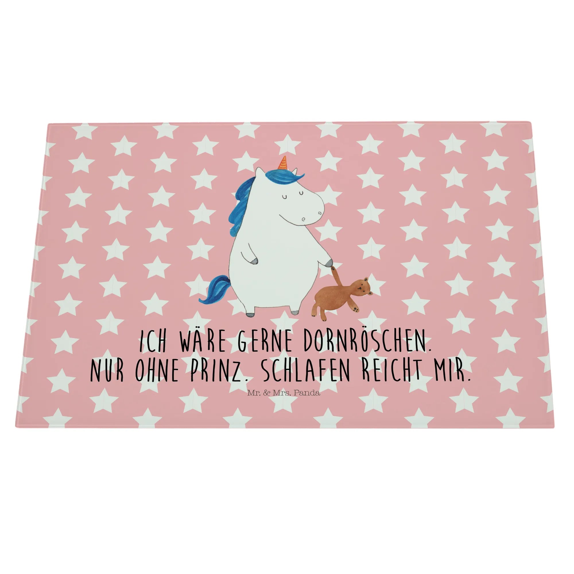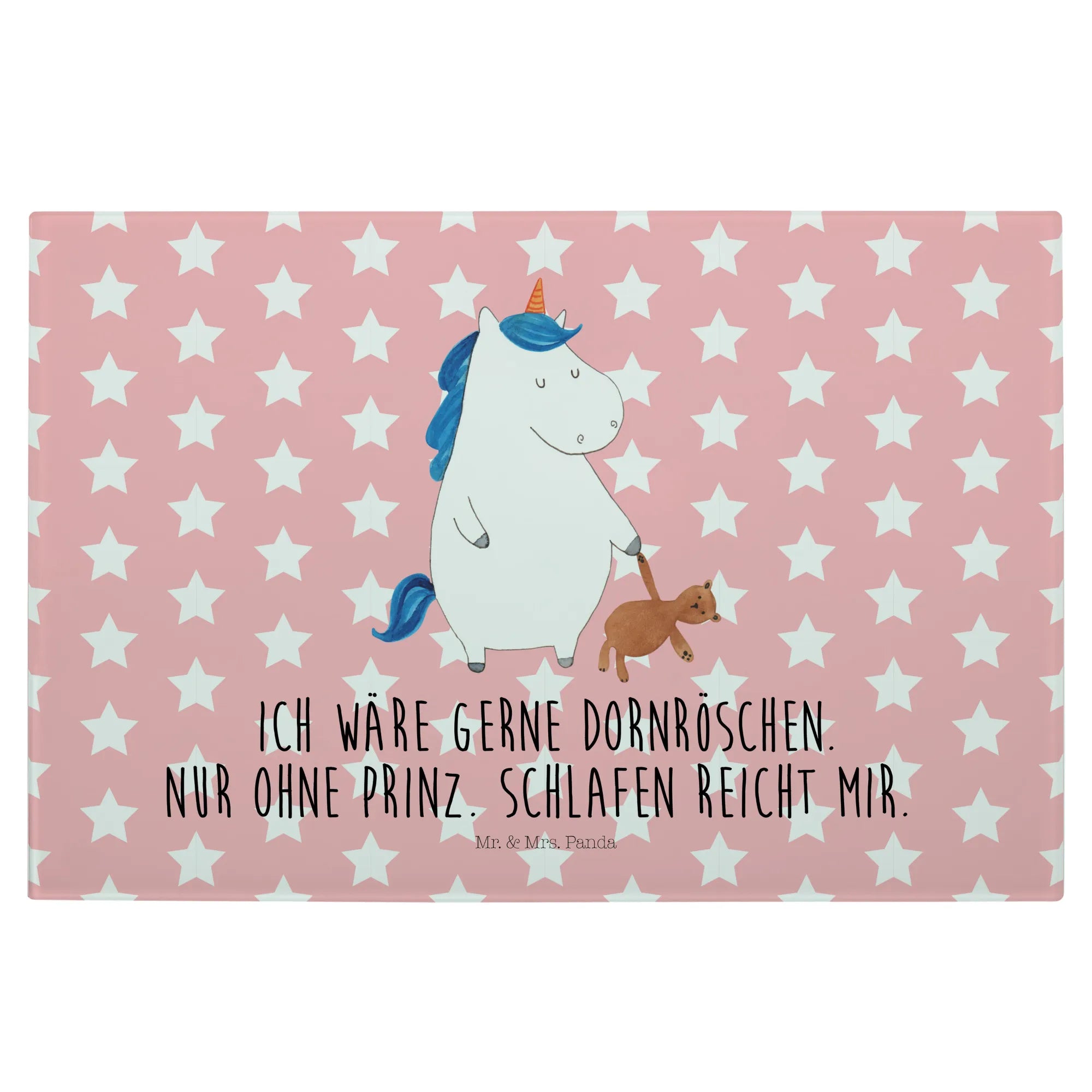 Das XL Glas Schneidbrett Einhorn Teddy aus der Einhorn-Kollektion von Mr. & Mrs. Panda ist nicht nur ein praktisches Küchengerät, sondern auch ein zauberhaftes Deko-Element, das jeden Single-Haushalt aufpeppt! Dieses einzigartige und robuste Schneidebrett bringt Magie und Süße in deine Küche. Mit einem handgezeichneten Motiv, das ein verschlafenes Einhorn mit einem Teddy zeigt und dem liebevollen Slogan 'Ich wäre gerne Dornröschen. Nur ohne Prinz. Schlafen reicht mir.' lächelt es dir beim Kochen entgegen.