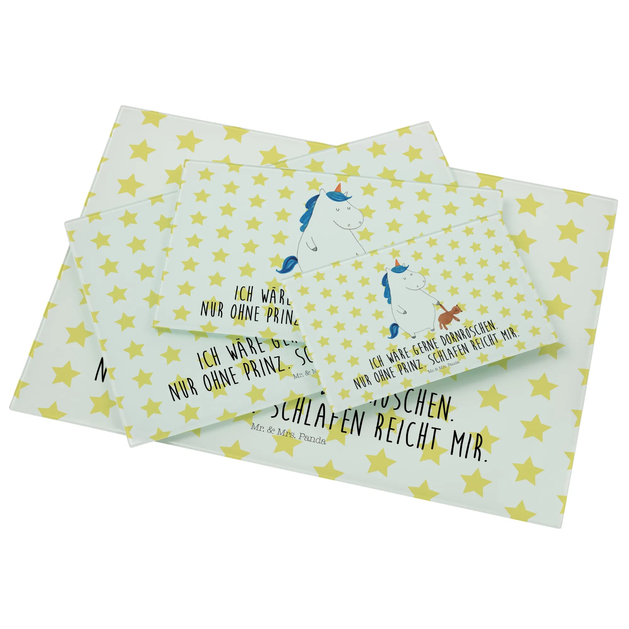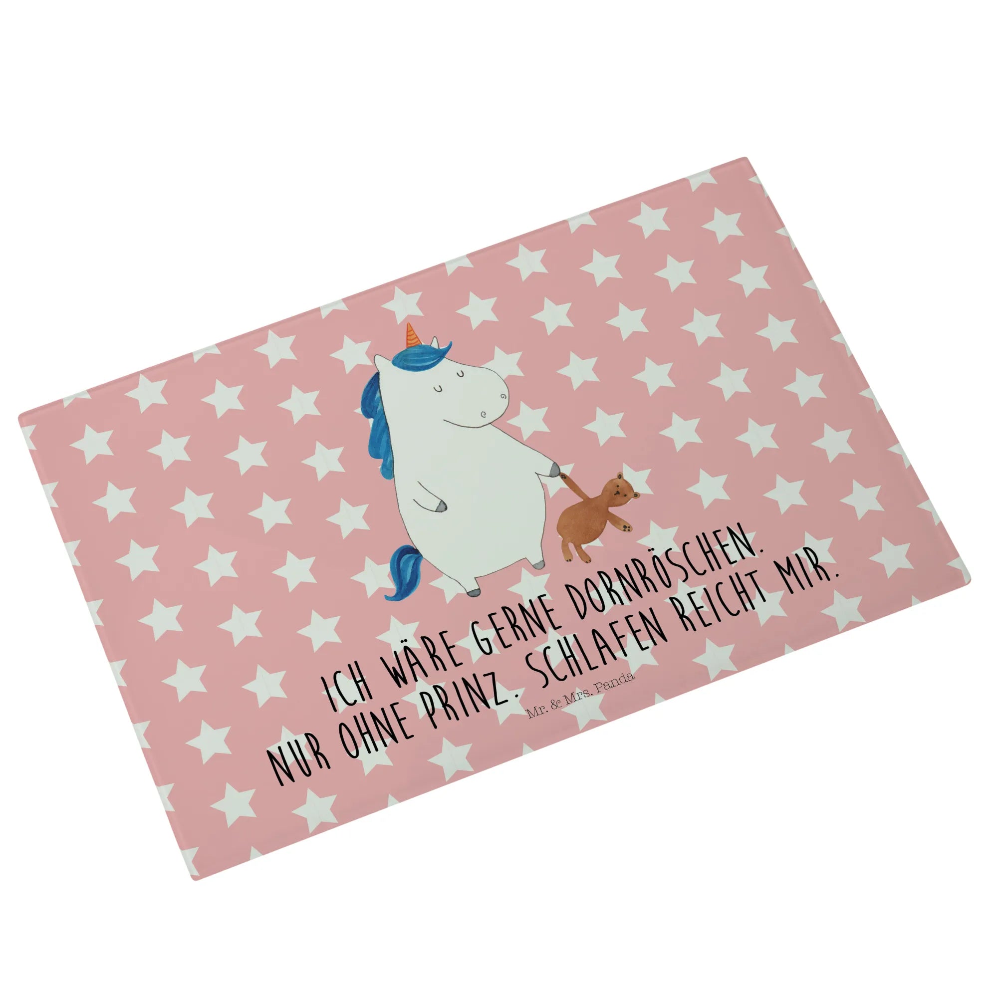 Das XL Glas Schneidbrett Einhorn Teddy aus der zauberhaften Einhorn-Kollektion von Mr. & Mrs. Panda ist das perfekte Geschenk für alle Einhorn-Liebhaber und Freunde süßer, liebevoll gestalteter Produkte. Mit seinen großzügigen Maßen von 389 mm x 284 mm x 4 mm ist es nicht nur praktisch für die Zubereitung von Speisen, sondern auch ein echtes Highlight in jeder Küche. Der entzückende Druck zeigt ein schlafendes Einhorn mit einem Teddybären in der Hand und wird durch den humorvollen Spruch 'Ich wäre gerne Dornröschen. Nur ohne Prinz. Schlafen reicht mir.' ergänzt.