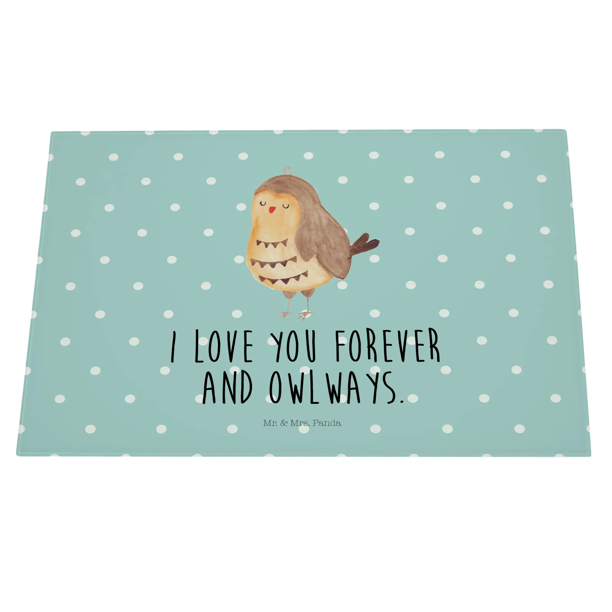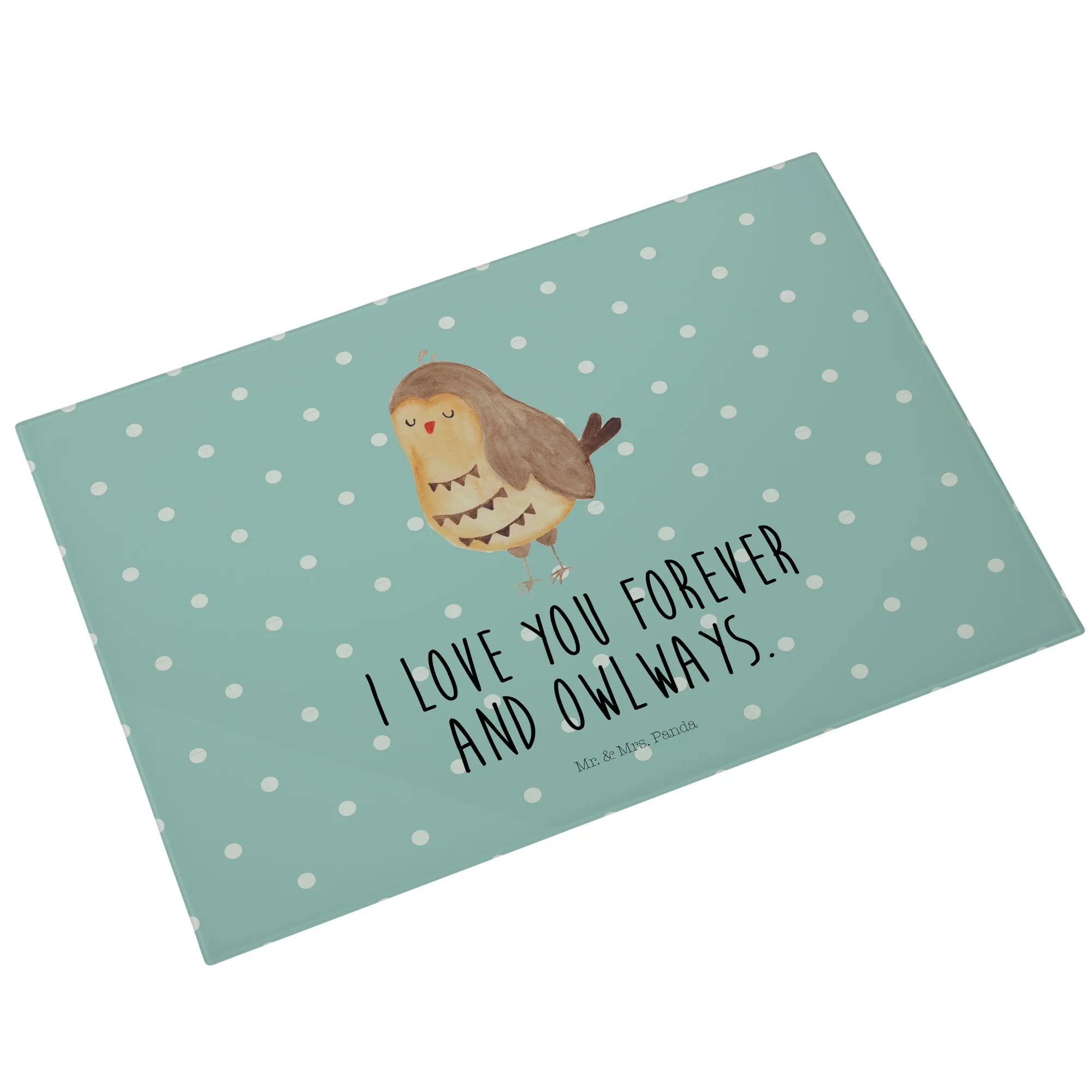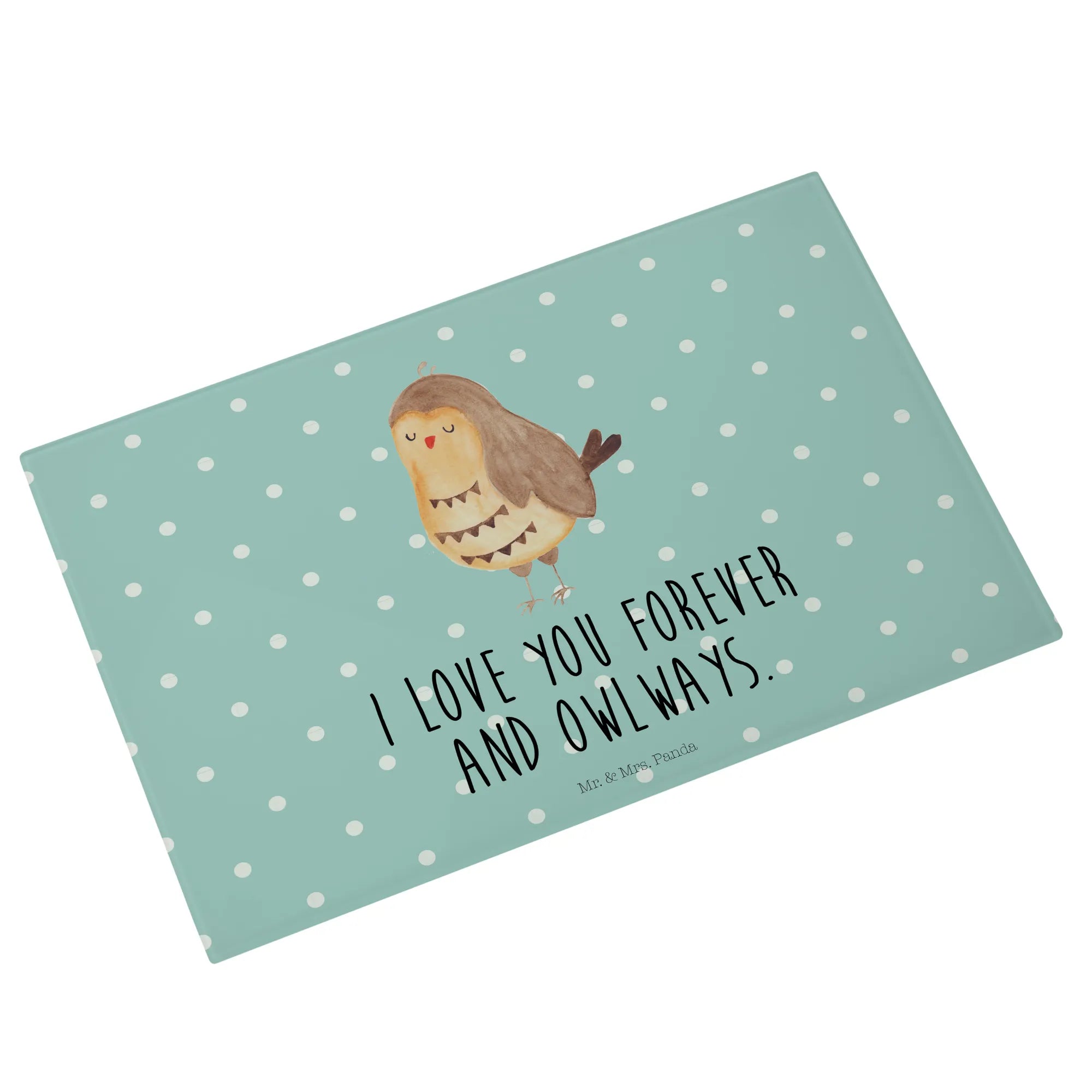 Der Slogan "I love you forever and owlways" sorgt für eine romantische Note und ist ein tolles Geschenk für den Hochzeitstag oder andere besondere Anlässe. Mit den Maßen von 389 mm x 284 mm und einer Höhe von nur 4 mm ist das Schneidbrett ideal für die Zubereitung leckerer Speisen oder als Frühstücksbrett. Hergestellt aus kratzfestem Glas, ist es besonders langlebig und schützt die Unterfläche vor unerwünschten Kratzern. Durch 4 Gummifüße sitzt es rutschfest auf der Arbeitsplatte, während die liebevoll gestalteten Details dafür sorgen, dass jedes Stück ein Unikat ist.
