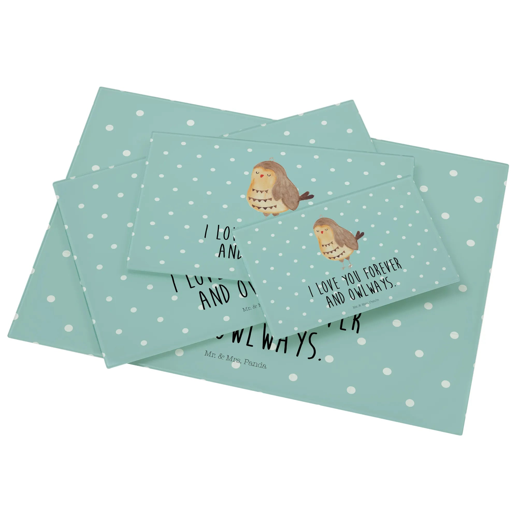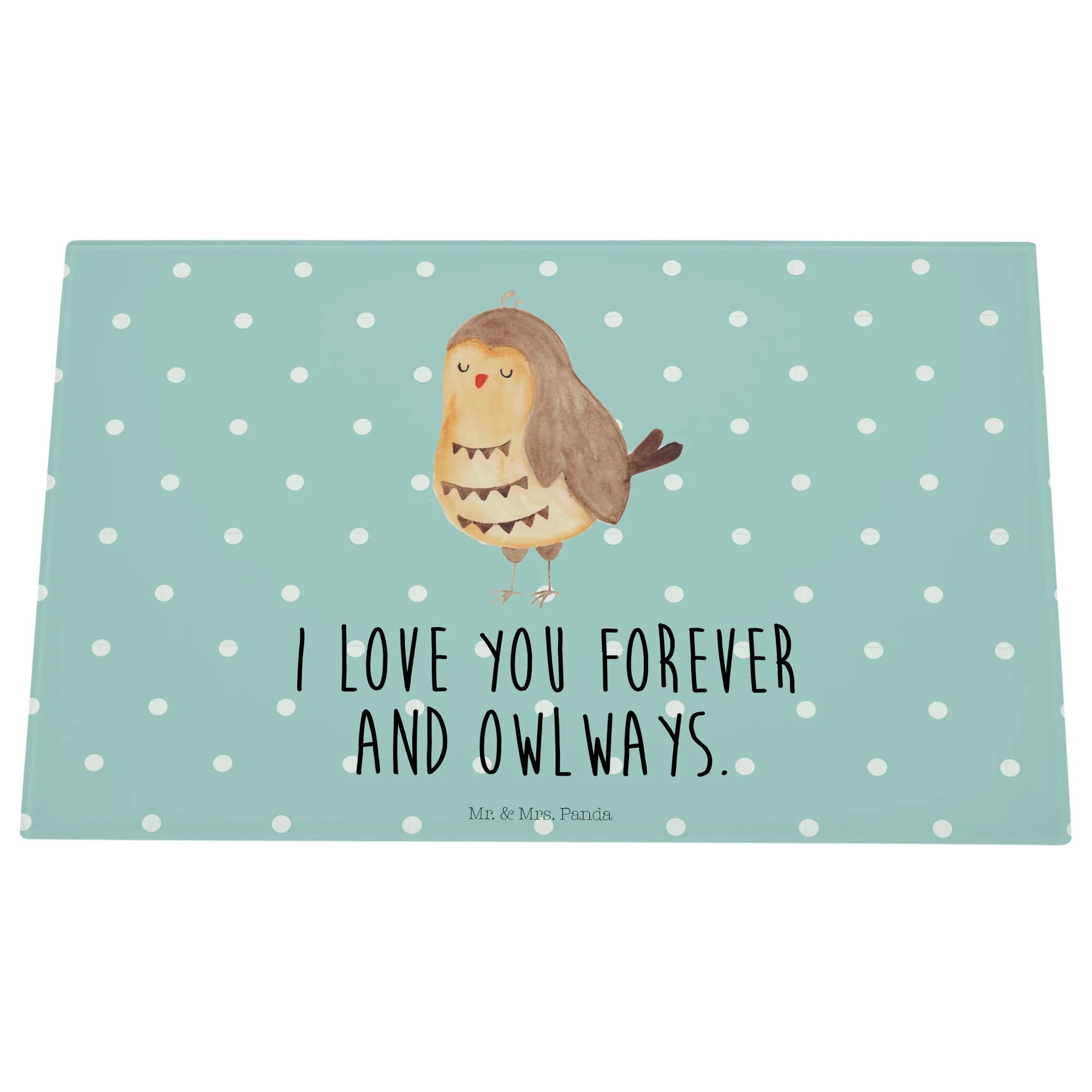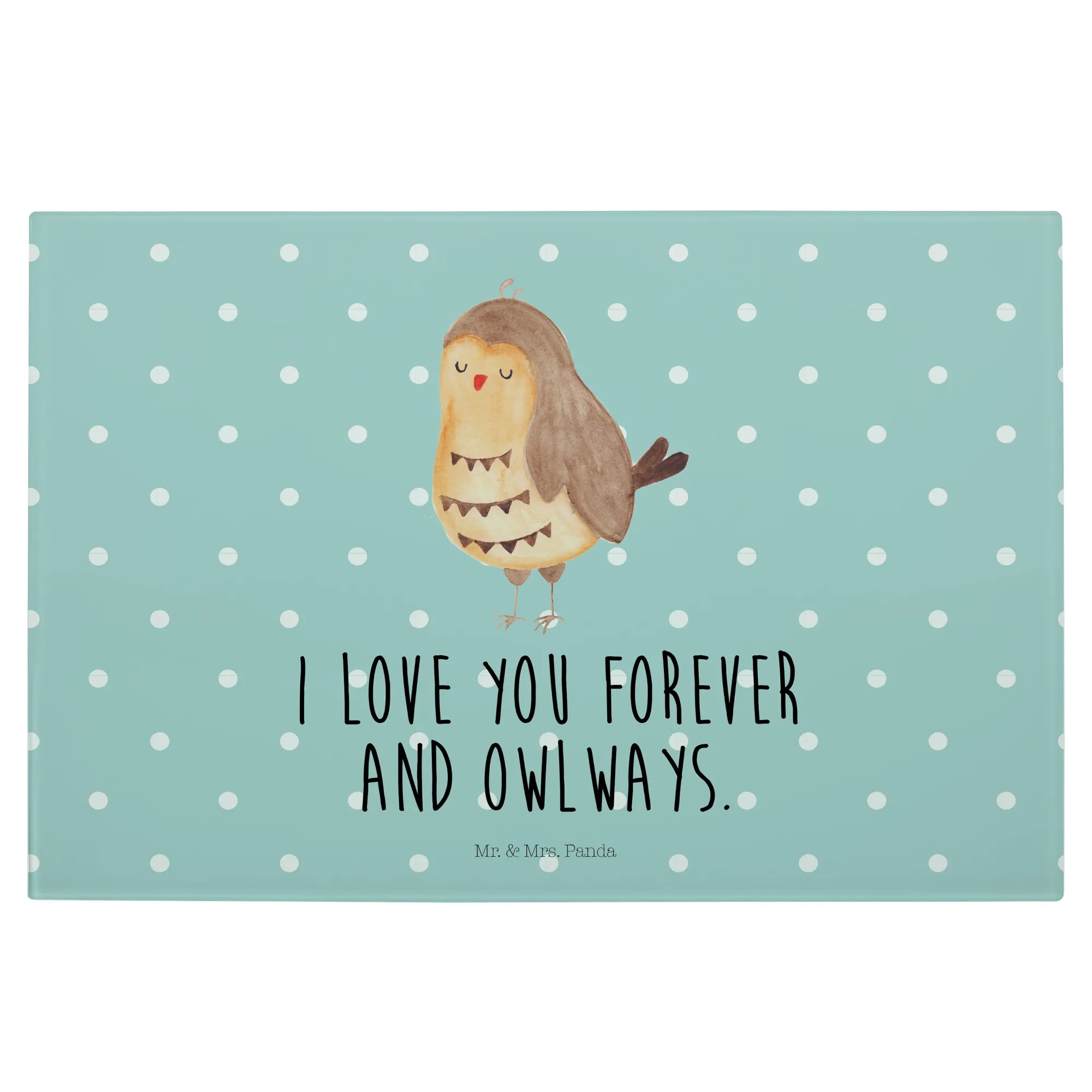 Der Slogan "I love you forever and owlways" sorgt für eine romantische Note und ist ein tolles Geschenk für den Hochzeitstag oder andere besondere Anlässe. Mit den Maßen von 389 mm x 284 mm und einer Höhe von nur 4 mm ist das Schneidbrett ideal für die Zubereitung leckerer Speisen oder als Frühstücksbrett. Hergestellt aus kratzfestem Glas, ist es besonders langlebig und schützt die Unterfläche vor unerwünschten Kratzern. Durch 4 Gummifüße sitzt es rutschfest auf der Arbeitsplatte, während die liebevoll gestalteten Details dafür sorgen, dass jedes Stück ein Unikat ist.