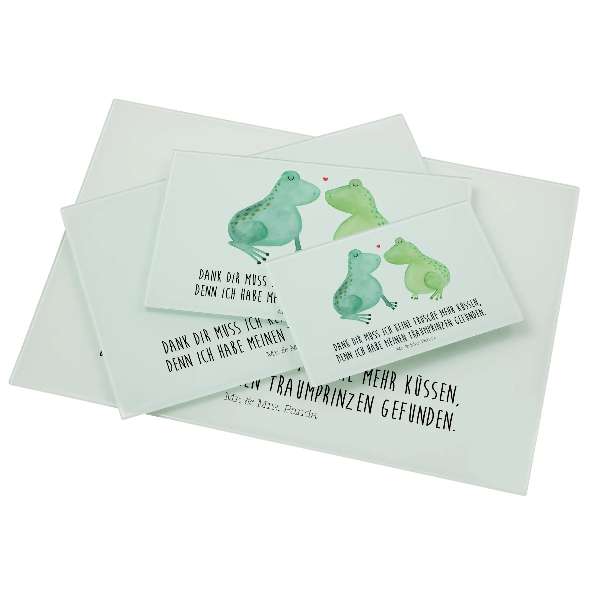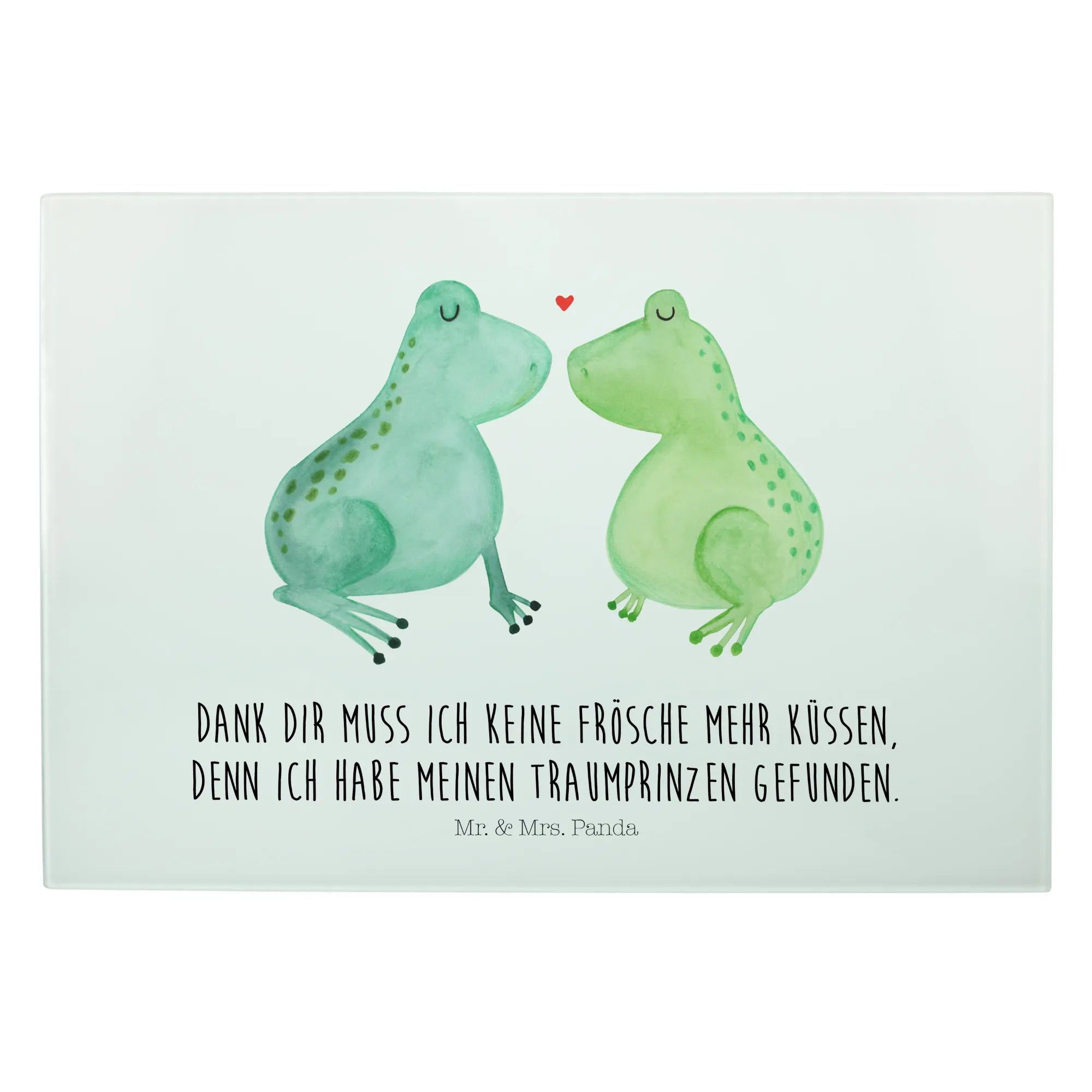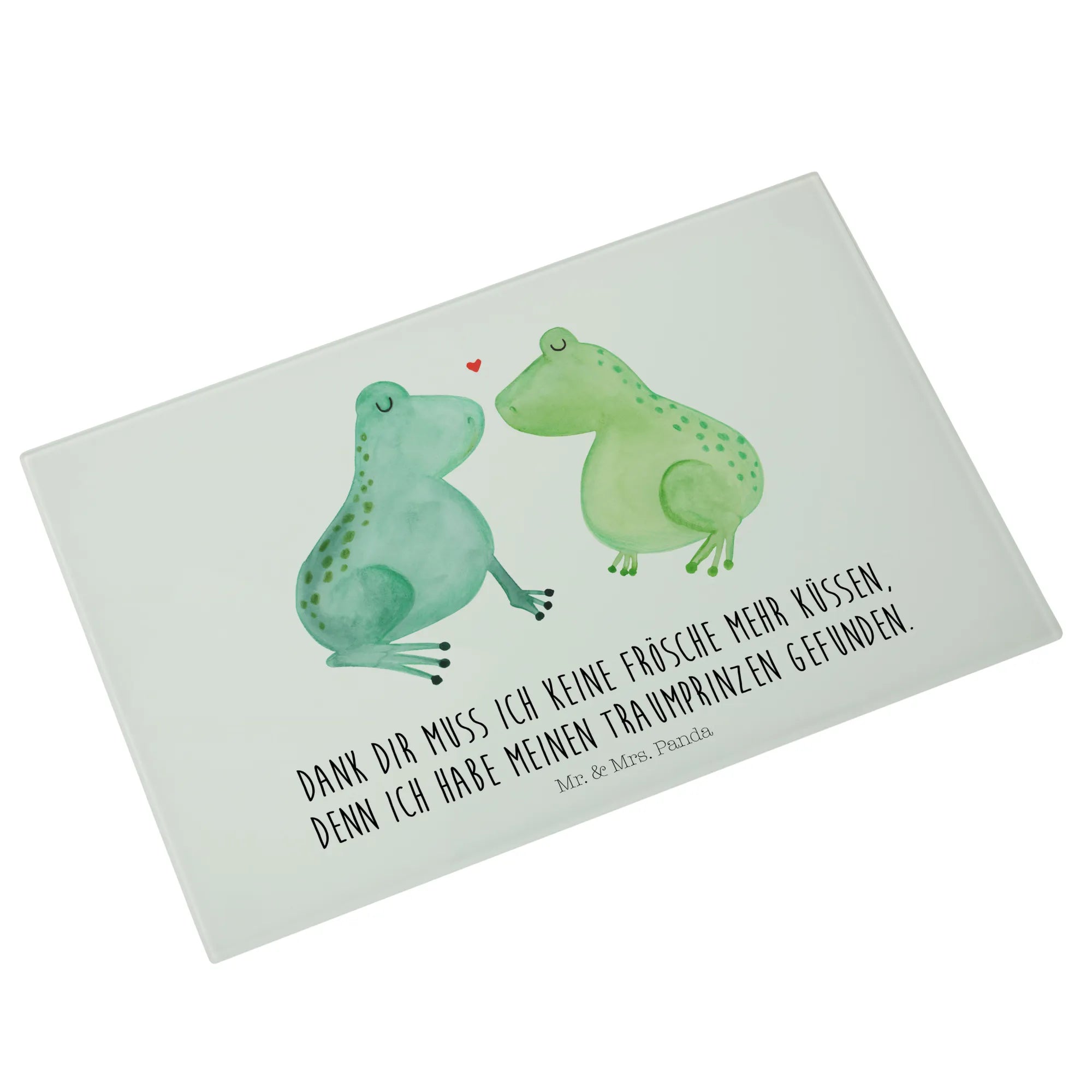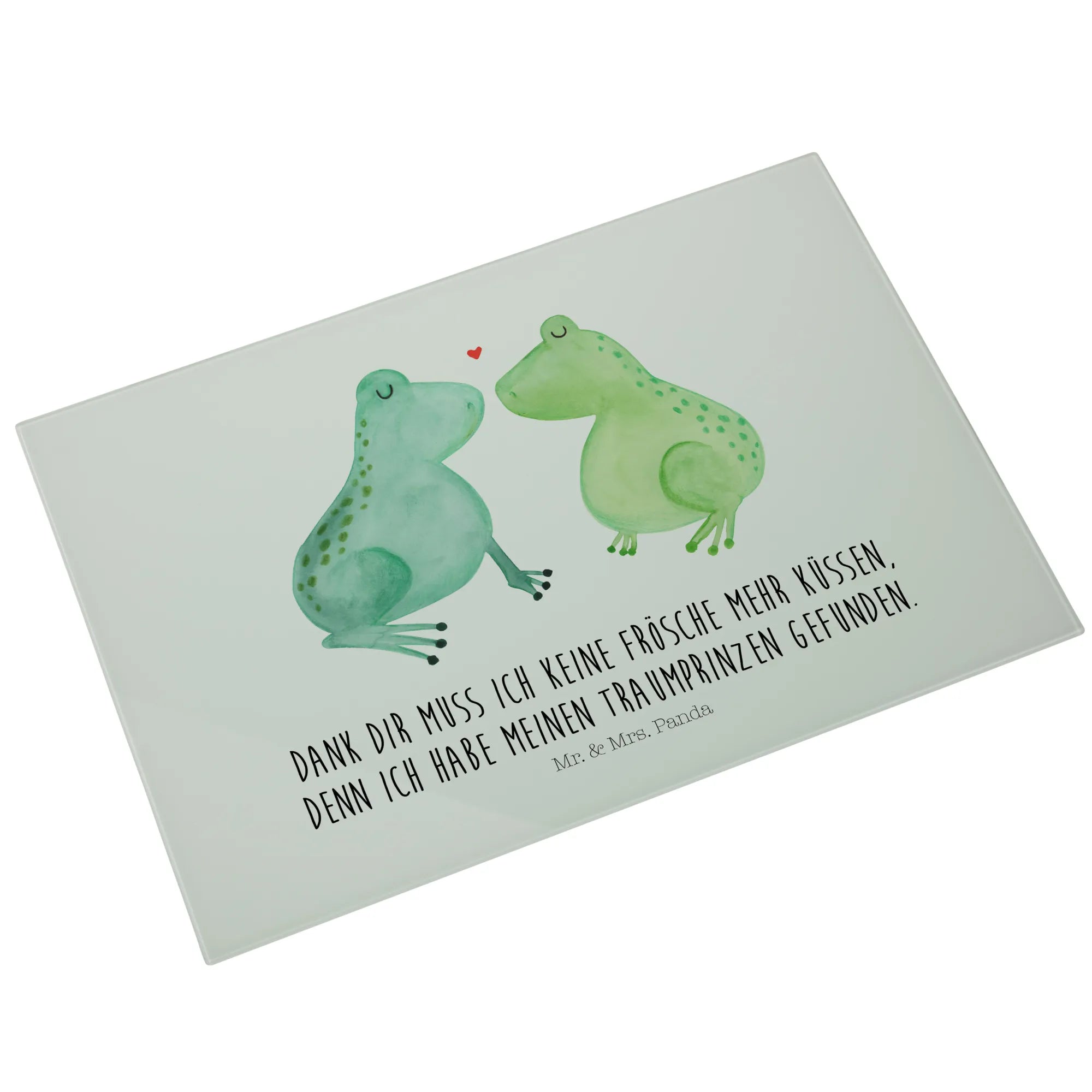 Das XL Glas Schneidbrett mit dem süßen Motiv 'Frosch Liebe' von Mr. & Mrs. Panda ist das perfekte Geschenk für Verliebte! Mit seinem herzlichen Slogan 'Dank dir muss ich keine Frösche mehr Küssen, denn ich habe meinen Traumprinzen gefunden' ist es nicht nur ein praktisches Küchenutensil, sondern auch ein liebevolles Liebesgeschenk.
