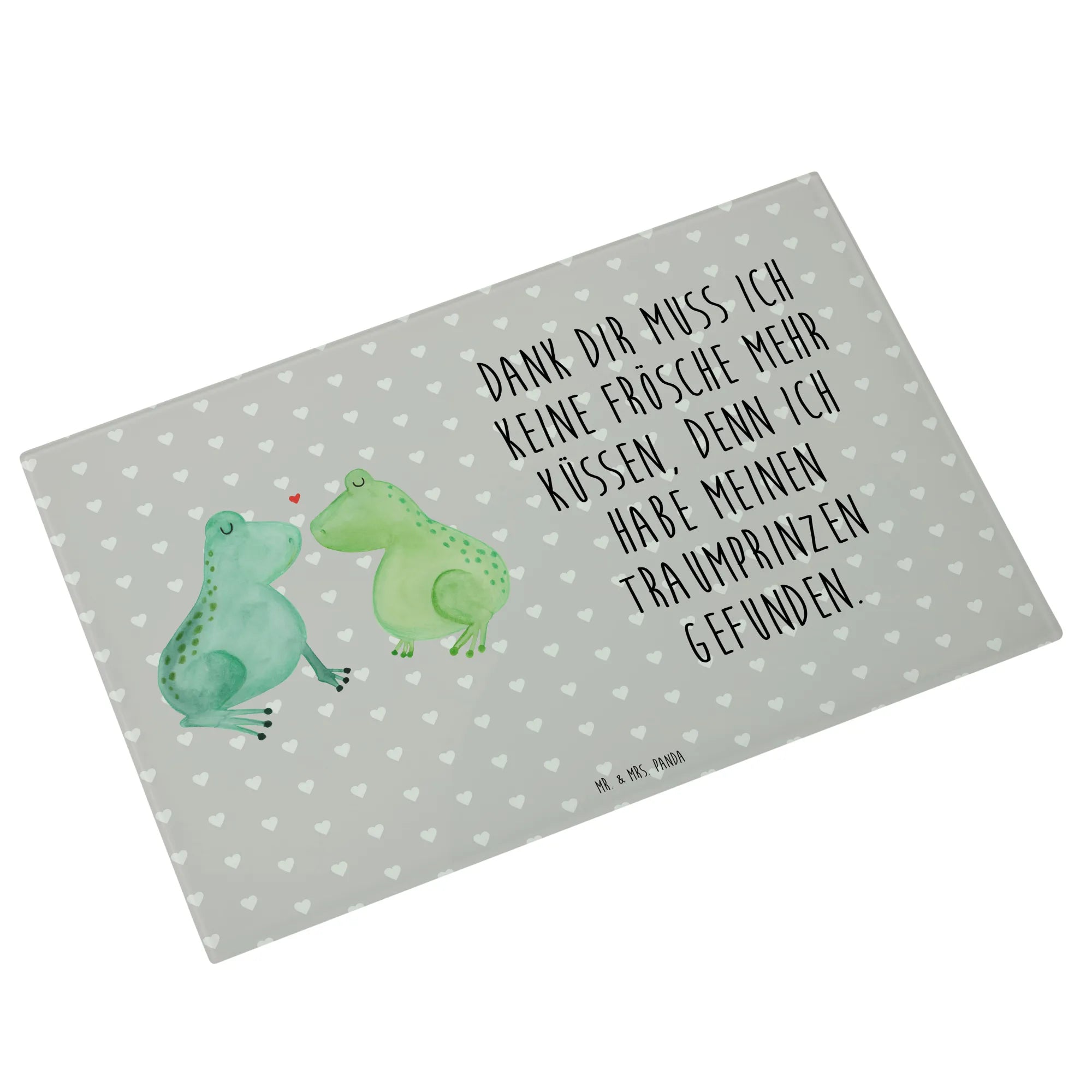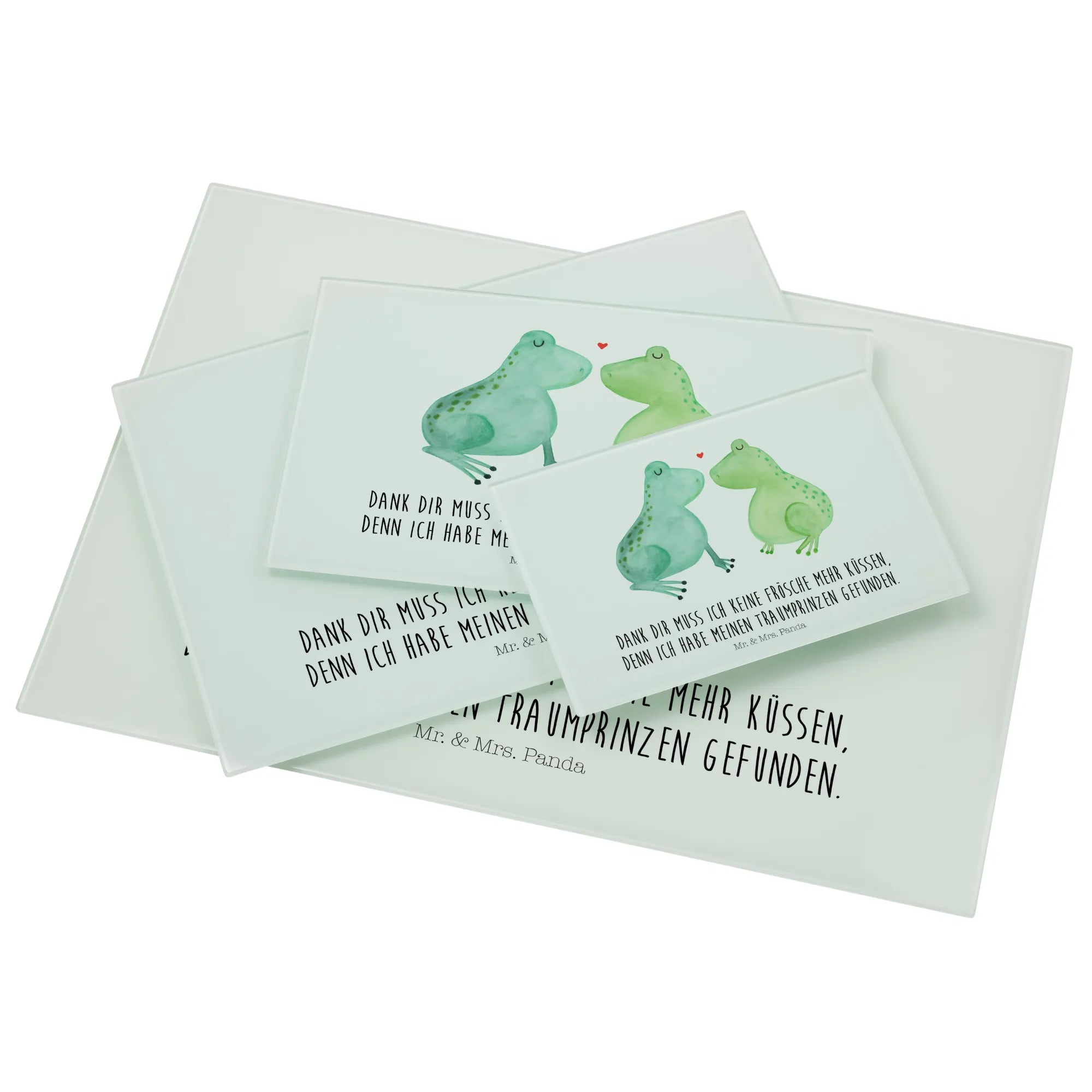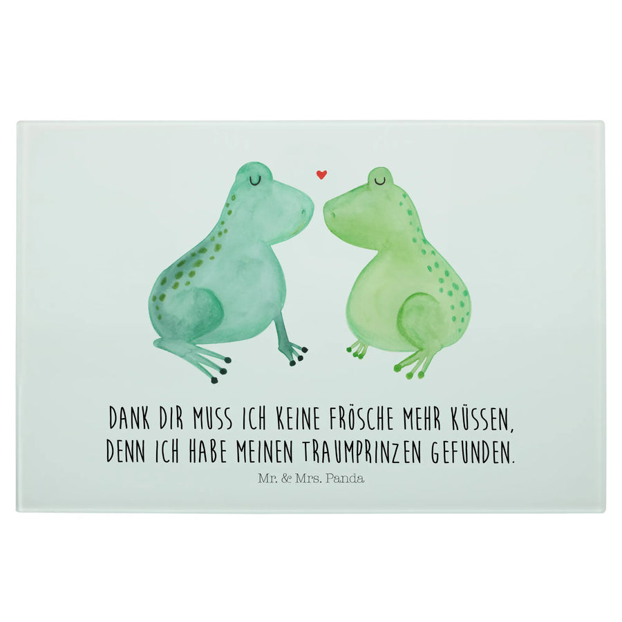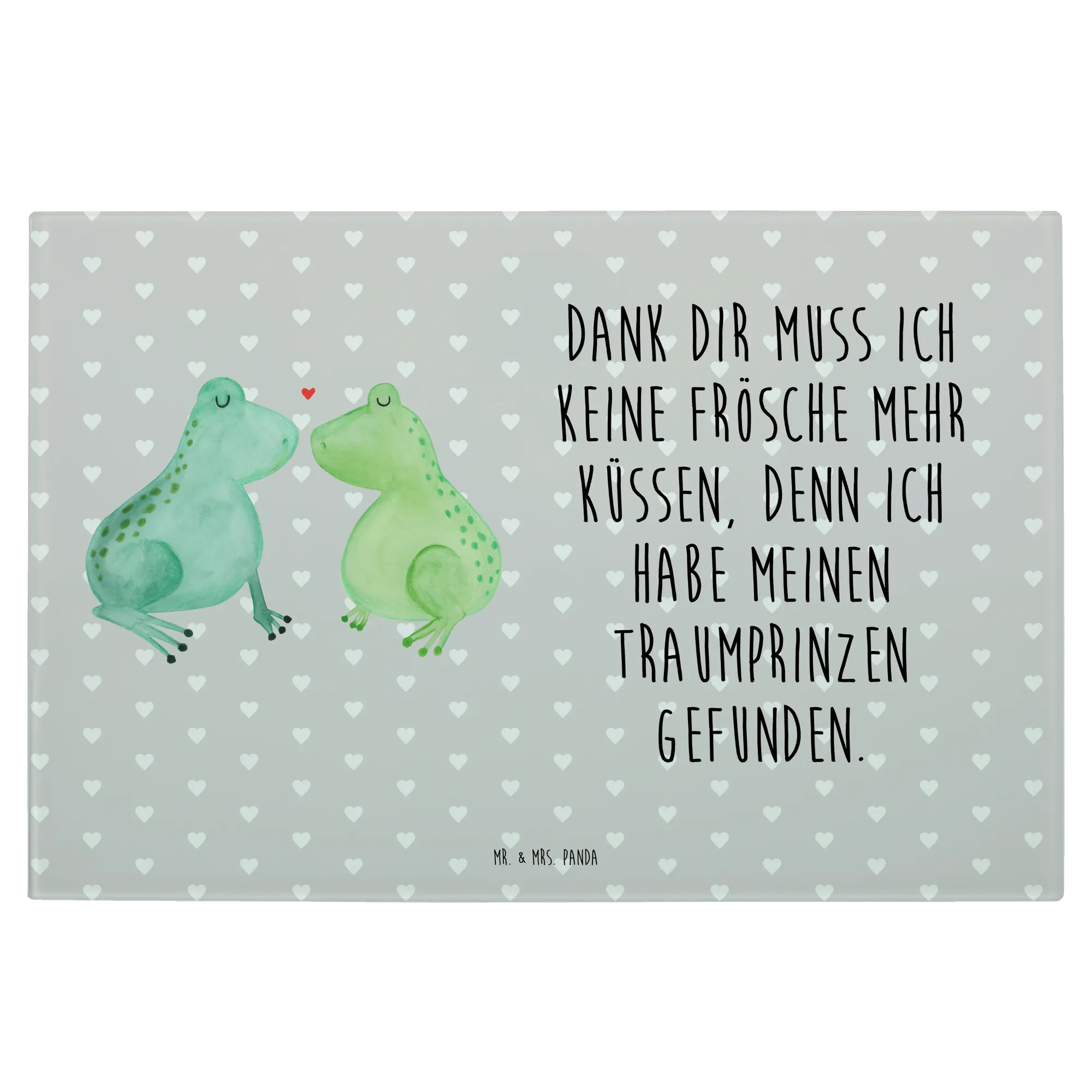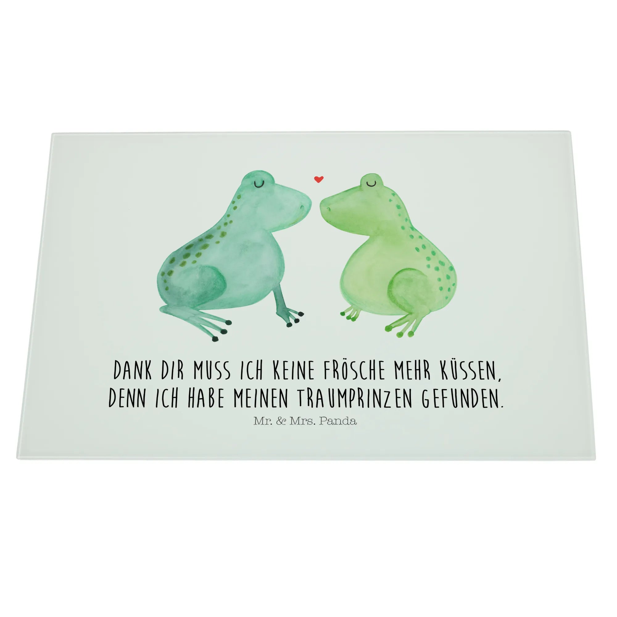 Das XL Glas Schneidbrett mit dem süßen Motiv 'Frosch Liebe' von Mr. & Mrs. Panda ist das perfekte Geschenk für Verliebte! Mit seinem herzlichen Slogan 'Dank dir muss ich keine Frösche mehr Küssen, denn ich habe meinen Traumprinzen gefunden' ist es nicht nur ein praktisches Küchenutensil, sondern auch ein liebevolles Liebesgeschenk.
