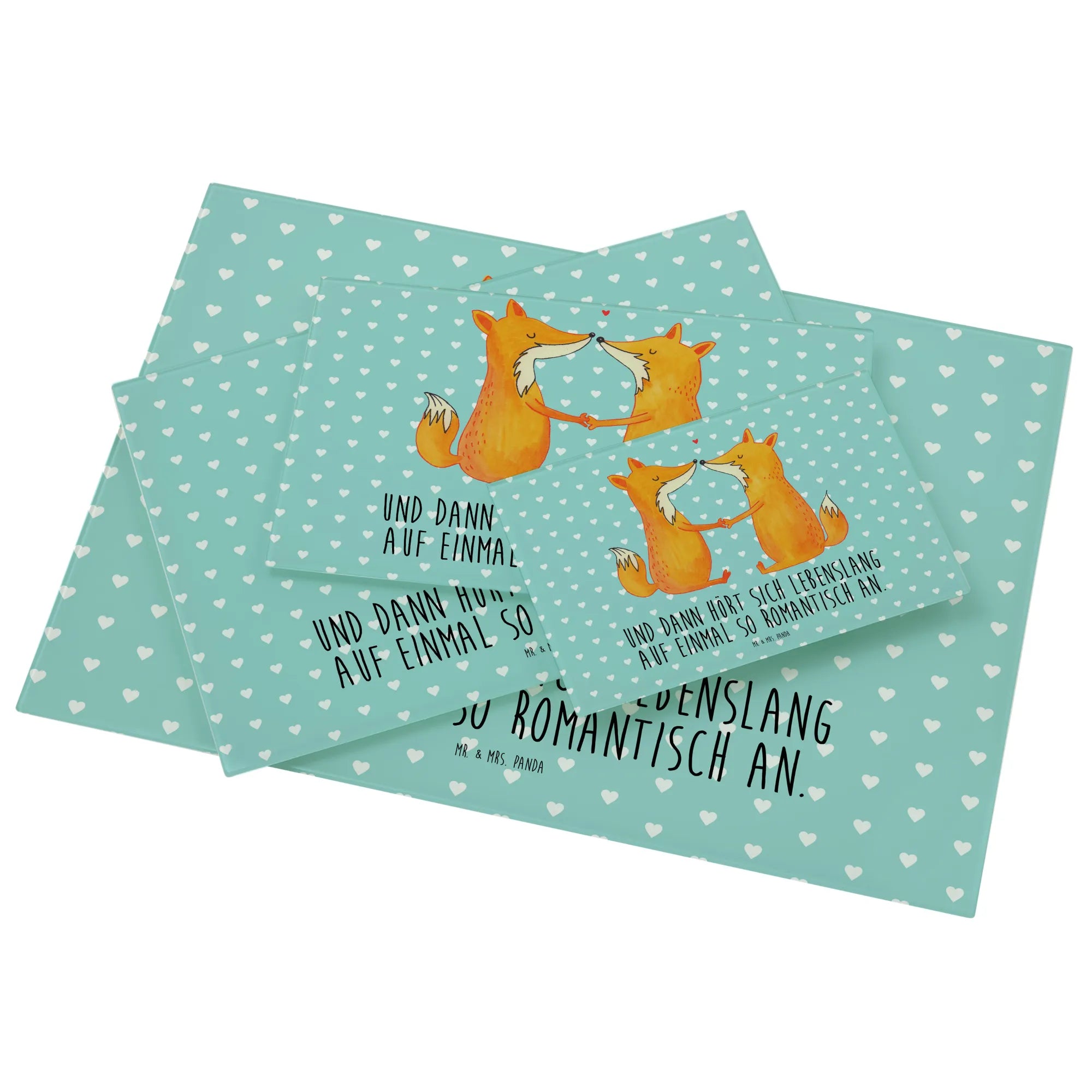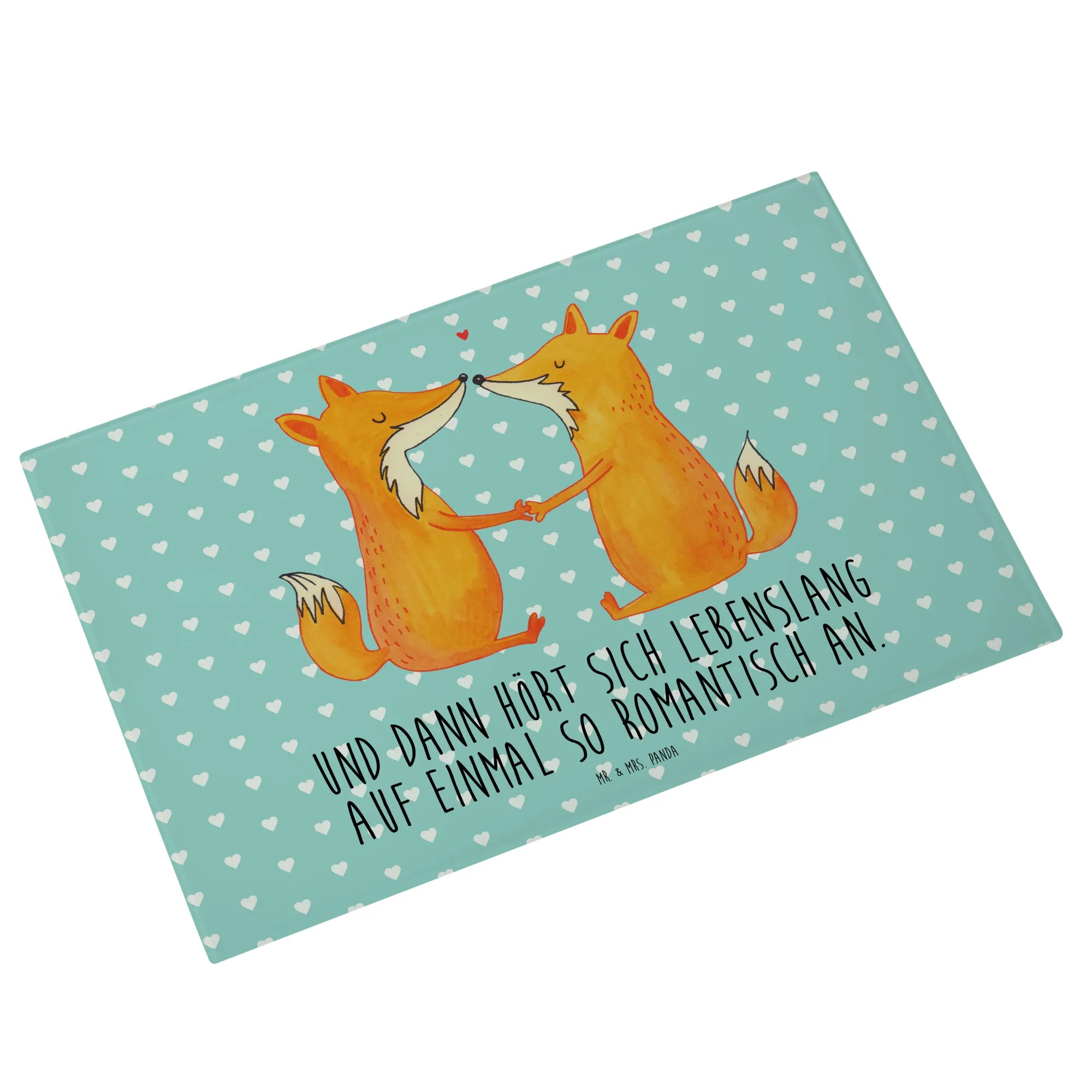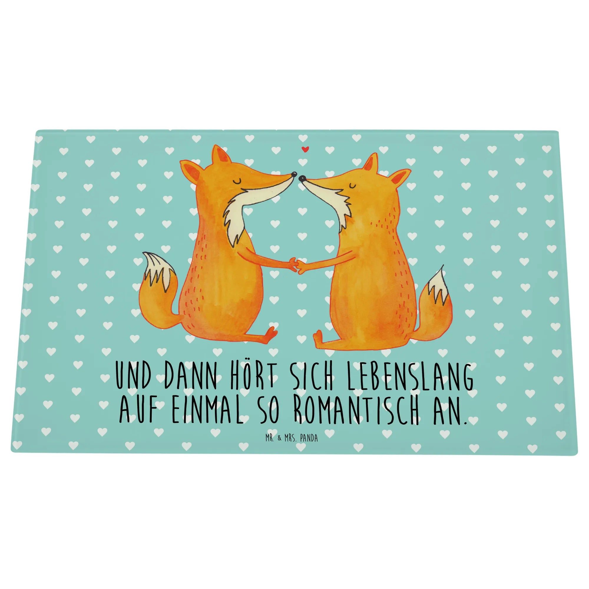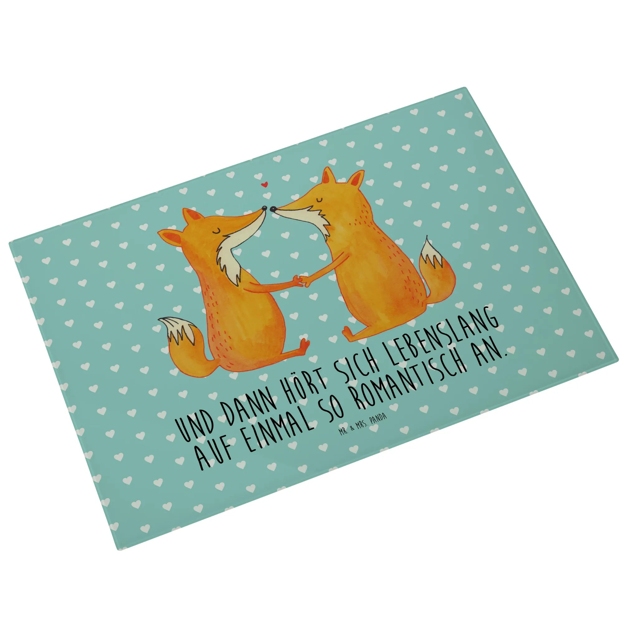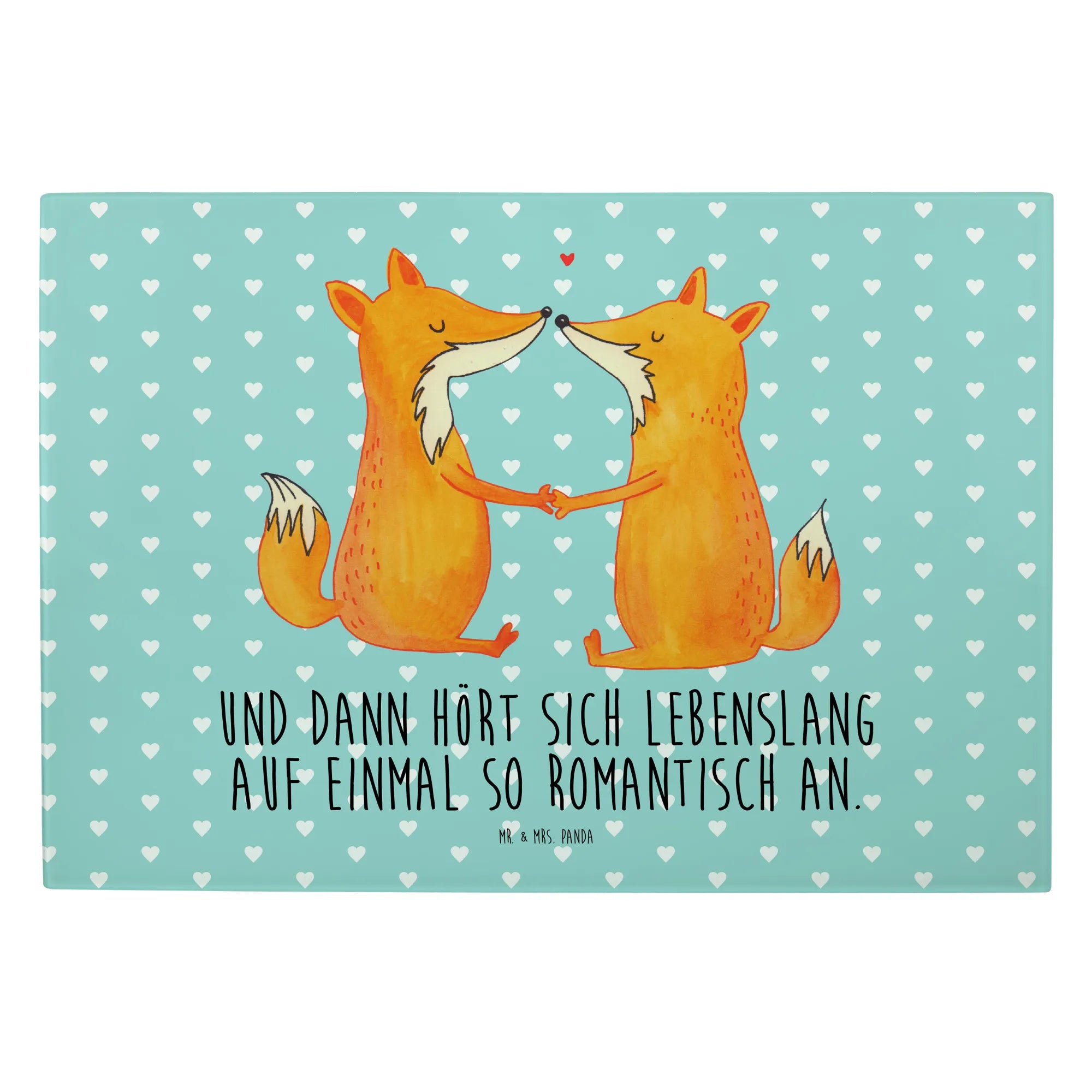 Mit einem liebevollen Motiv von zwei süßen Füchsen, die Hand in Hand sitzen und einander anstrahlen, bringt dieses Schneidebrett nicht nur Freude beim Kochen, sondern auch ein Stück Liebe in dein Zuhause. Das romantische Design wird von dem Spruch "Und dann hört sich lebenslang auf einmal so romantisch an" ergänzt und erinnert dich und deinen Partner an die wunderbaren Momente des Lebens.