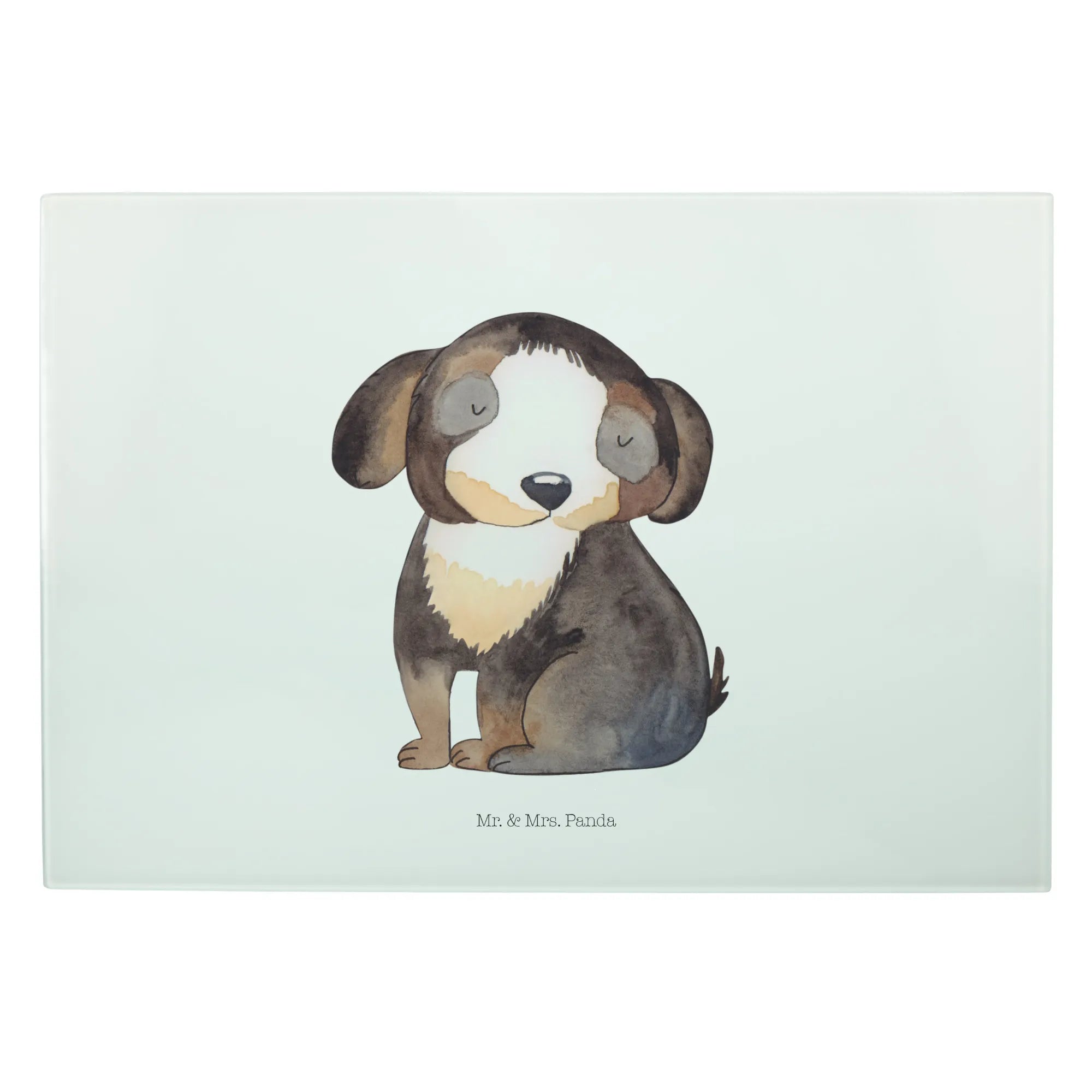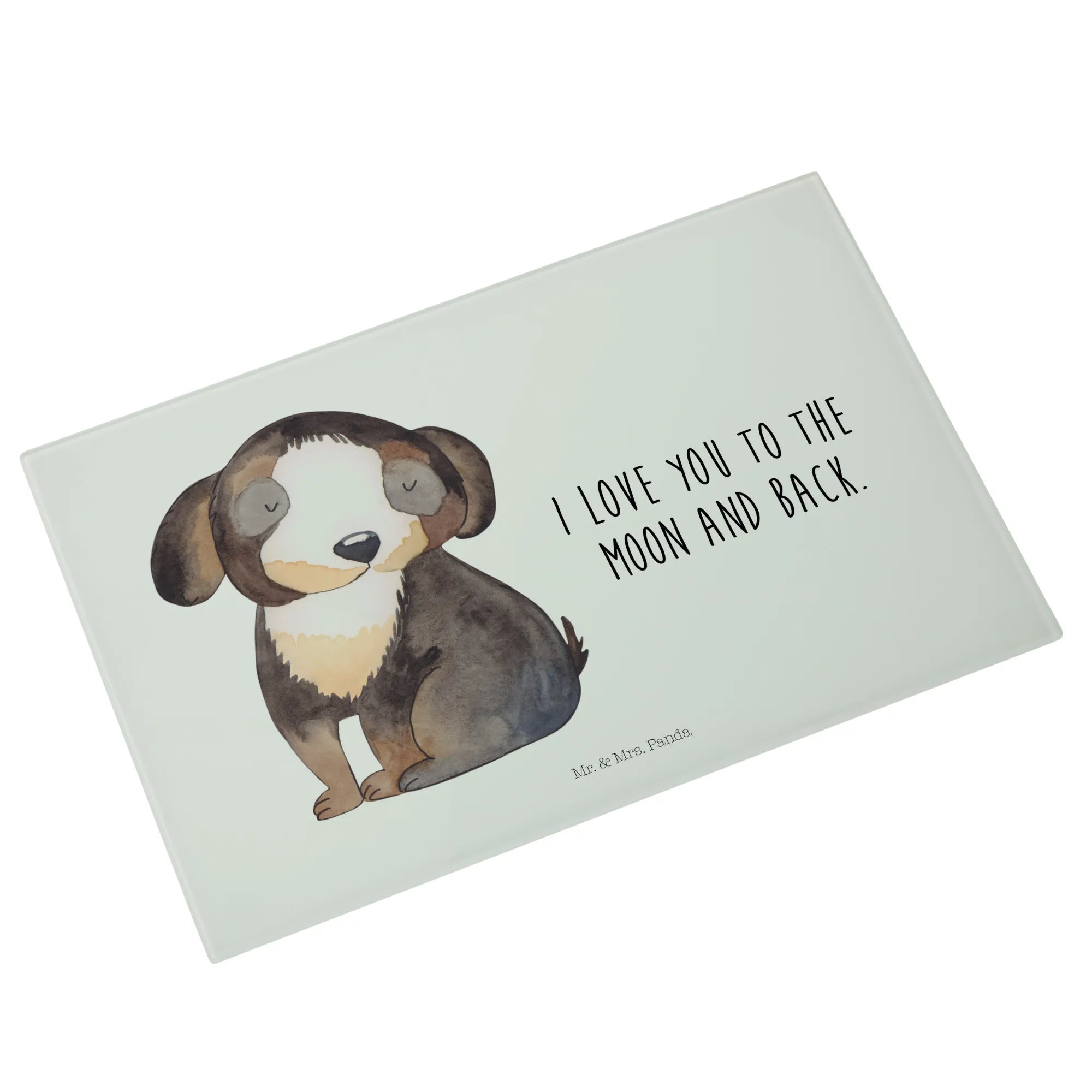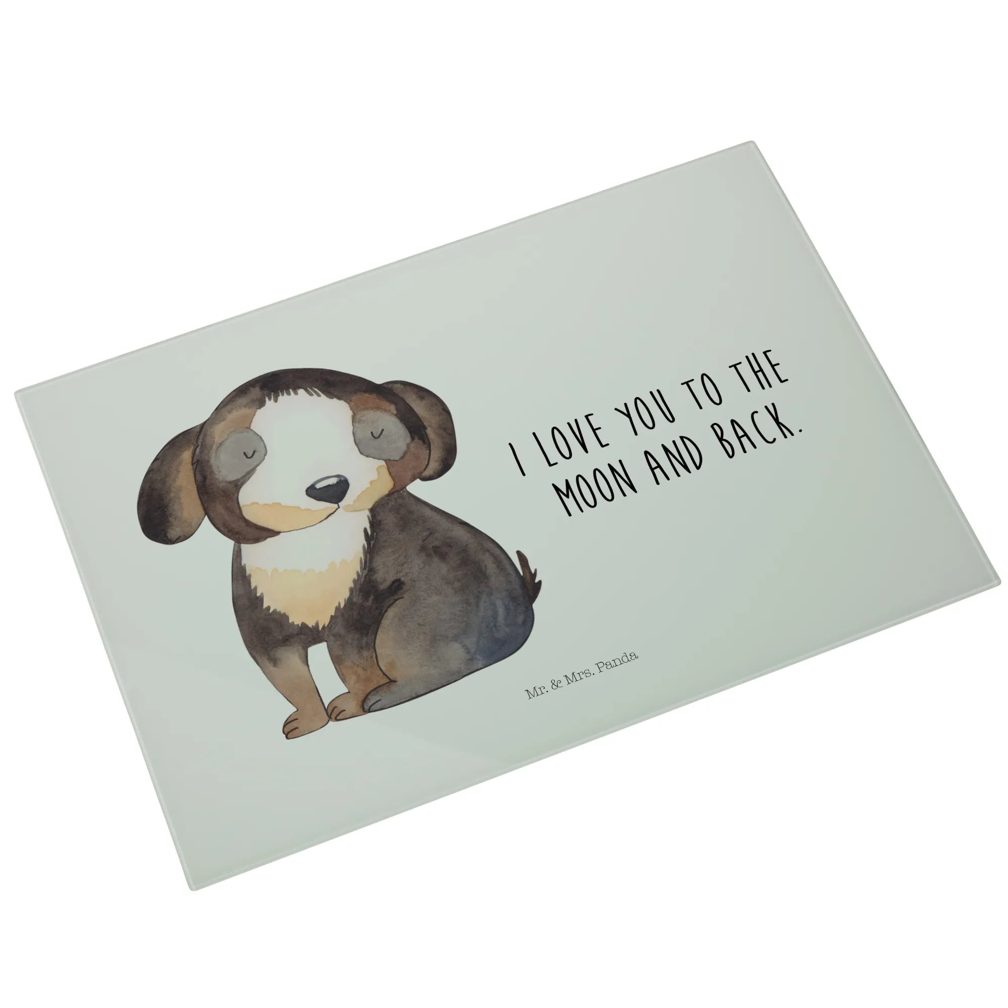 Die liebevolle Handzeichnung von Mrs. Panda bringt die Liebe zu Hunden perfekt zum Ausdruck und macht jedes Schneidbrett zu einem Unikat. Das Glas lässt sich leicht mit der Hand reinigen und die Besonderheit des rückseitigen Drucks sorgt dafür, dass der Kontakt mit Druckfarbe ausgeschlossen ist, was es zu einem lebensmittelsicheren Produkt macht.