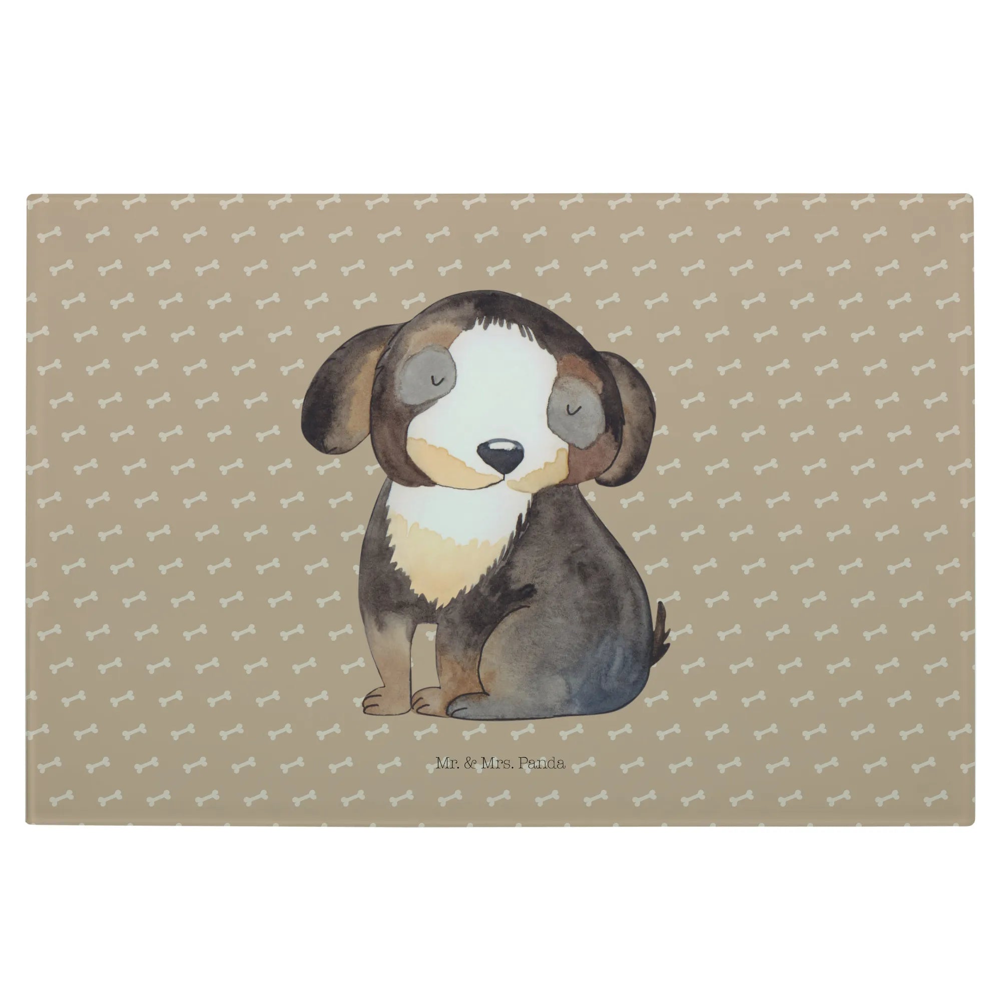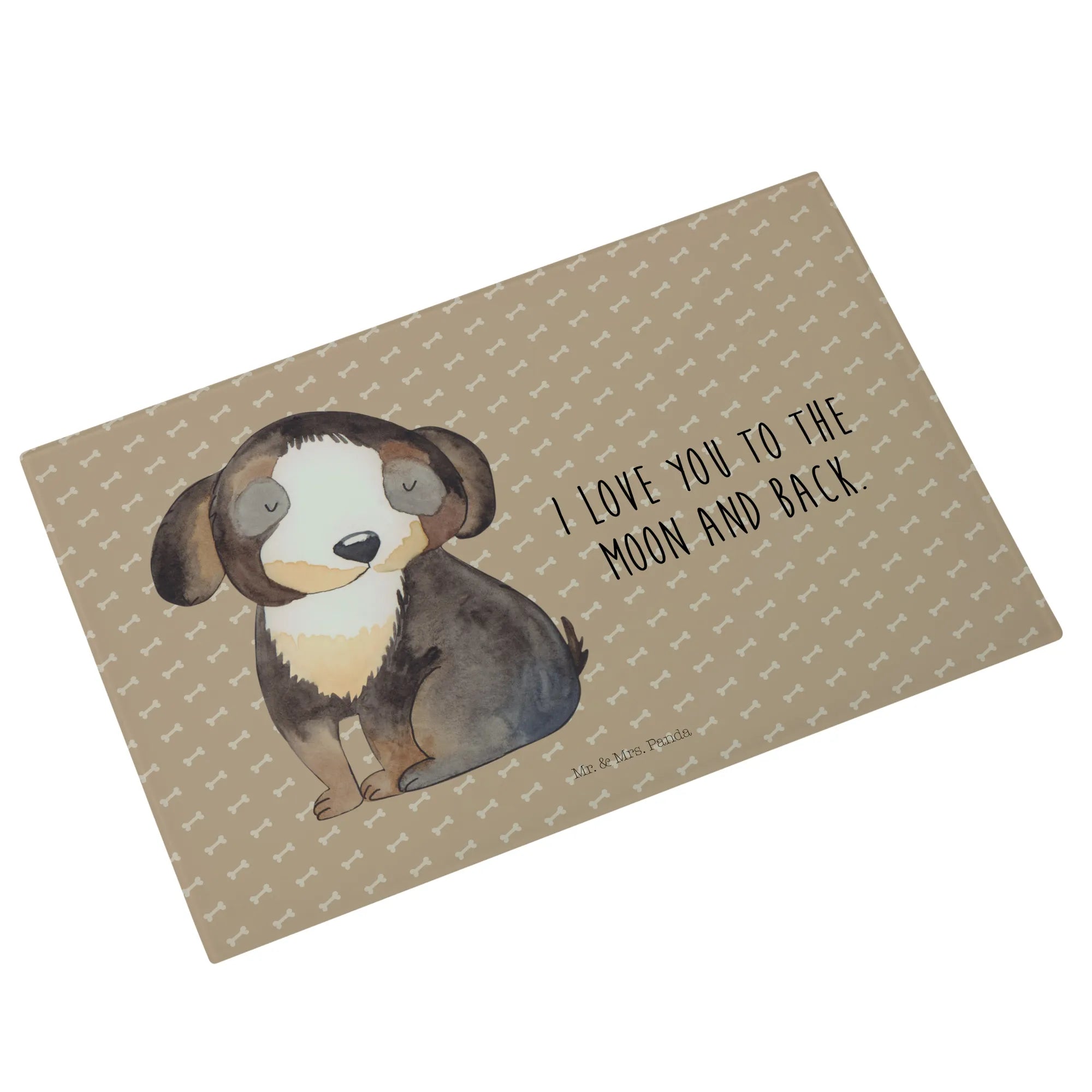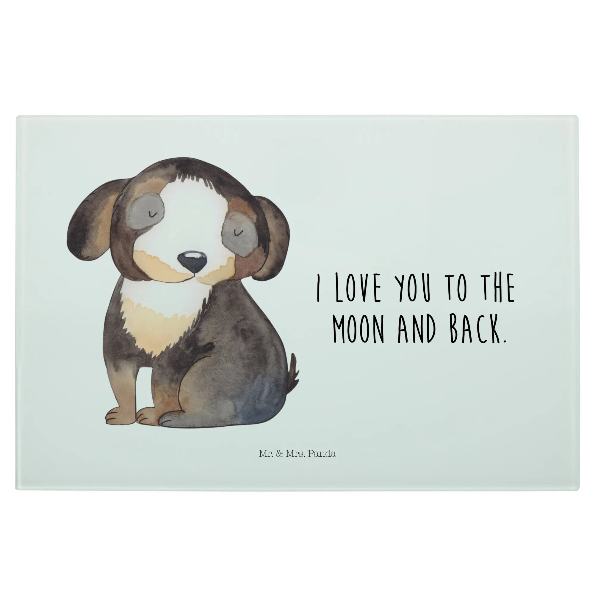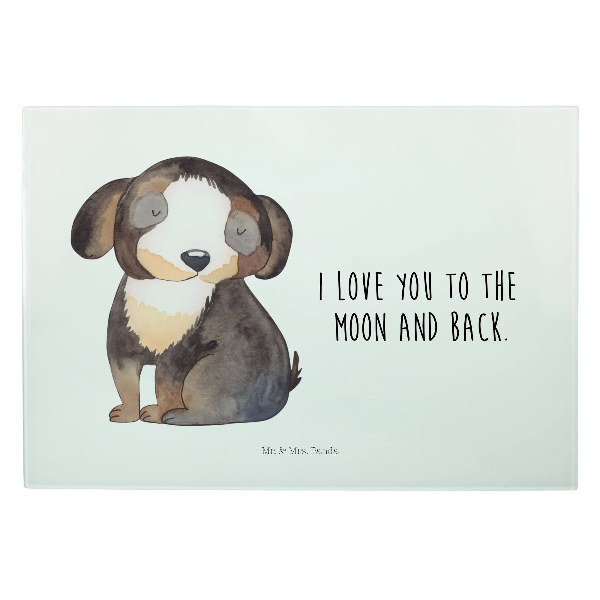 Die liebevolle Handzeichnung von Mrs. Panda bringt die Liebe zu Hunden perfekt zum Ausdruck und macht jedes Schneidbrett zu einem Unikat. Das Glas lässt sich leicht mit der Hand reinigen und die Besonderheit des rückseitigen Drucks sorgt dafür, dass der Kontakt mit Druckfarbe ausgeschlossen ist, was es zu einem lebensmittelsicheren Produkt macht.