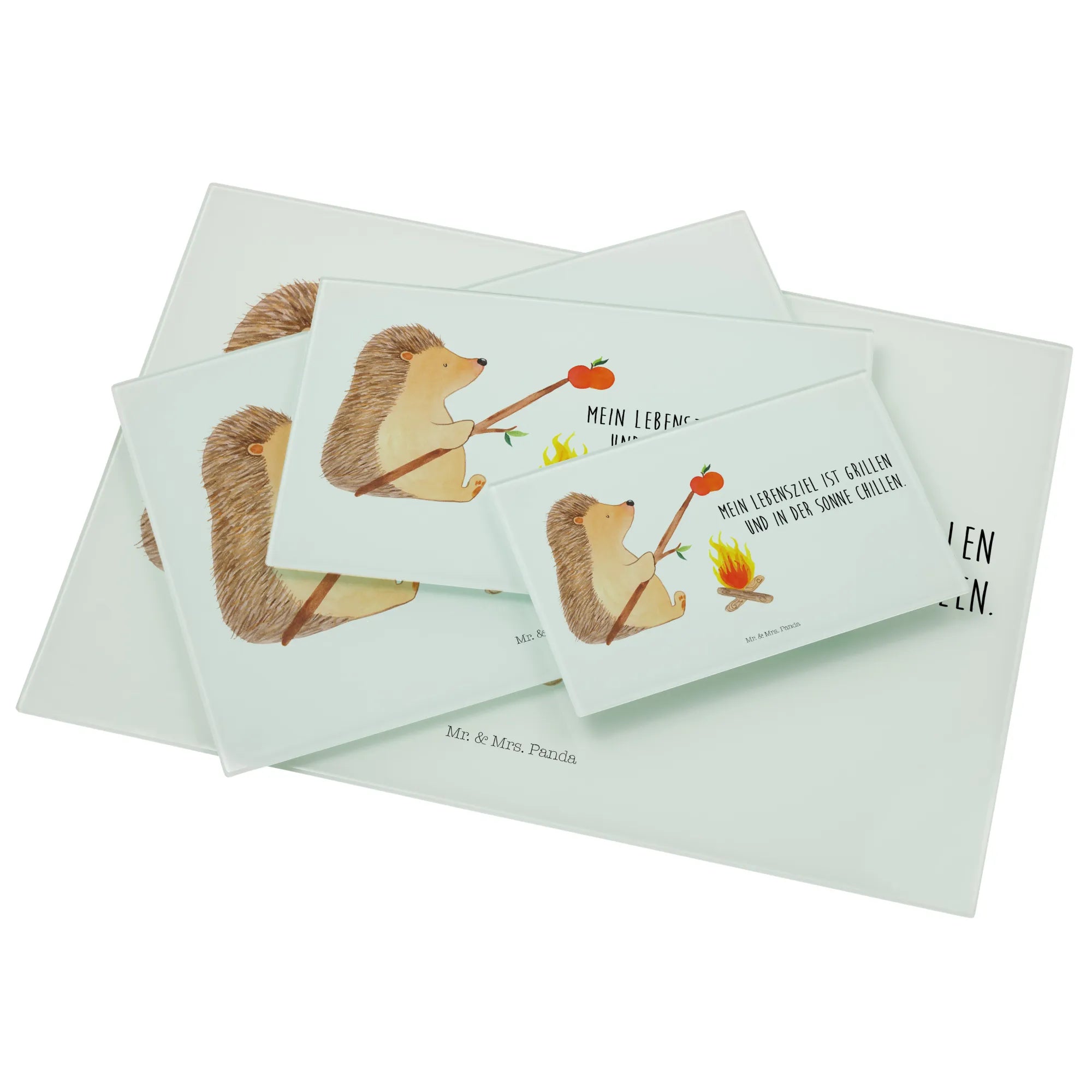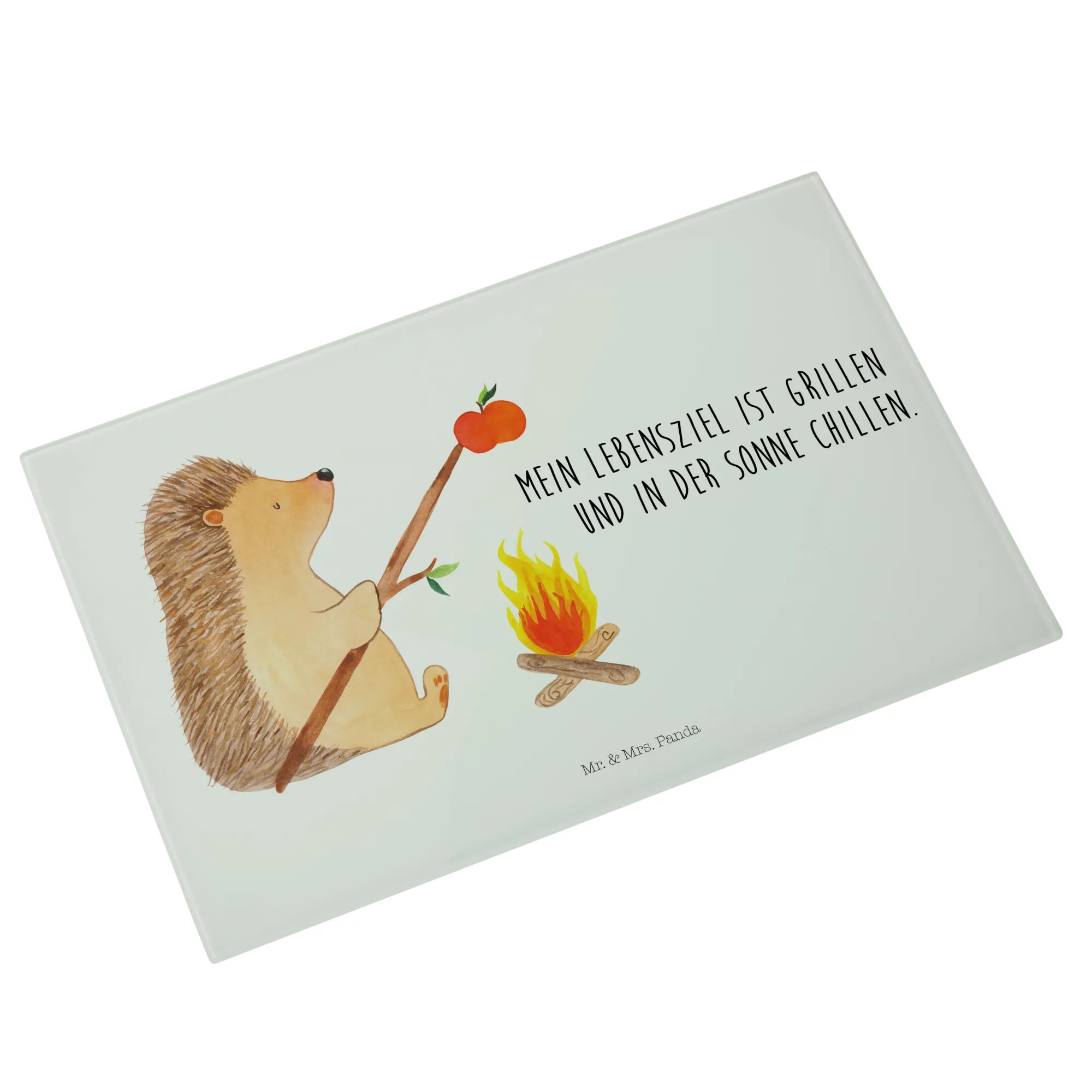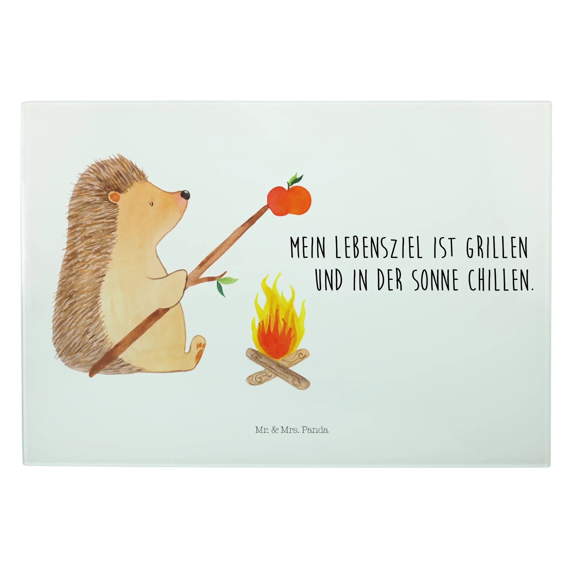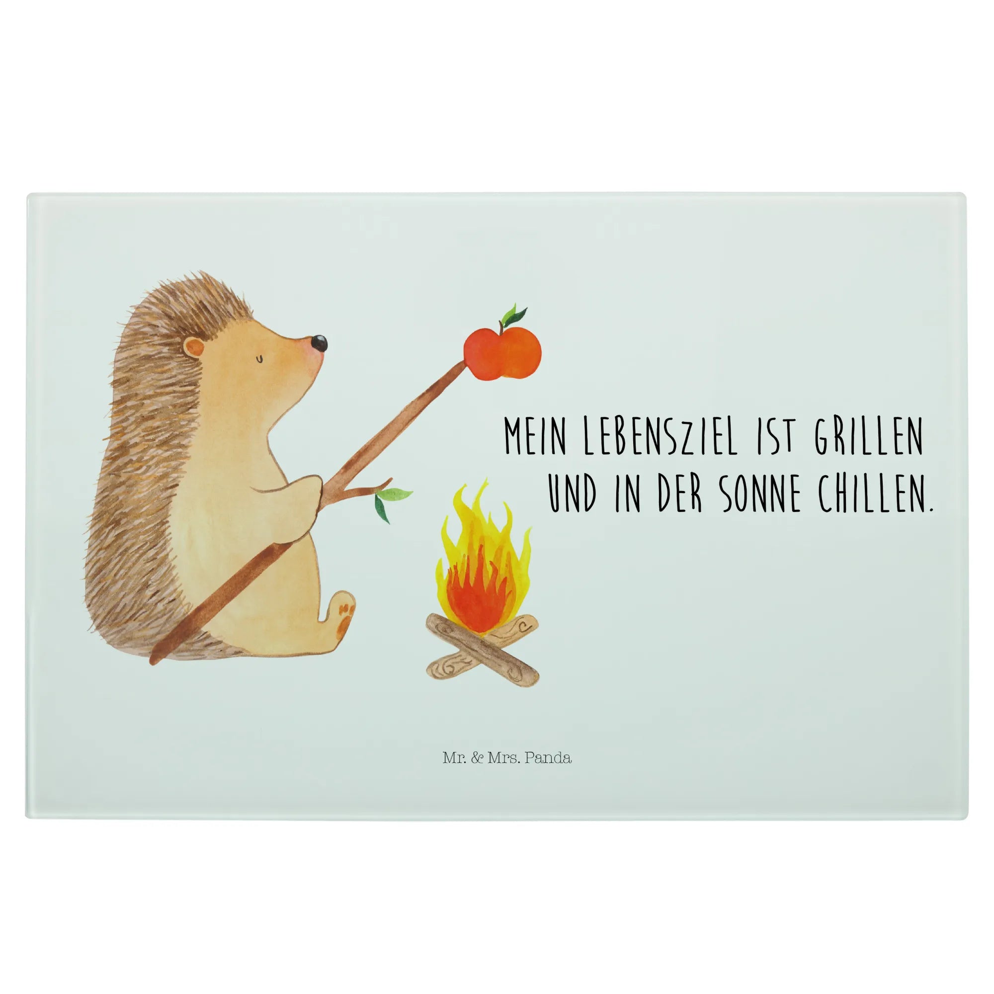 Das XL Glas Schneidbrett mit dem süßen Motiv "Igel grillt" aus unserer Small World Kollektion von Mr. & Mrs. Panda ist das perfekte Geschenk für alle, die das Grillen und die guten Dinge im Leben lieben!