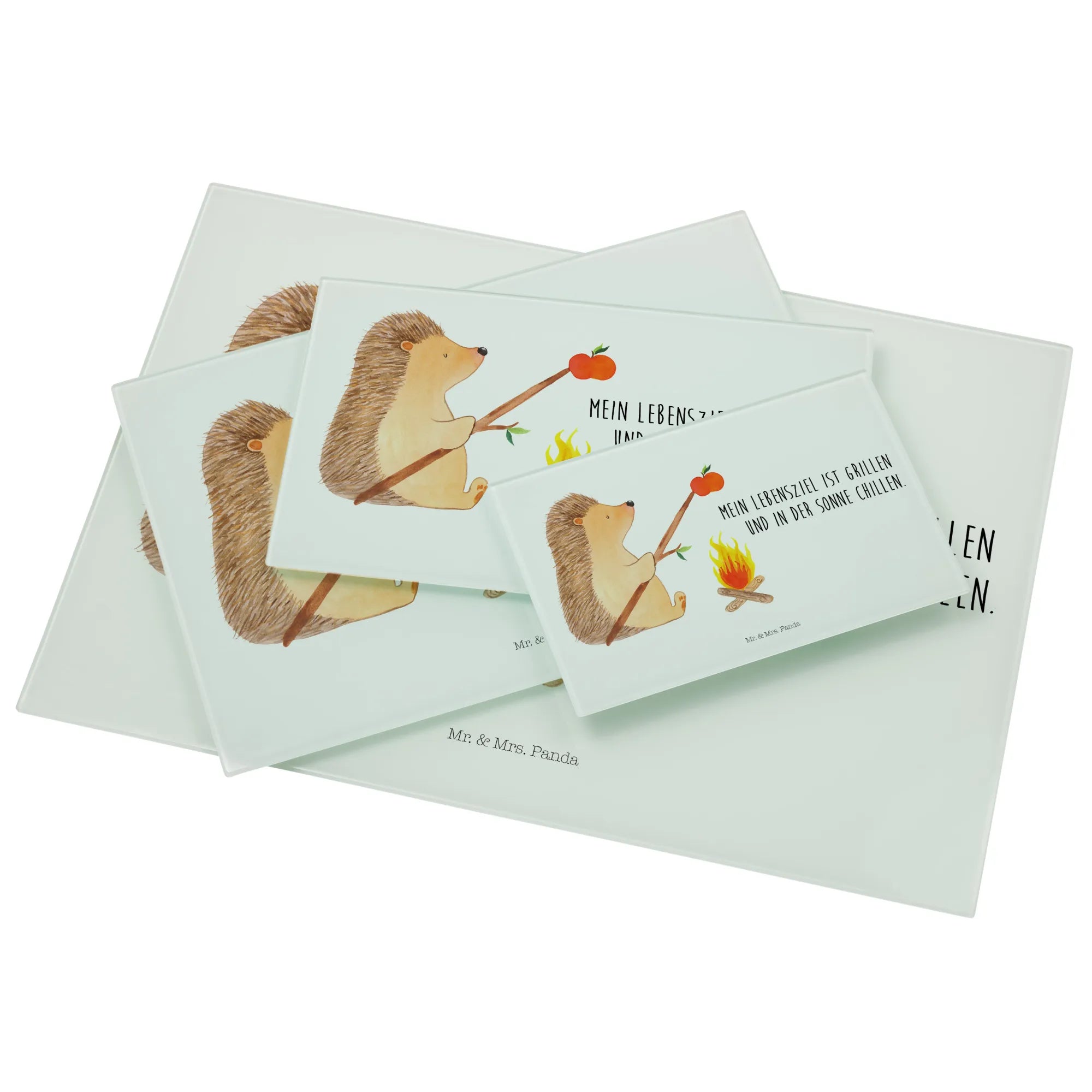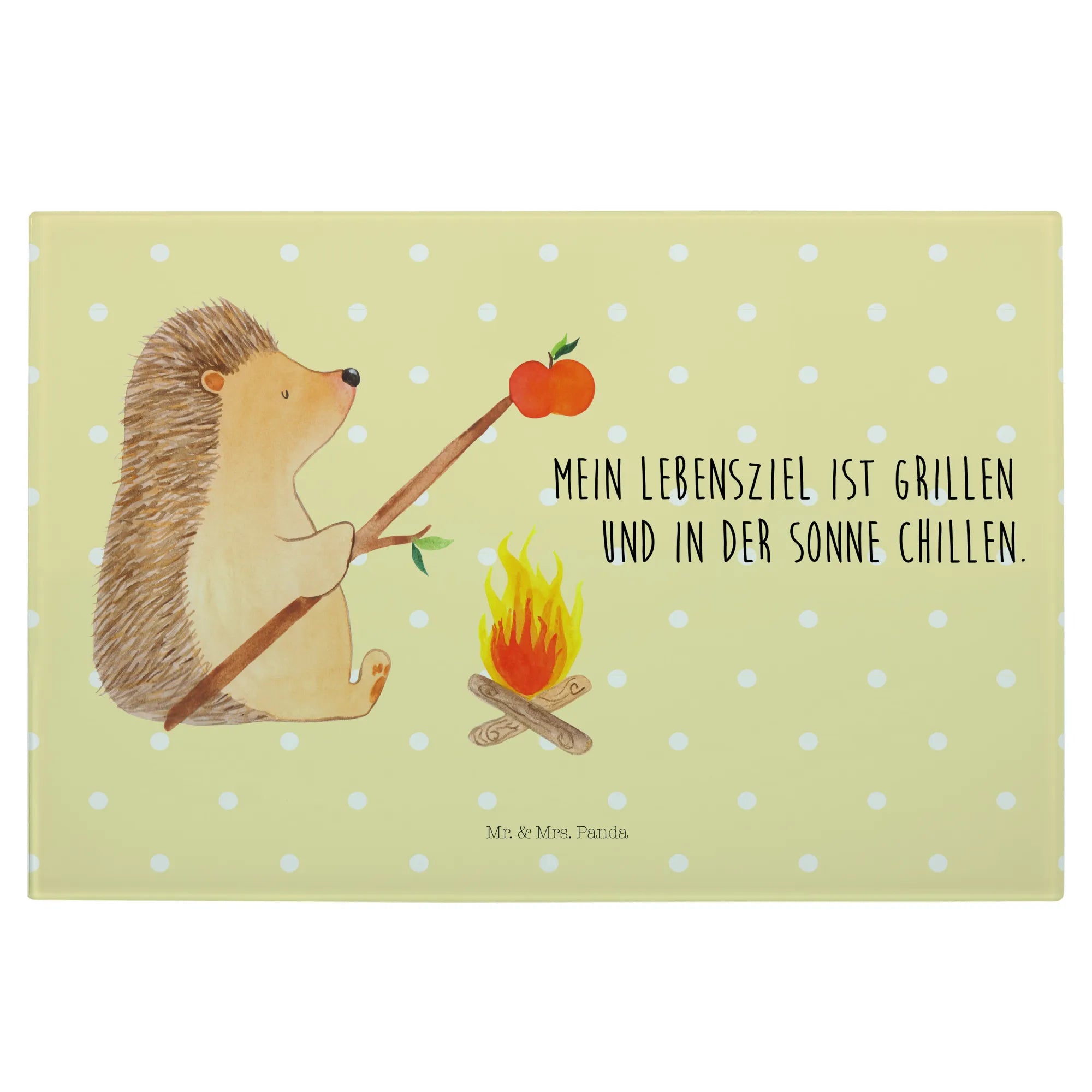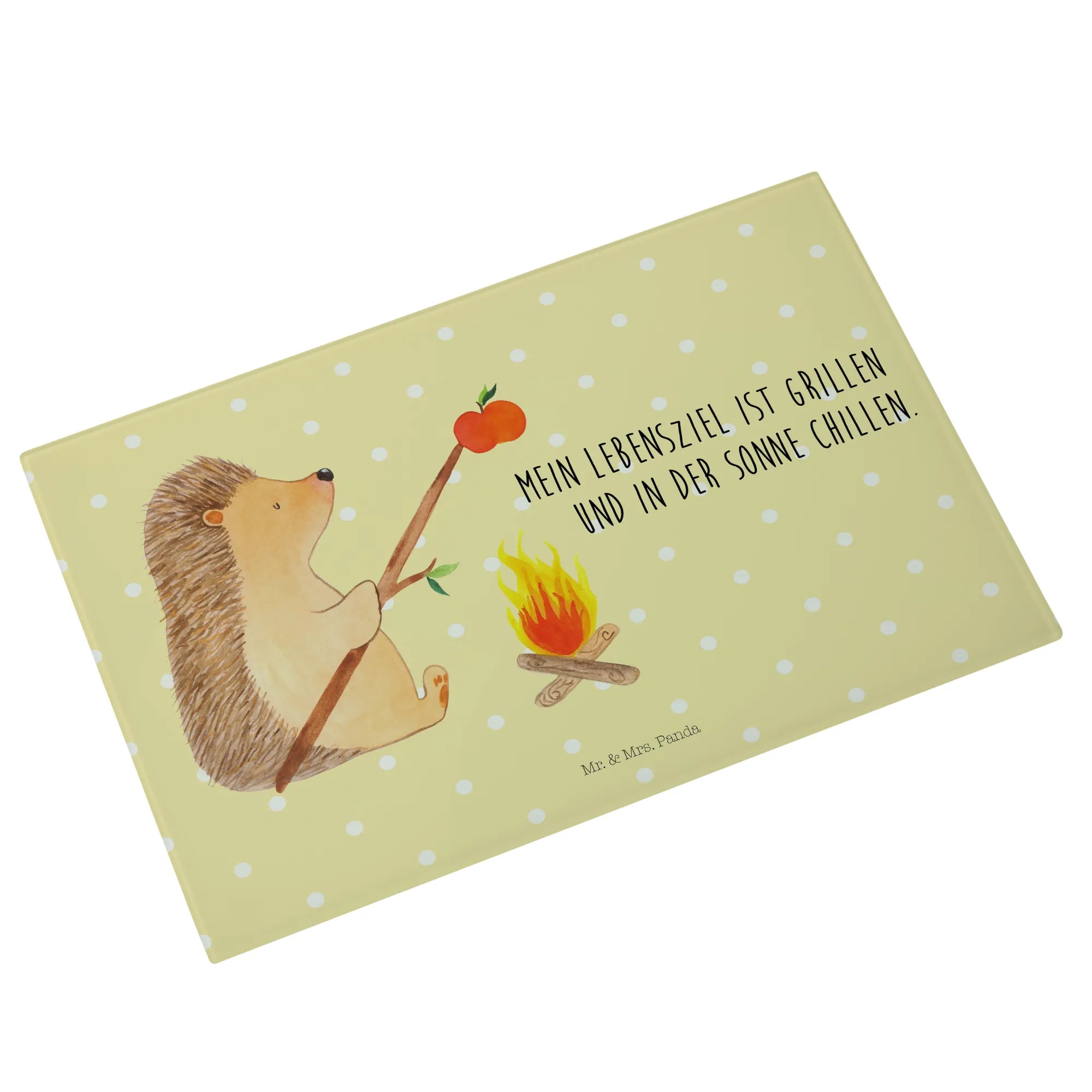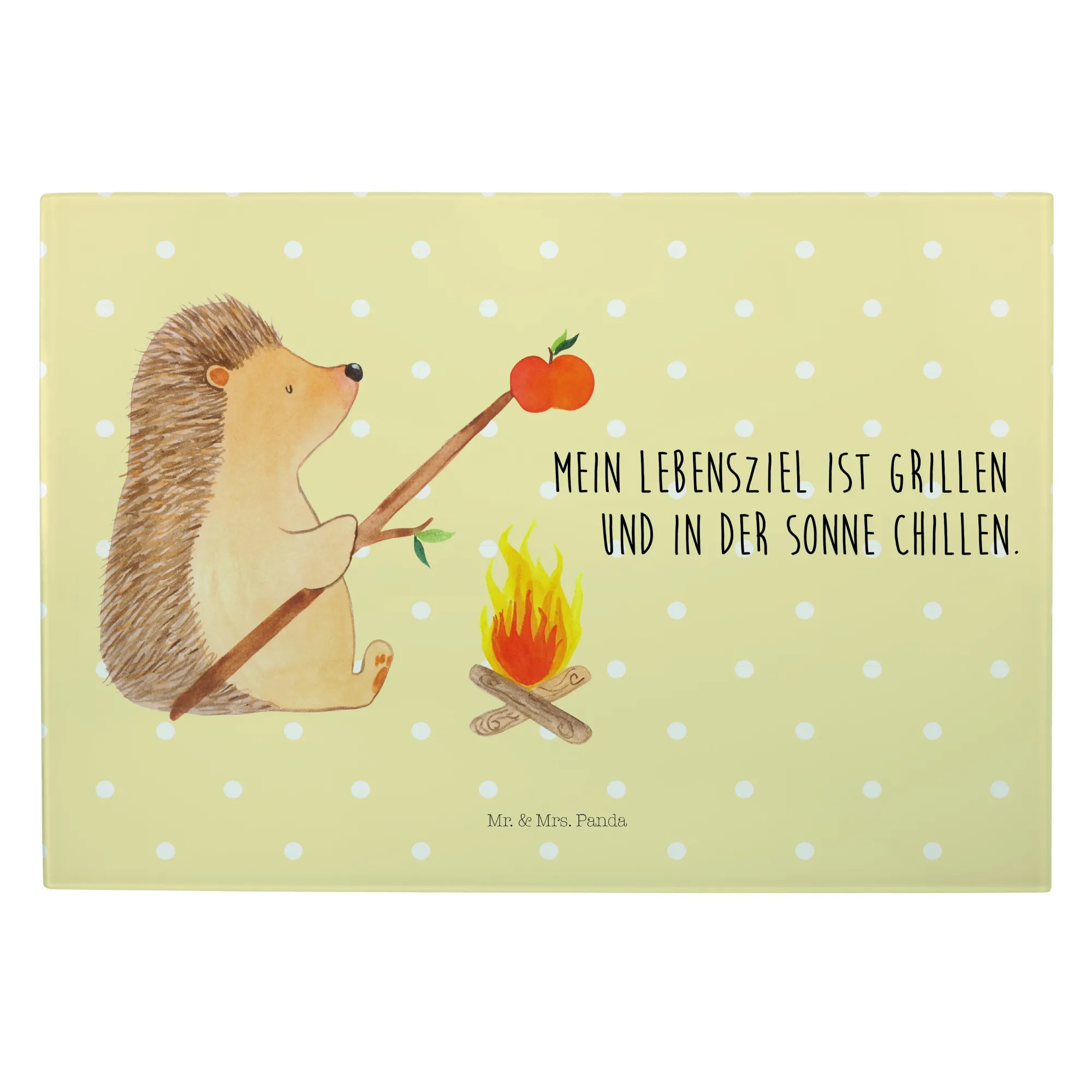Das XL Glas Schneidbrett mit dem süßen Motiv "Igel grillt" aus unserer Small World Kollektion von Mr. & Mrs. Panda ist das perfekte Geschenk für alle, die das Grillen und die guten Dinge im Leben lieben!