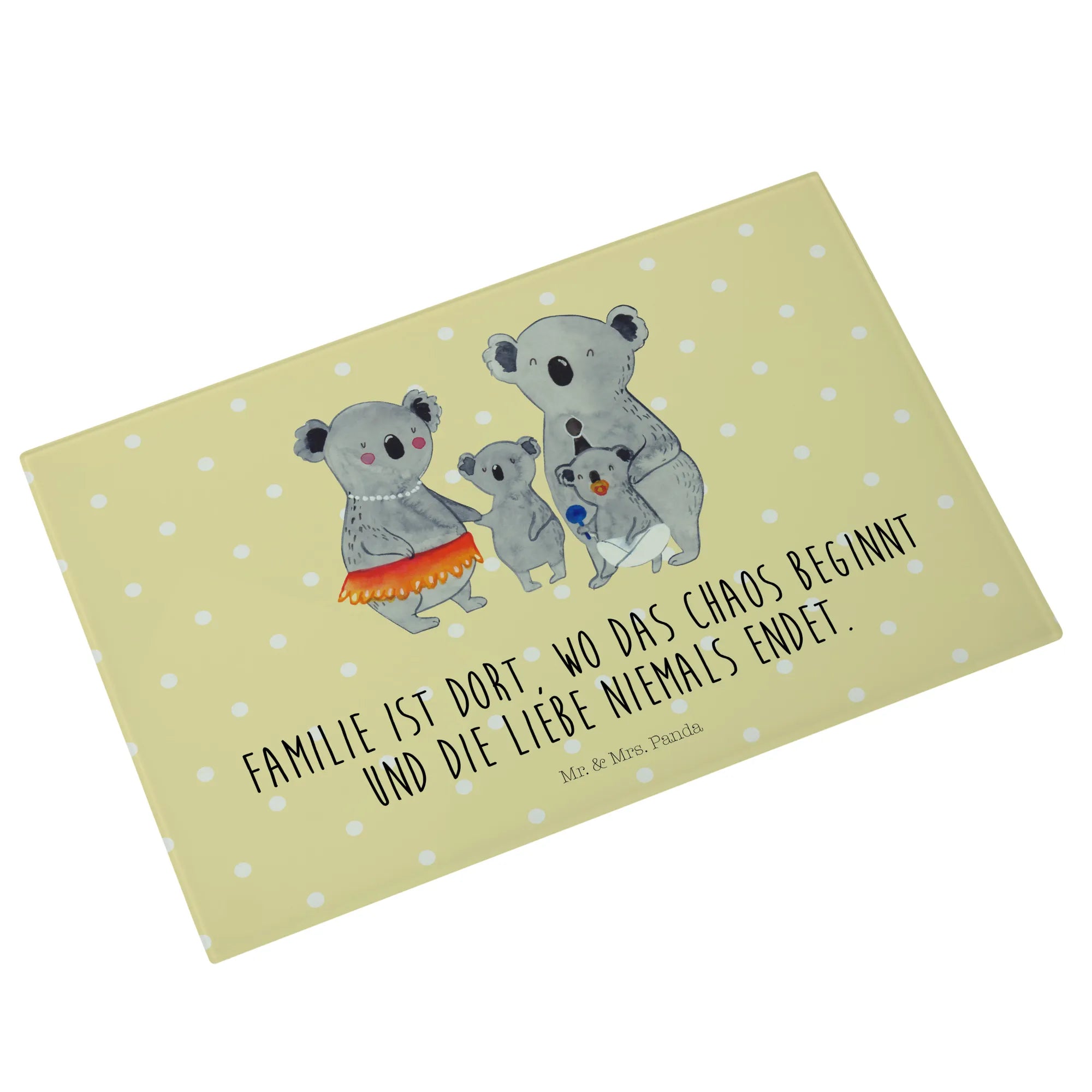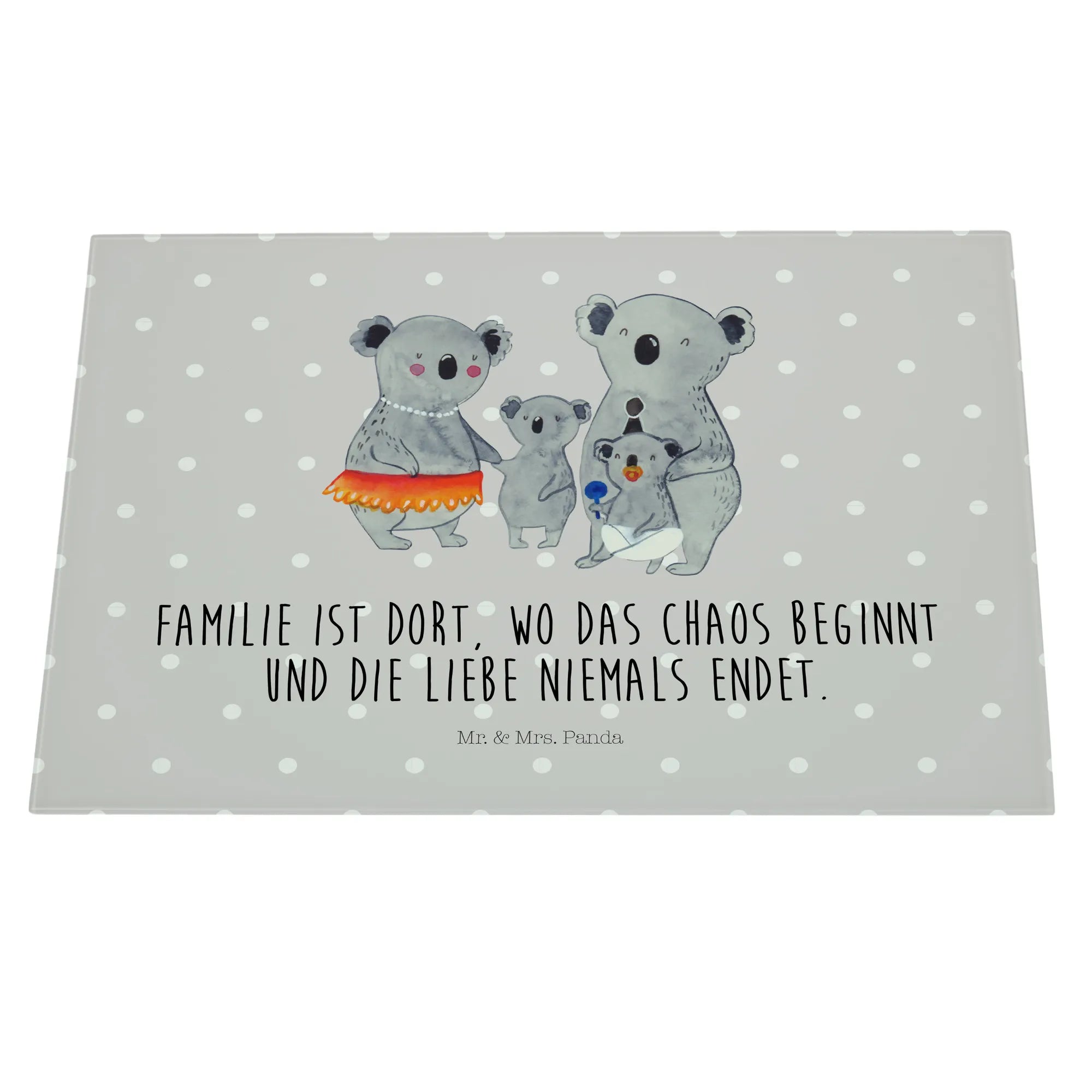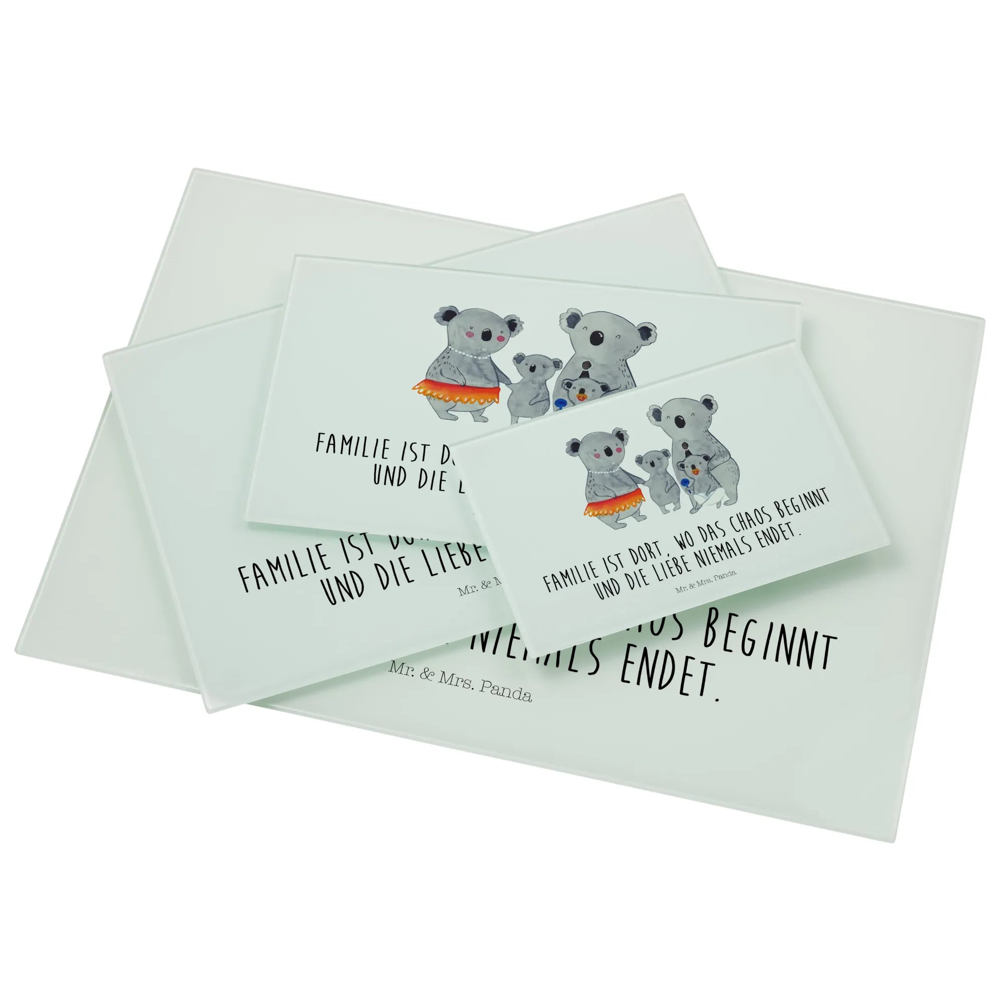 Wenn du auf der Suche nach dem perfekten Geschenk für deine Familie bist, dann ist das Medium Glas Schneidbrett mit dem süßen Koala Familienmotiv von Mr. & Mrs. Panda genau das Richtige! Mit einem herzlichen Slogan wie 'Familie ist dort, wo das Chaos beginnt und die Liebe niemals endet', bringt es viel Liebe und Freude in jede Küche.