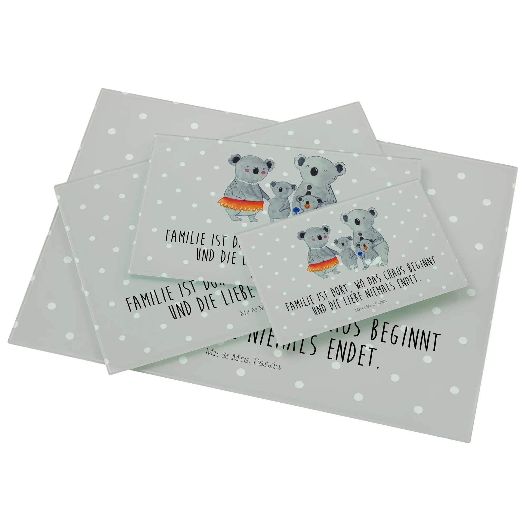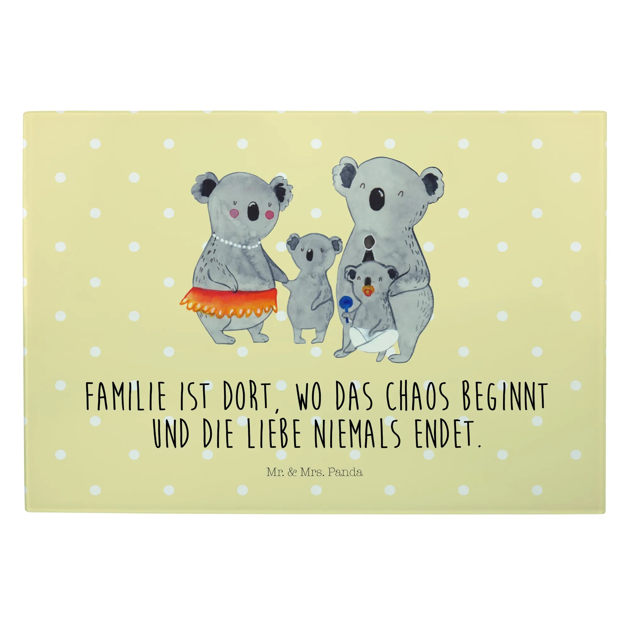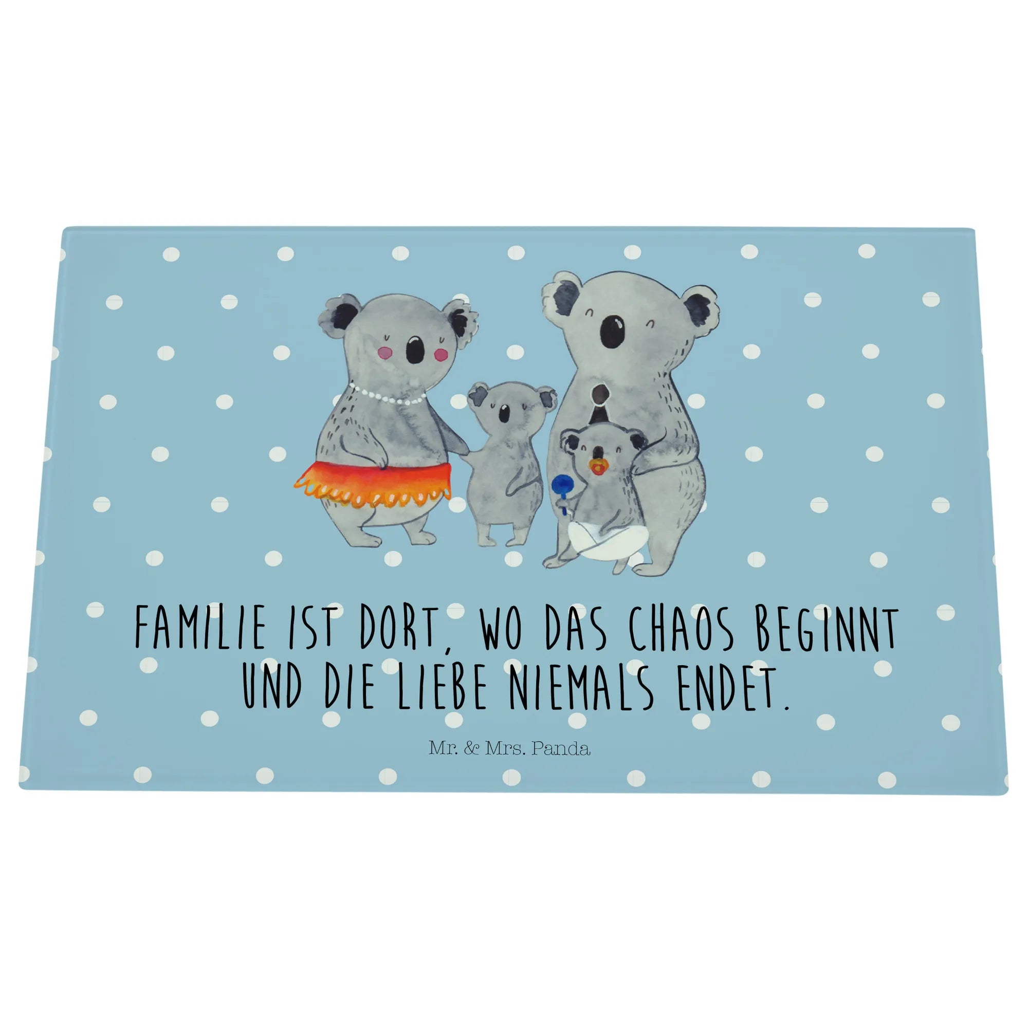Wenn du auf der Suche nach dem perfekten Geschenk für deine Familie bist, dann ist das Medium Glas Schneidbrett mit dem süßen Koala Familienmotiv von Mr. & Mrs. Panda genau das Richtige! Mit einem herzlichen Slogan wie 'Familie ist dort, wo das Chaos beginnt und die Liebe niemals endet', bringt es viel Liebe und Freude in jede Küche.