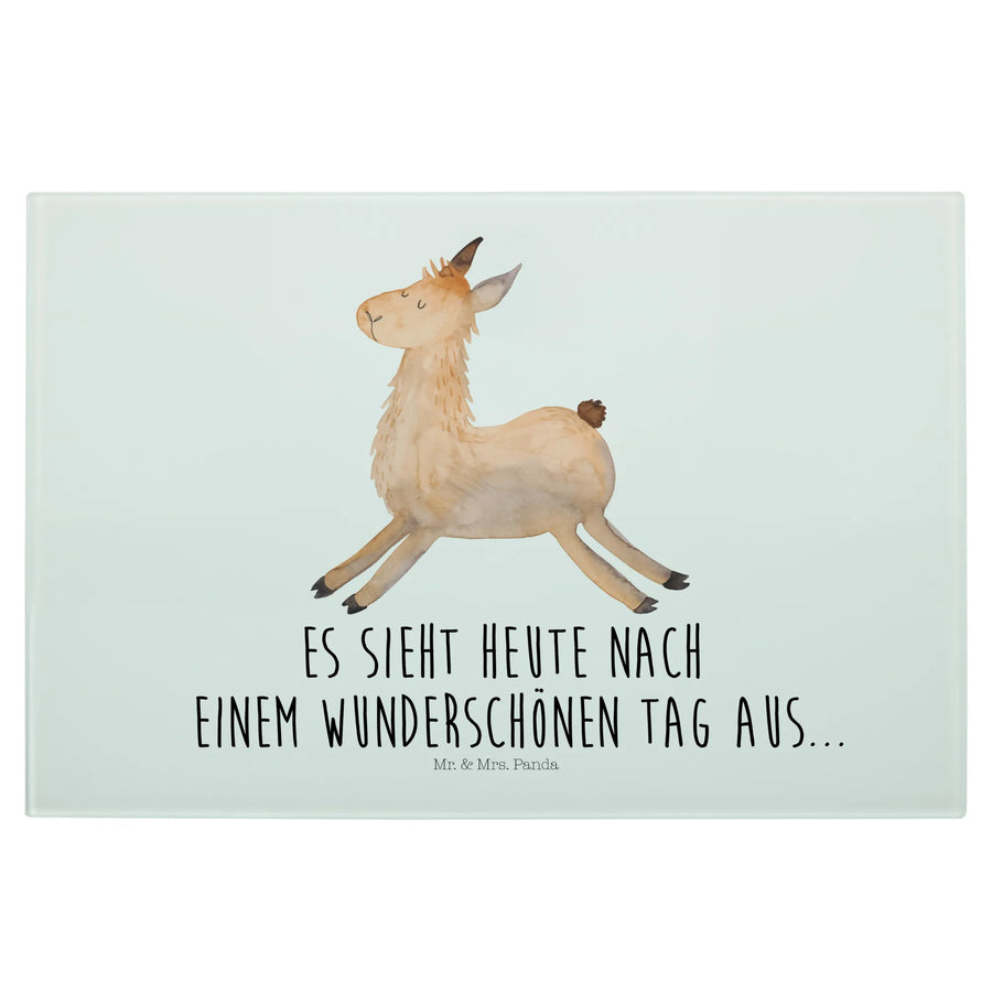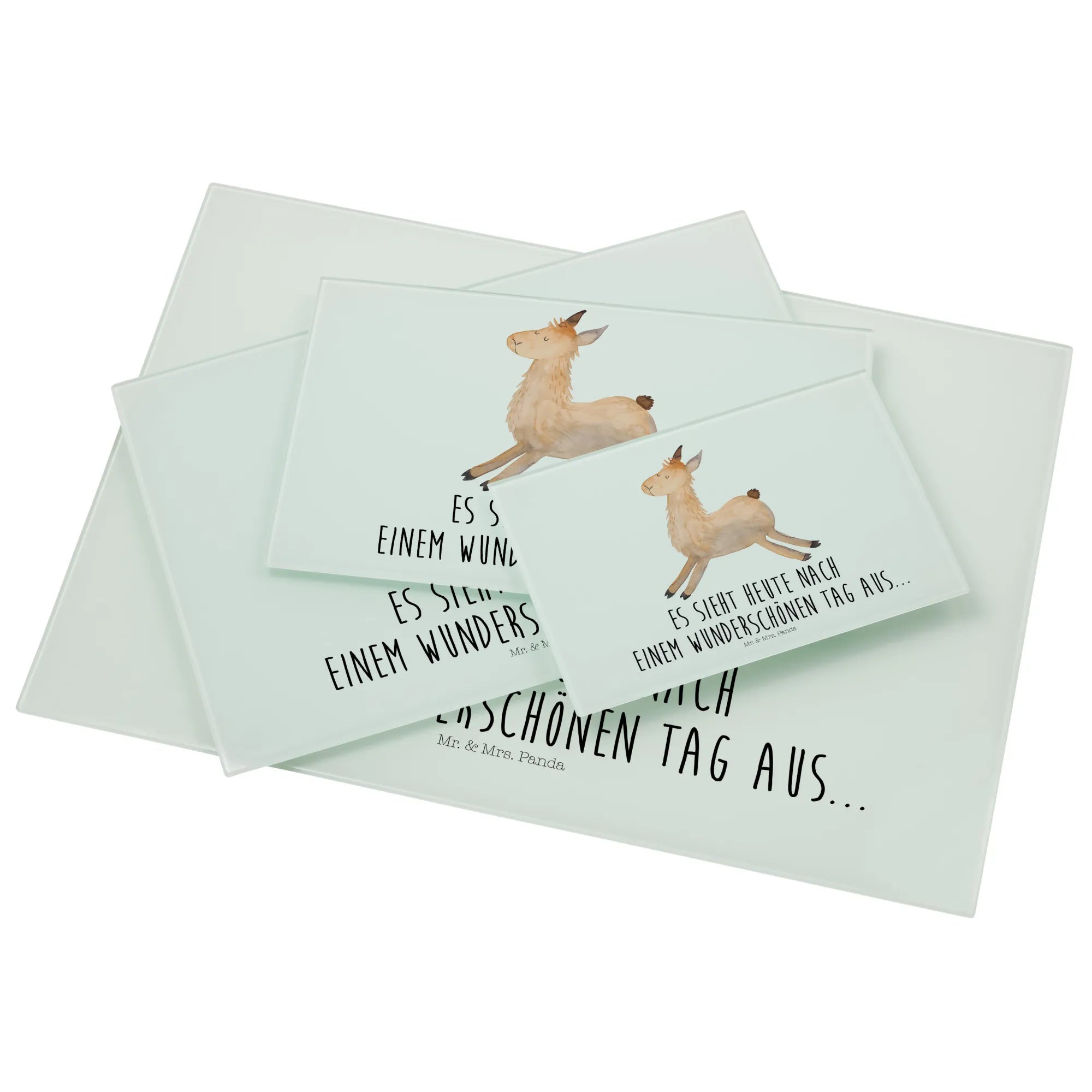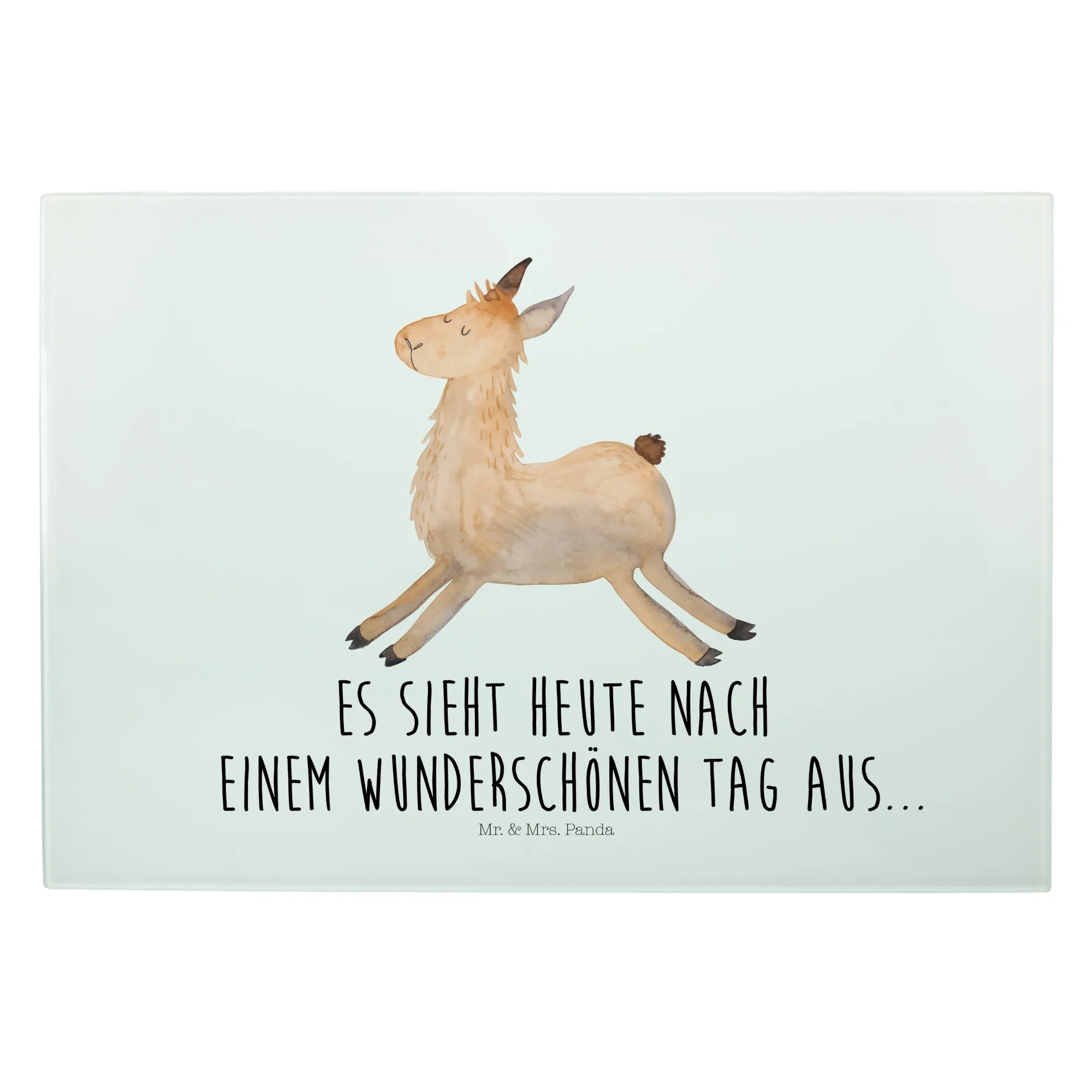 Das Medium Glas Schneidbrett mit dem fröhlichen Lama-Motiv von Mr. & Mrs. Panda ist nicht nur ein praktisches Haushaltsgerät, sondern auch der perfekte Begleiter für deinen Alltag. Mit einem hübschen, springenden Lama, das dir sagt: "Es sieht heute nach einem wunderschönen Tag aus...", zaubert es dir direkt ein Lächeln auf die Lippen, während du in deiner Küche werkelst.