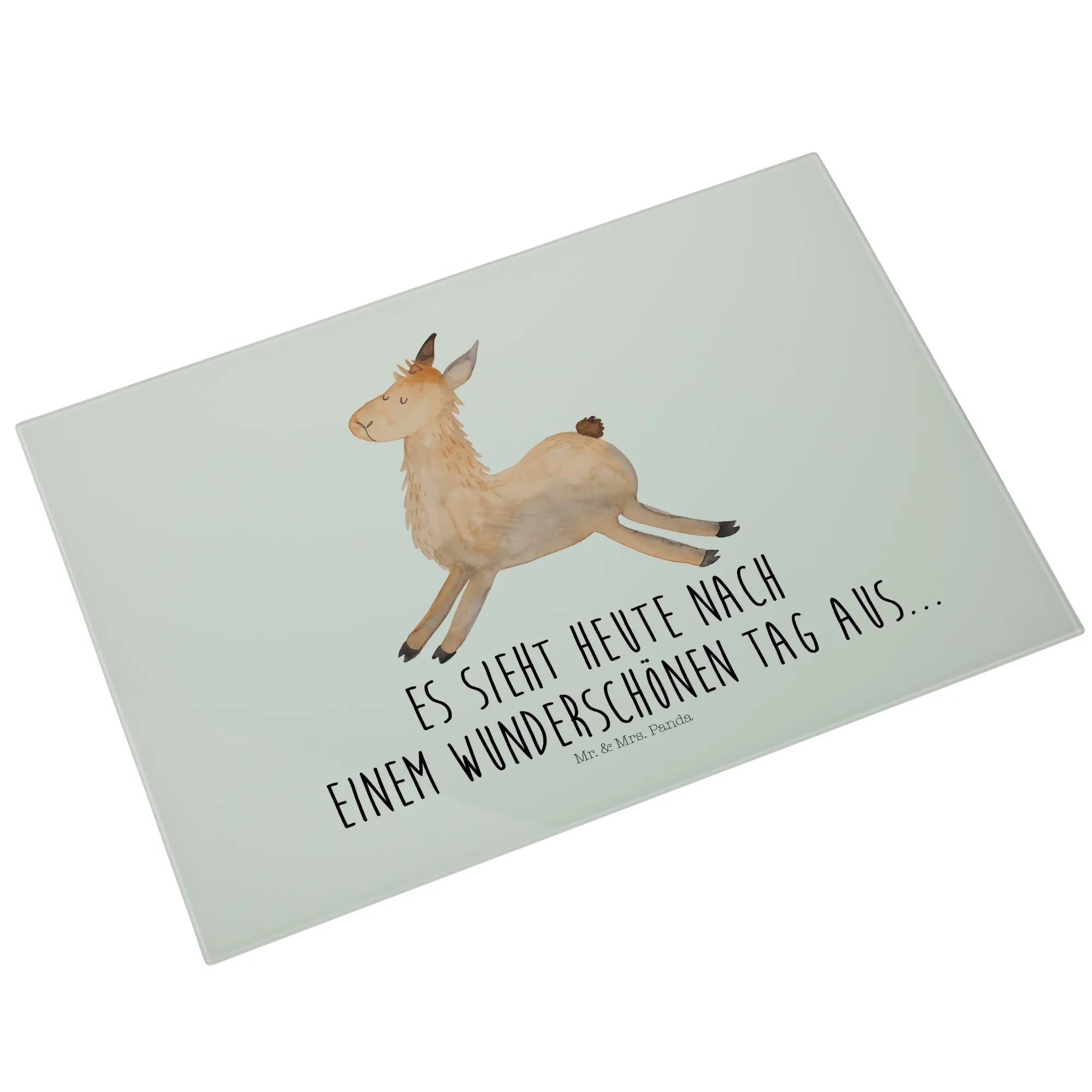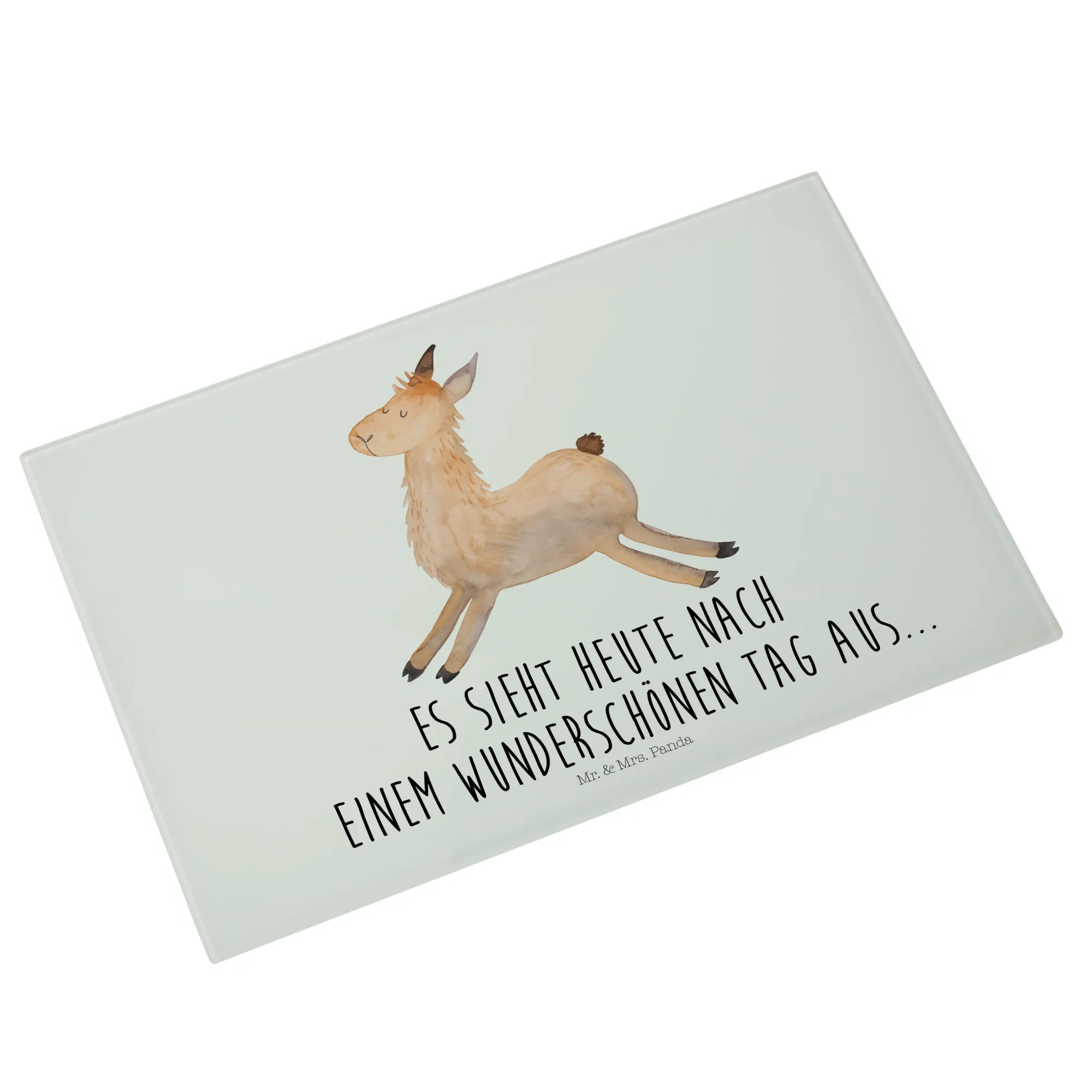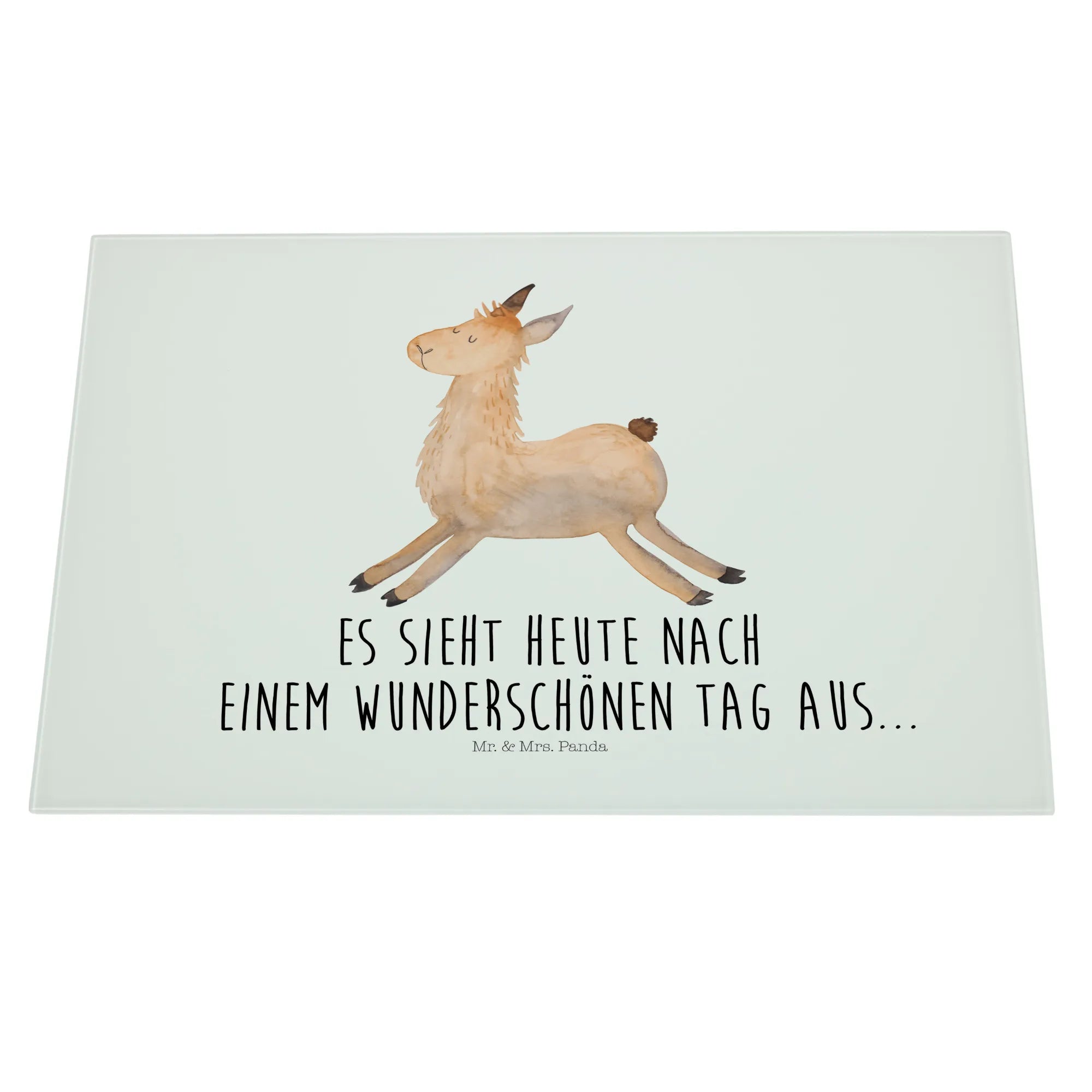 Das Medium Glas Schneidbrett mit dem fröhlichen Lama-Motiv von Mr. & Mrs. Panda ist nicht nur ein praktisches Haushaltsgerät, sondern auch der perfekte Begleiter für deinen Alltag. Mit einem hübschen, springenden Lama, das dir sagt: "Es sieht heute nach einem wunderschönen Tag aus...", zaubert es dir direkt ein Lächeln auf die Lippen, während du in deiner Küche werkelst.