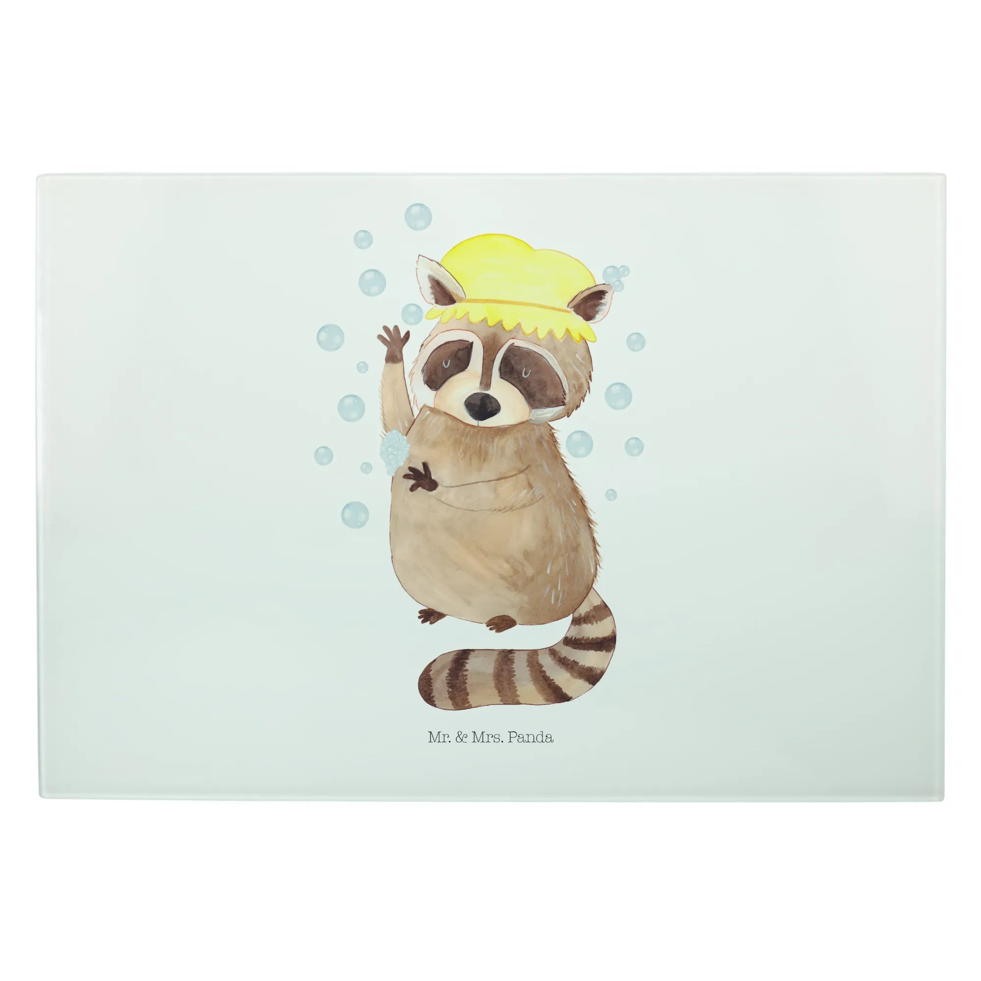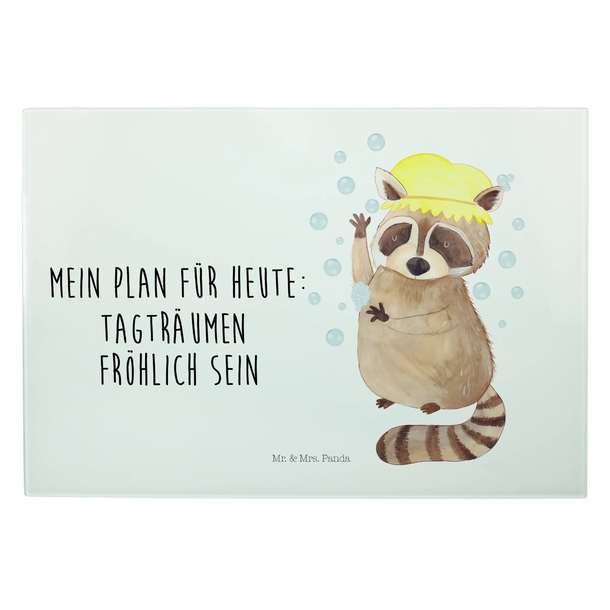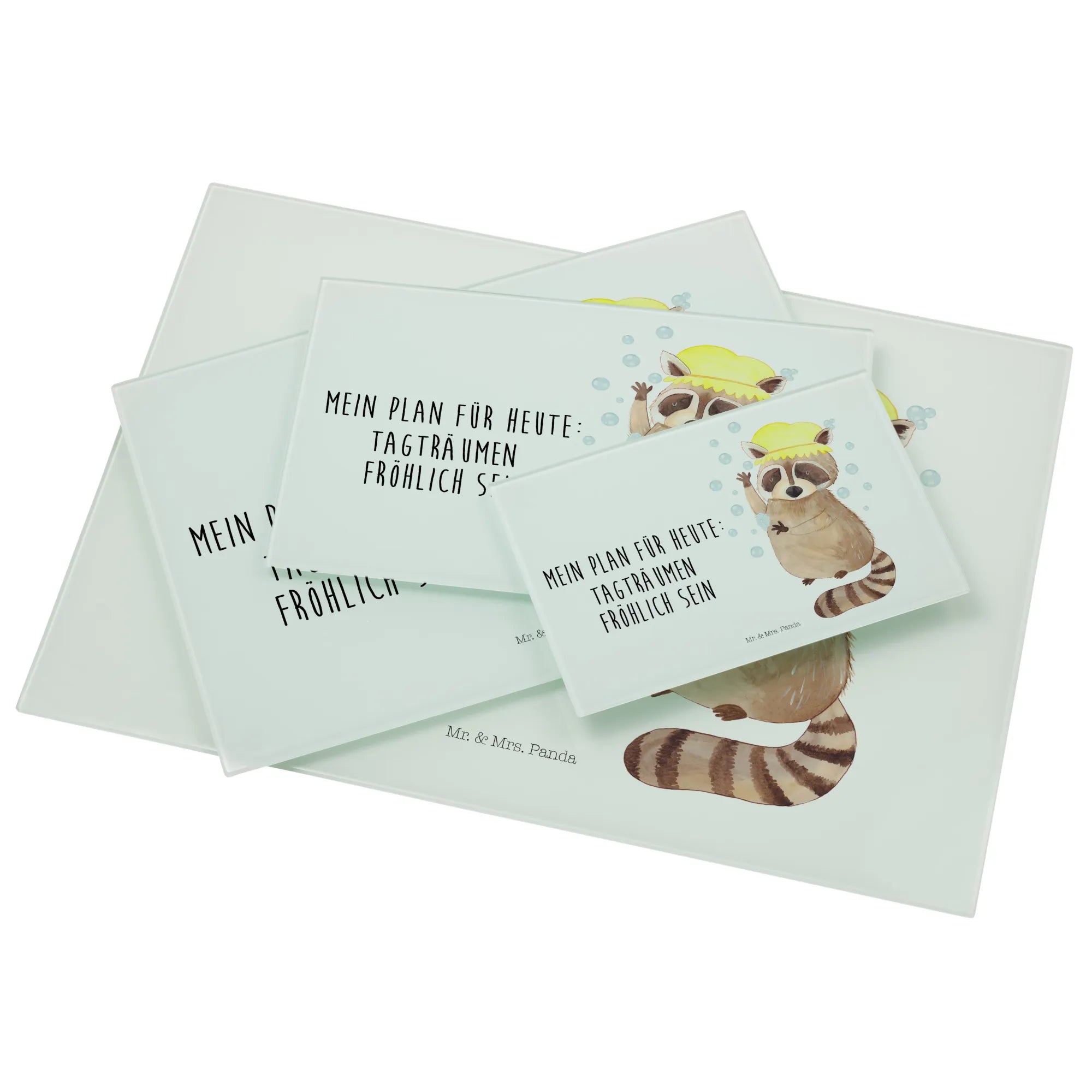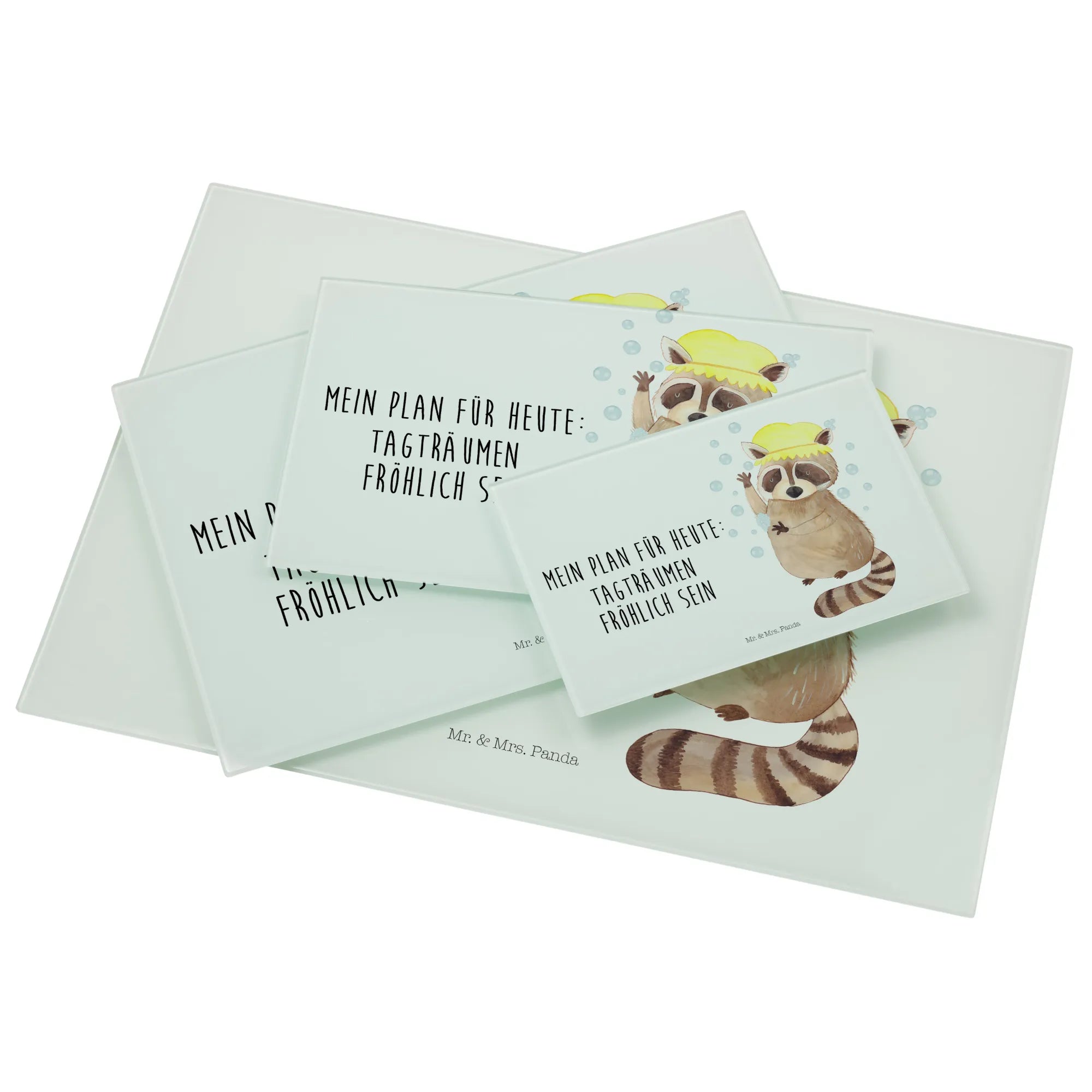 Das wunderschöne Medium Glas Schneidbrett mit dem fröhlichen Waschbär-Motiv von Mr. & Mrs. Panda ist der perfekte Begleiter in deiner Küche.