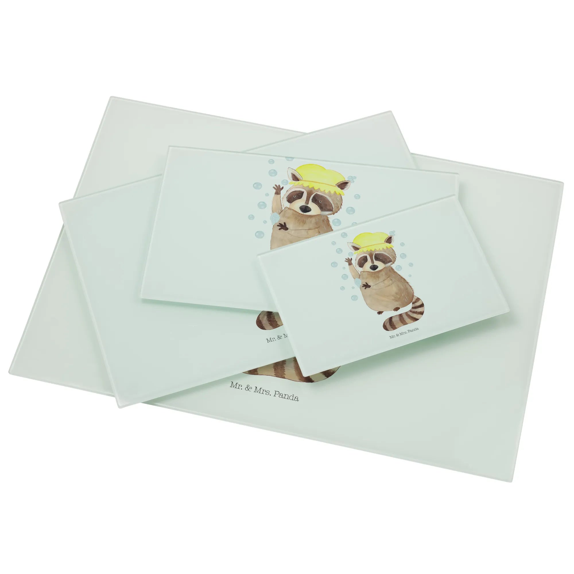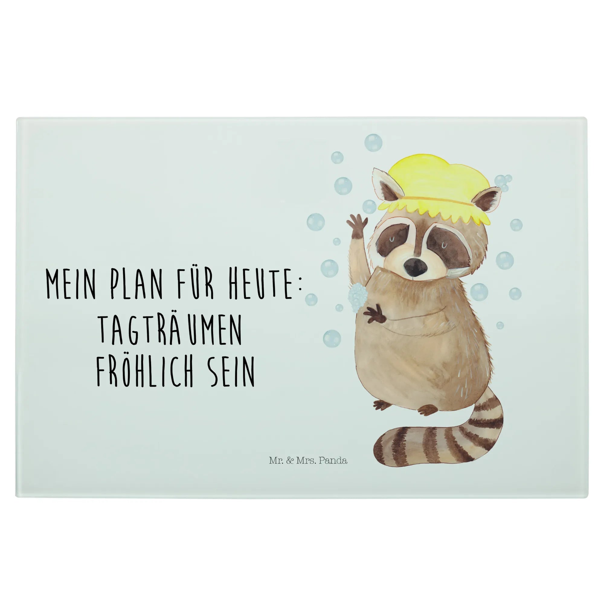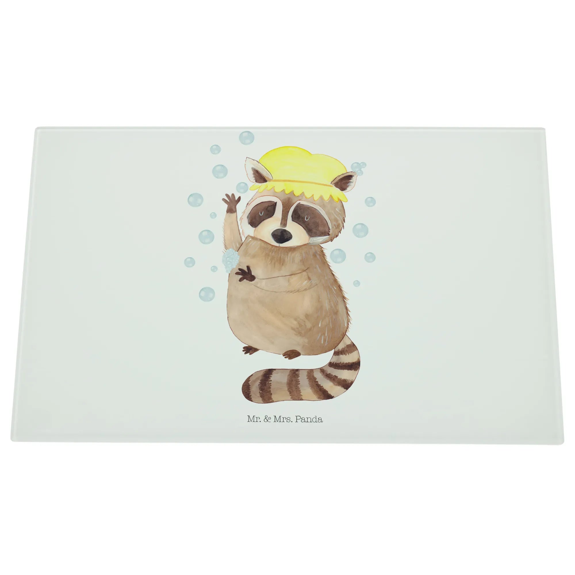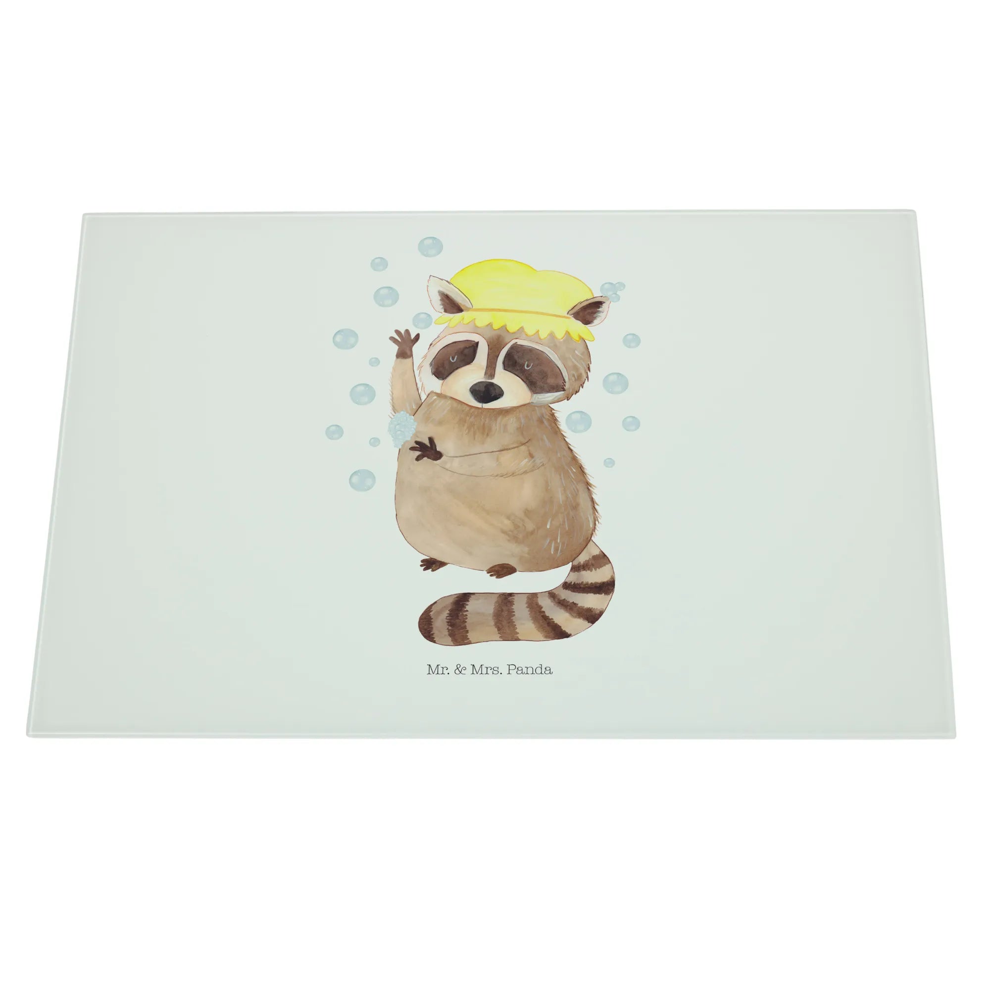 Das wunderschöne Medium Glas Schneidbrett mit dem fröhlichen Waschbär-Motiv von Mr. & Mrs. Panda ist der perfekte Begleiter in deiner Küche.