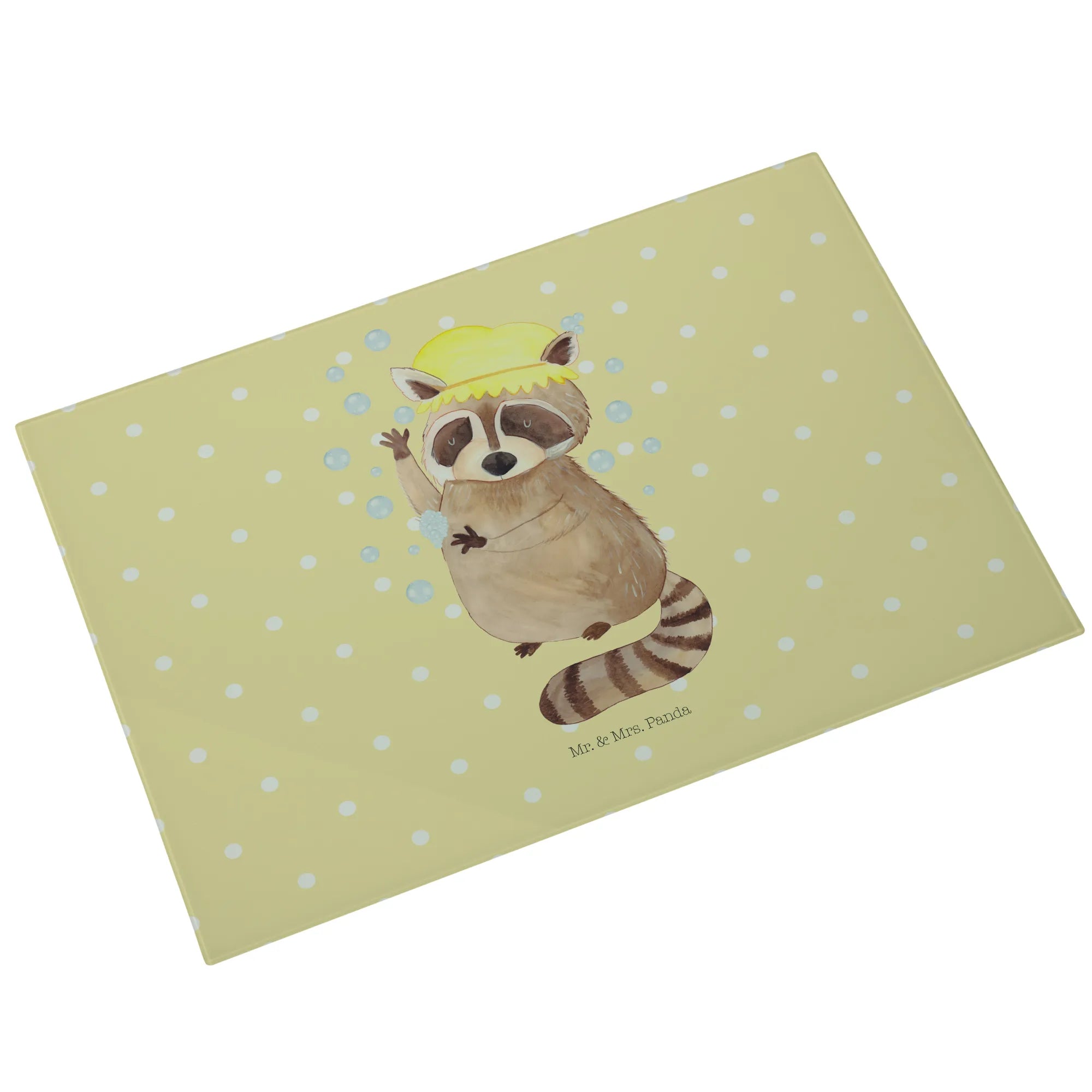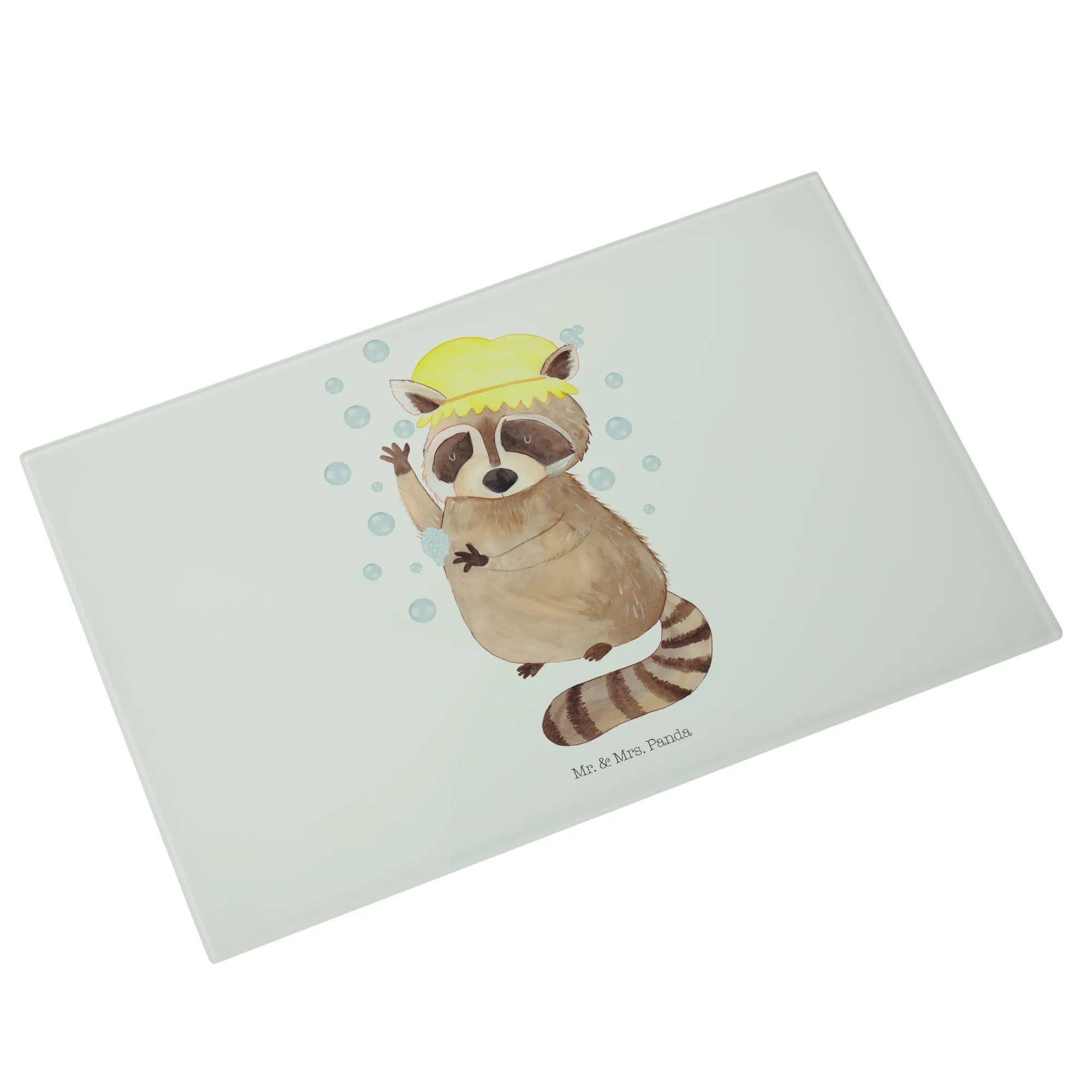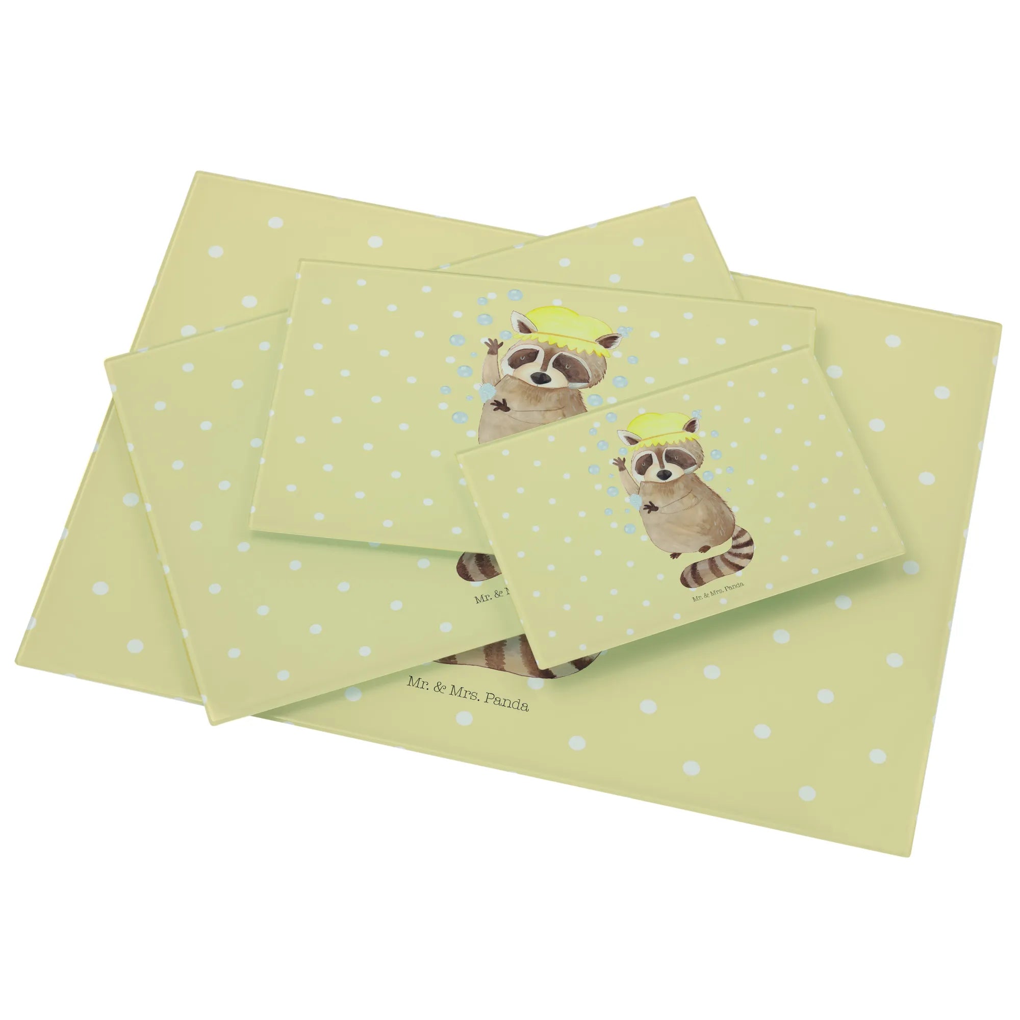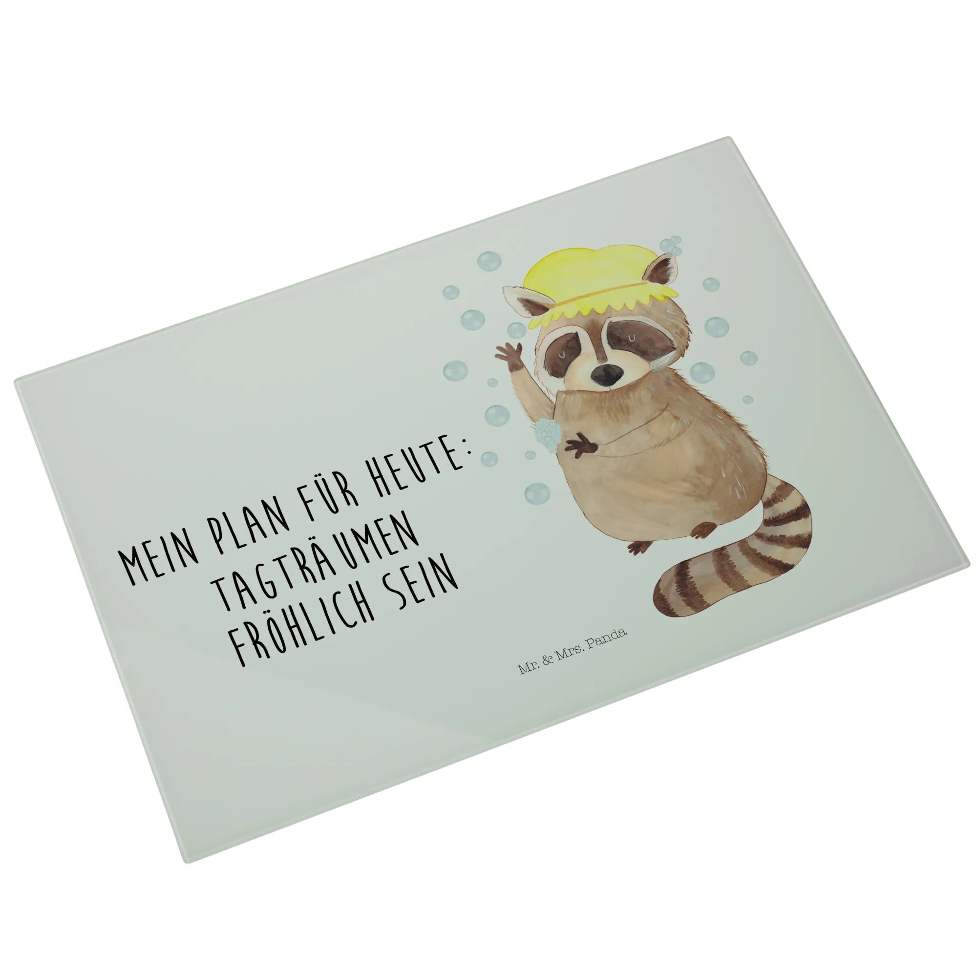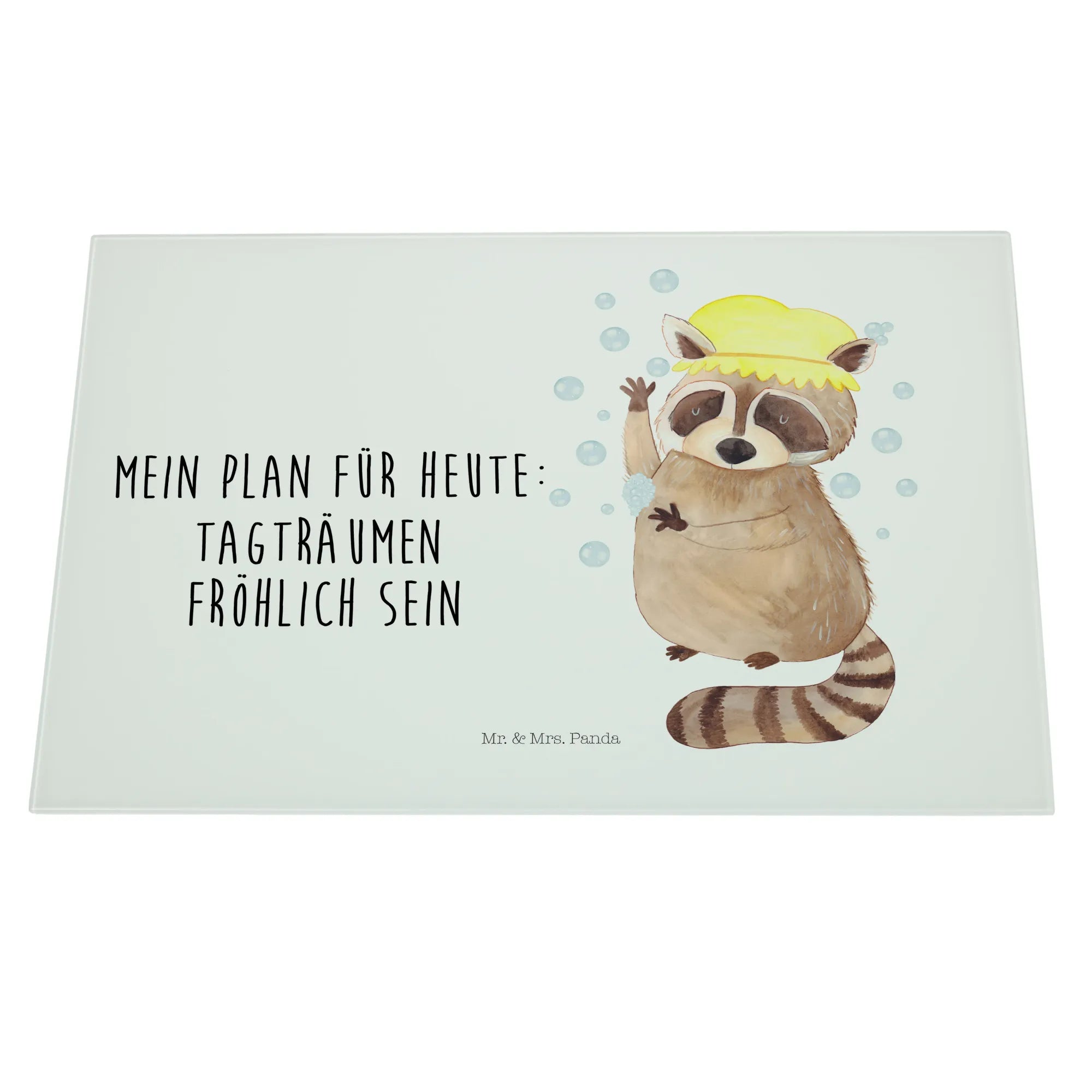 Das wunderschöne Medium Glas Schneidbrett mit dem fröhlichen Waschbär-Motiv von Mr. & Mrs. Panda ist der perfekte Begleiter in deiner Küche.