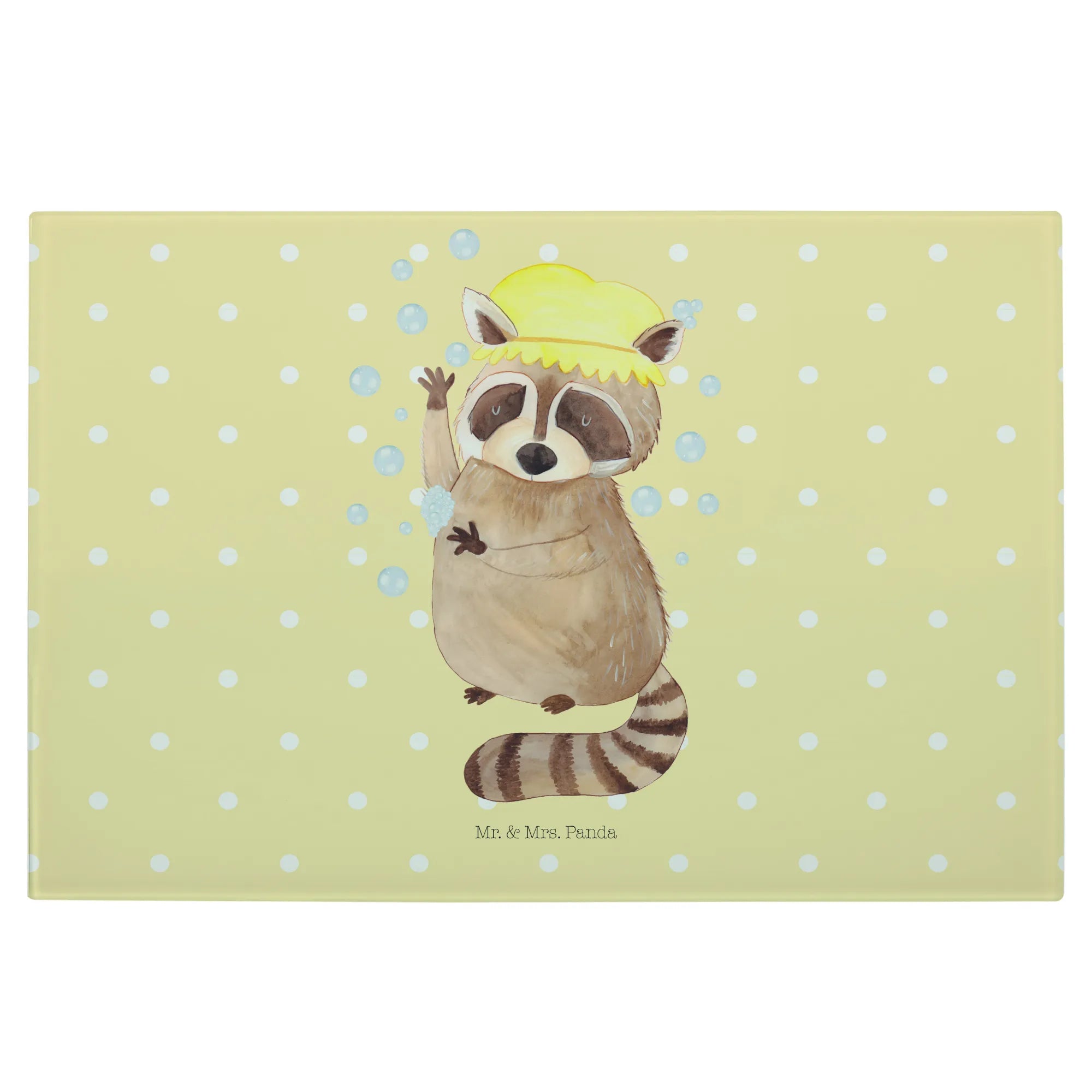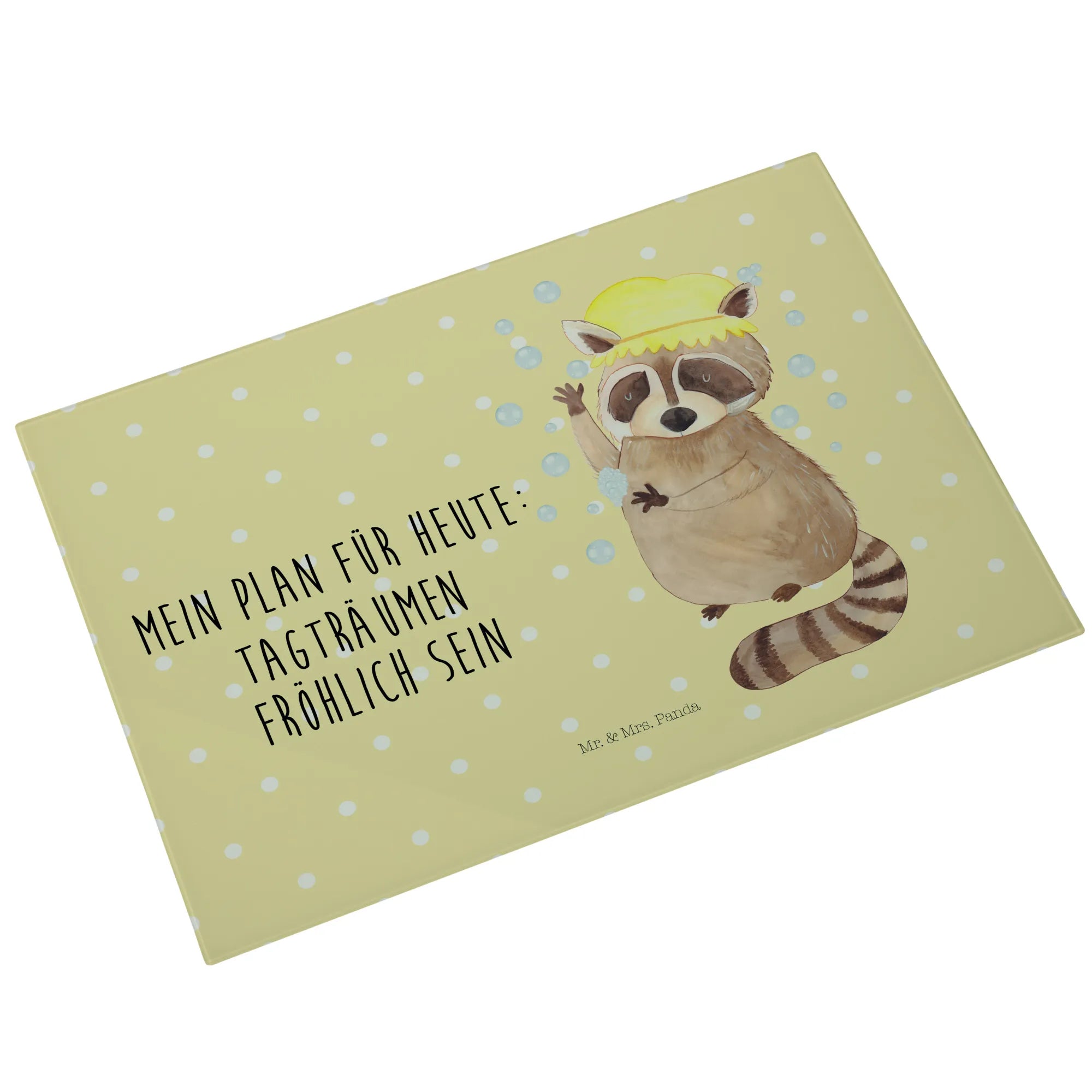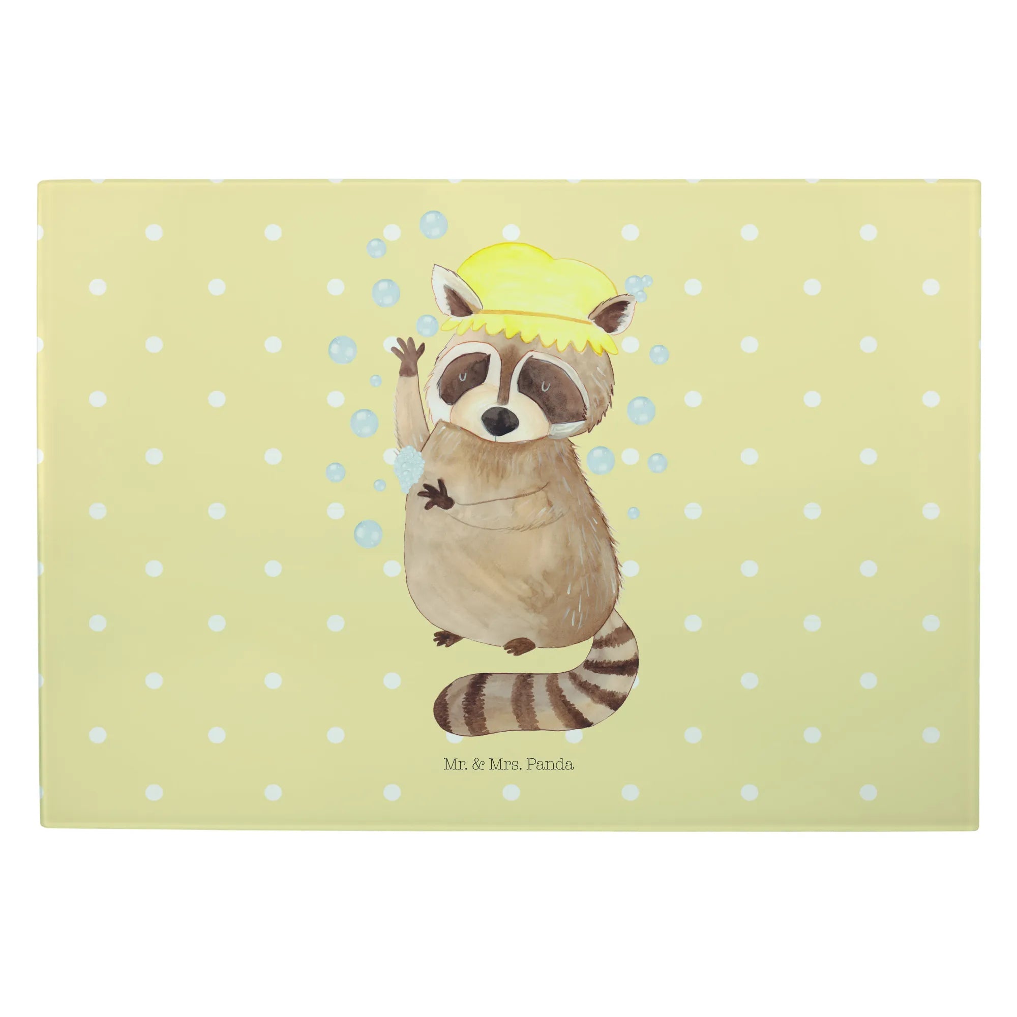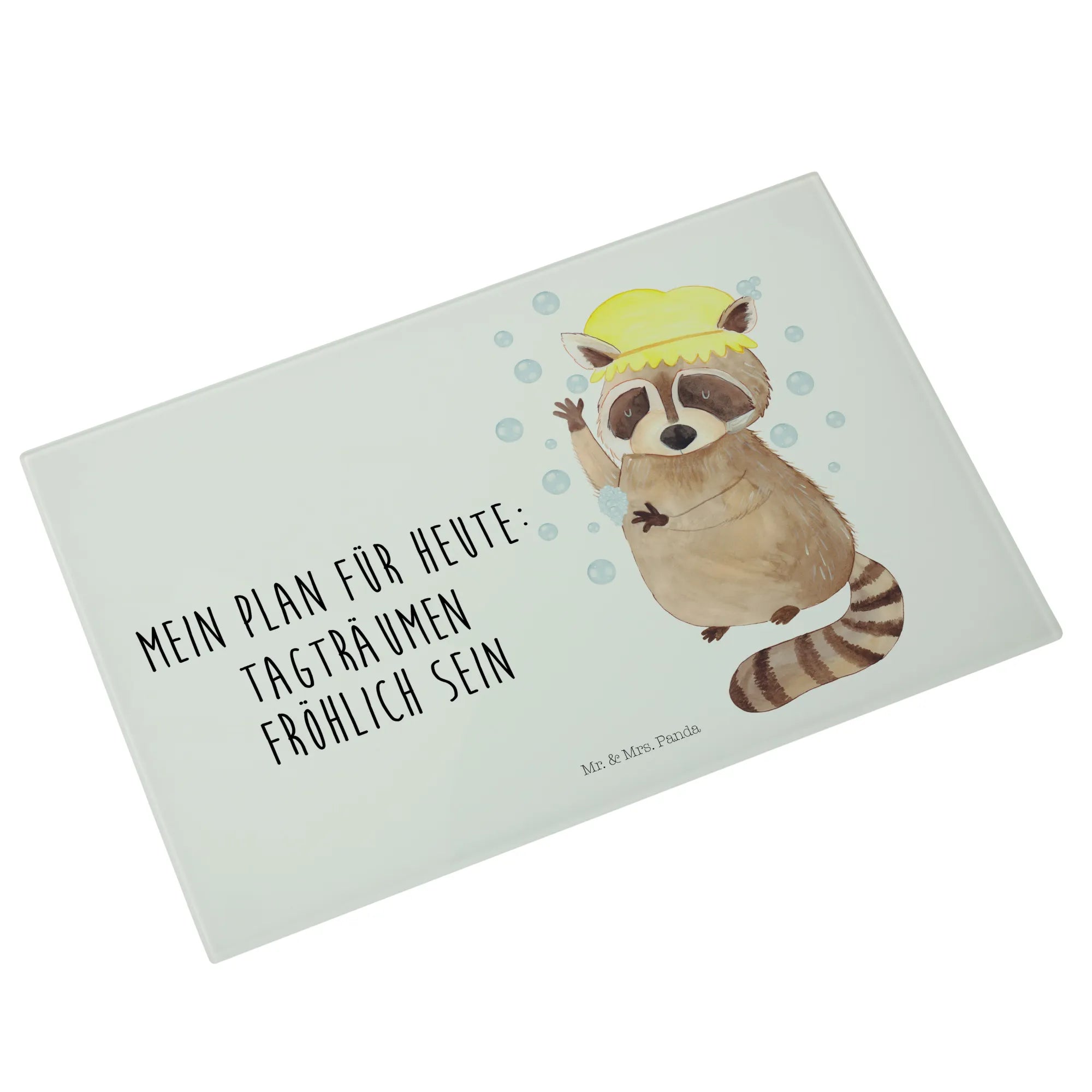Das wunderschöne Medium Glas Schneidbrett mit dem fröhlichen Waschbär-Motiv von Mr. & Mrs. Panda ist der perfekte Begleiter in deiner Küche.