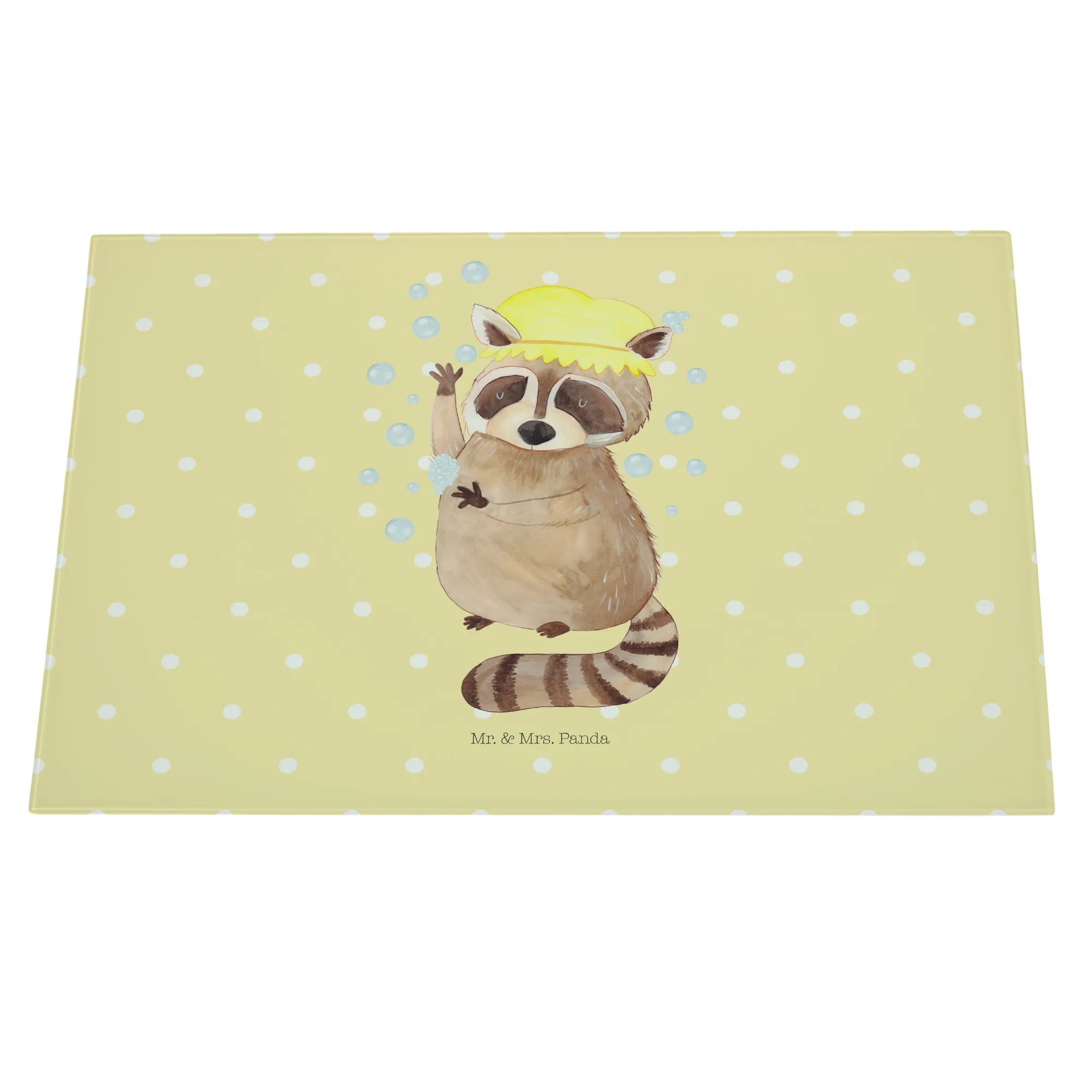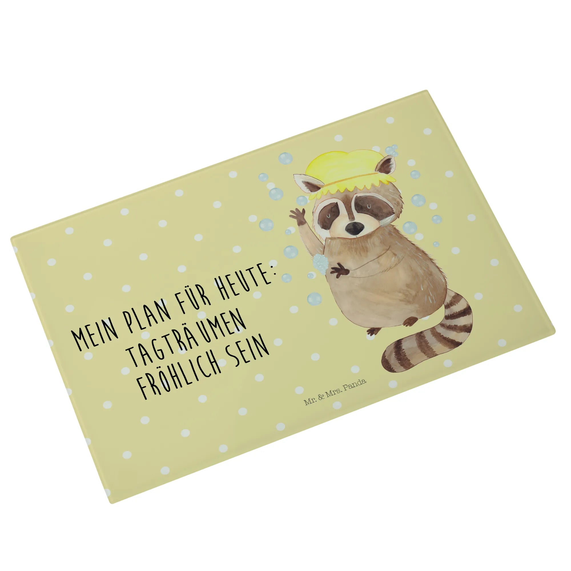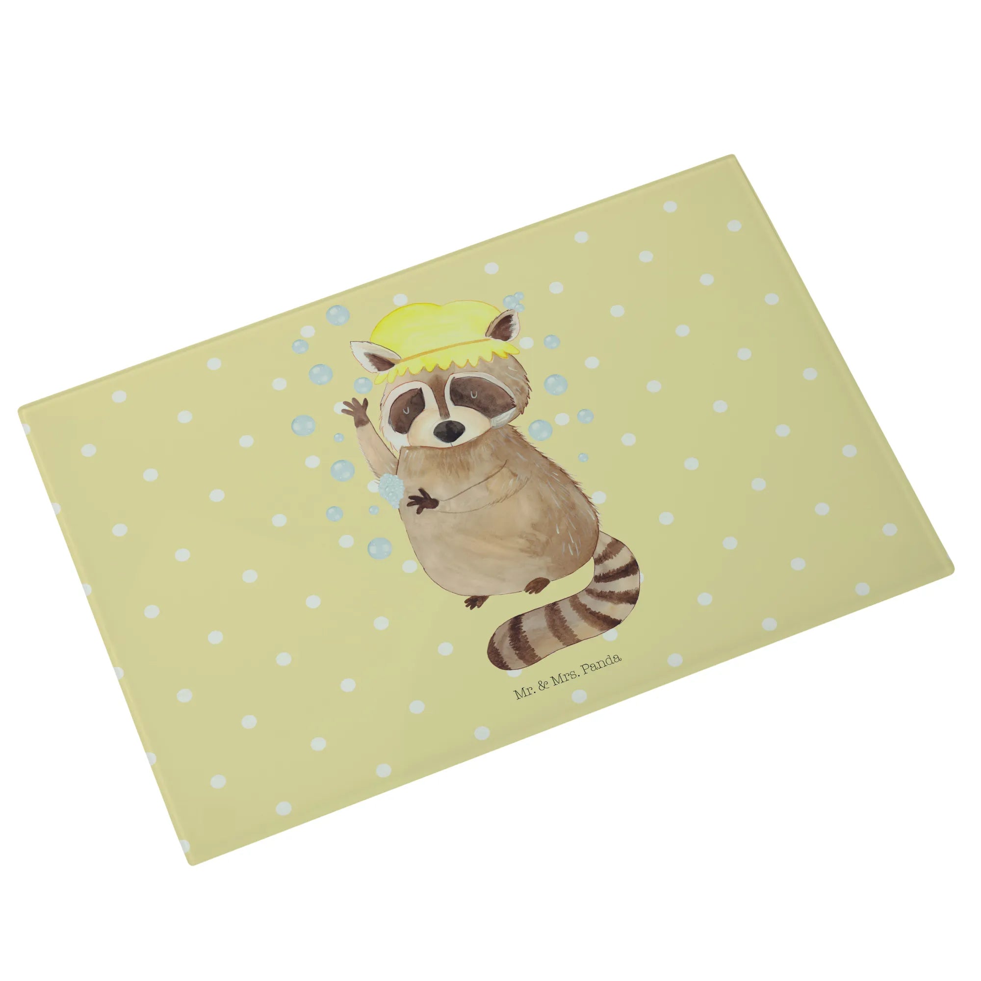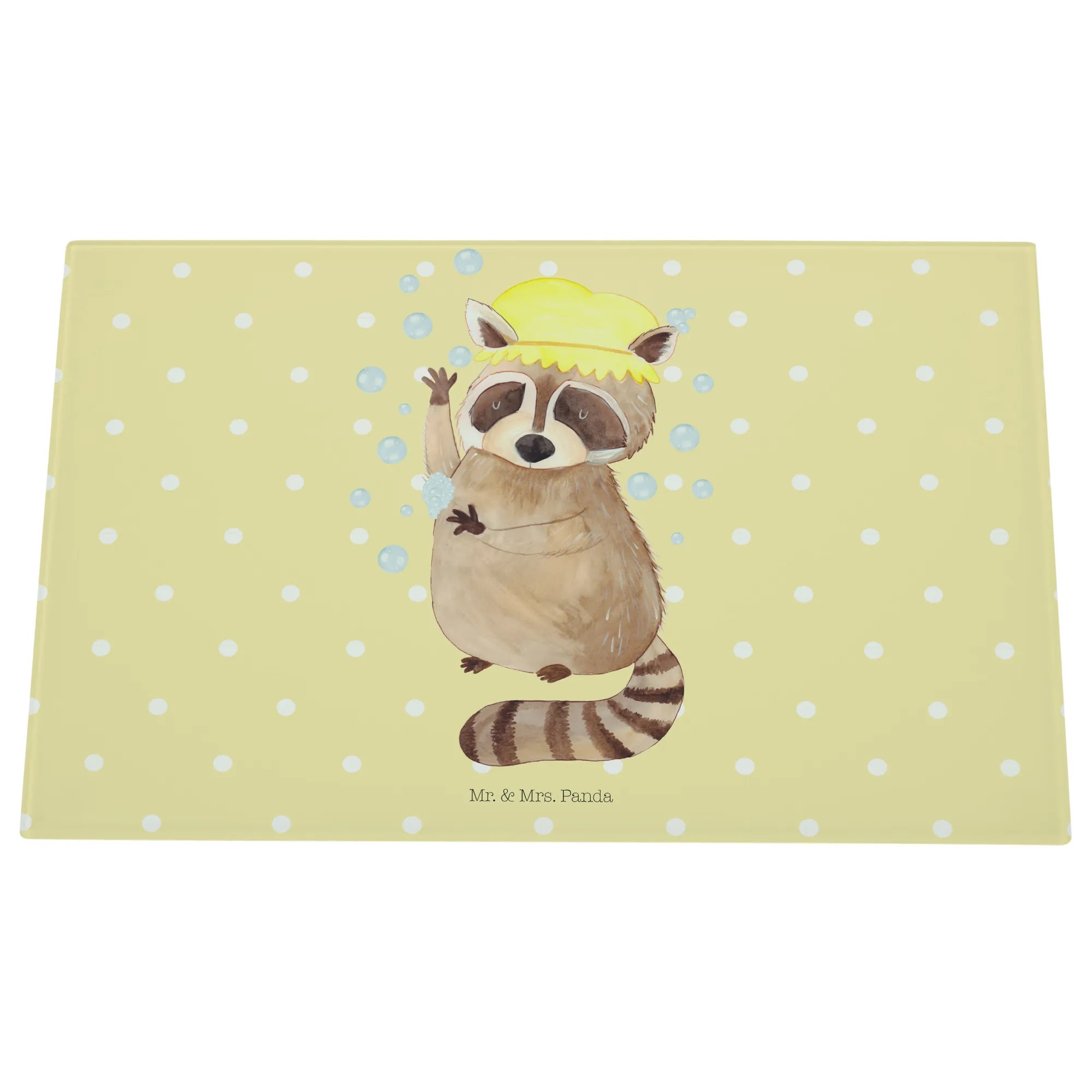 Das wunderschöne Medium Glas Schneidbrett mit dem fröhlichen Waschbär-Motiv von Mr. & Mrs. Panda ist der perfekte Begleiter in deiner Küche.