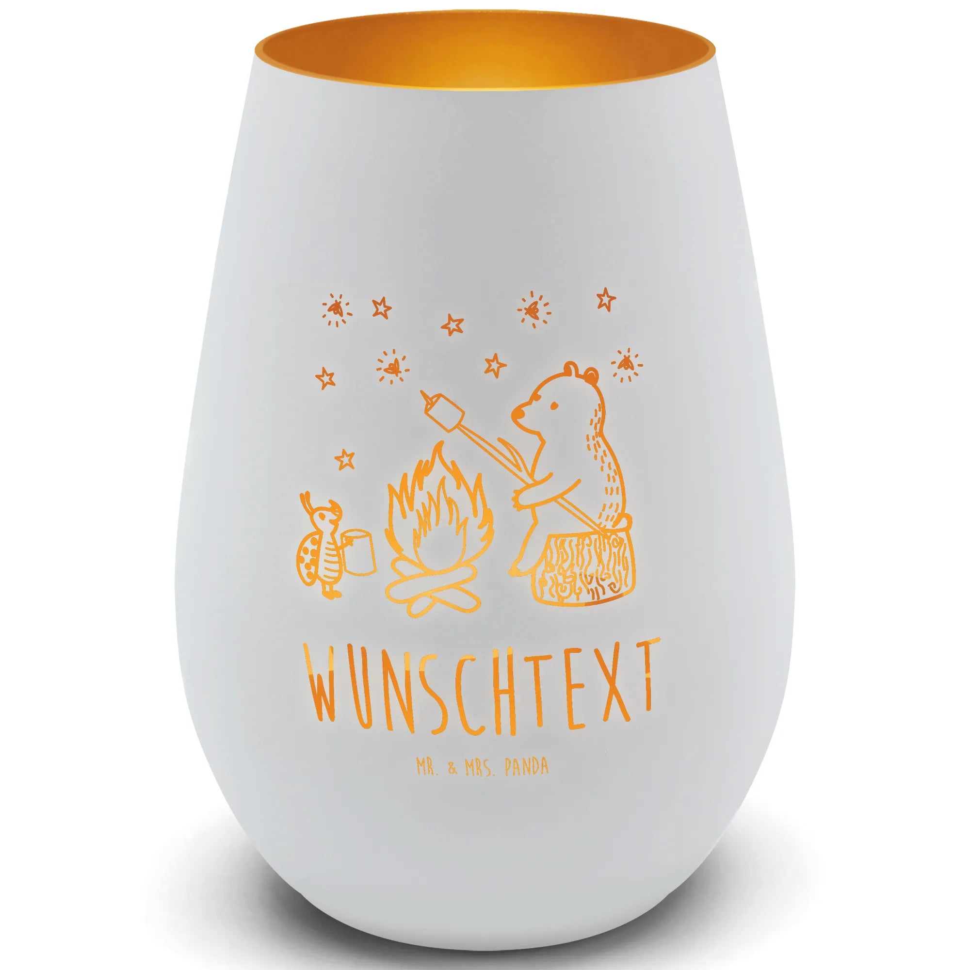 Du suchst nach dem perfekten Geschenk, um deinem Liebsten oder deiner Liebsten einen wunderschönen Moment zu bescheren? Unser Gold Windlicht Personalisiert mit dem bezaubernden Motiv "Bär & Marienkäfer Lagerfeuer" ist genau das Richtige für dich! Das Windlicht besticht nicht nur durch sein edles, personalisierbares Design, sondern auch durch die herzliche Botschaft: "Klar kann man dem Glück hinterher jagen. Man kann es sich aber auch am Lagerfeuer gemütlich machen und das Glück einfach genießen."