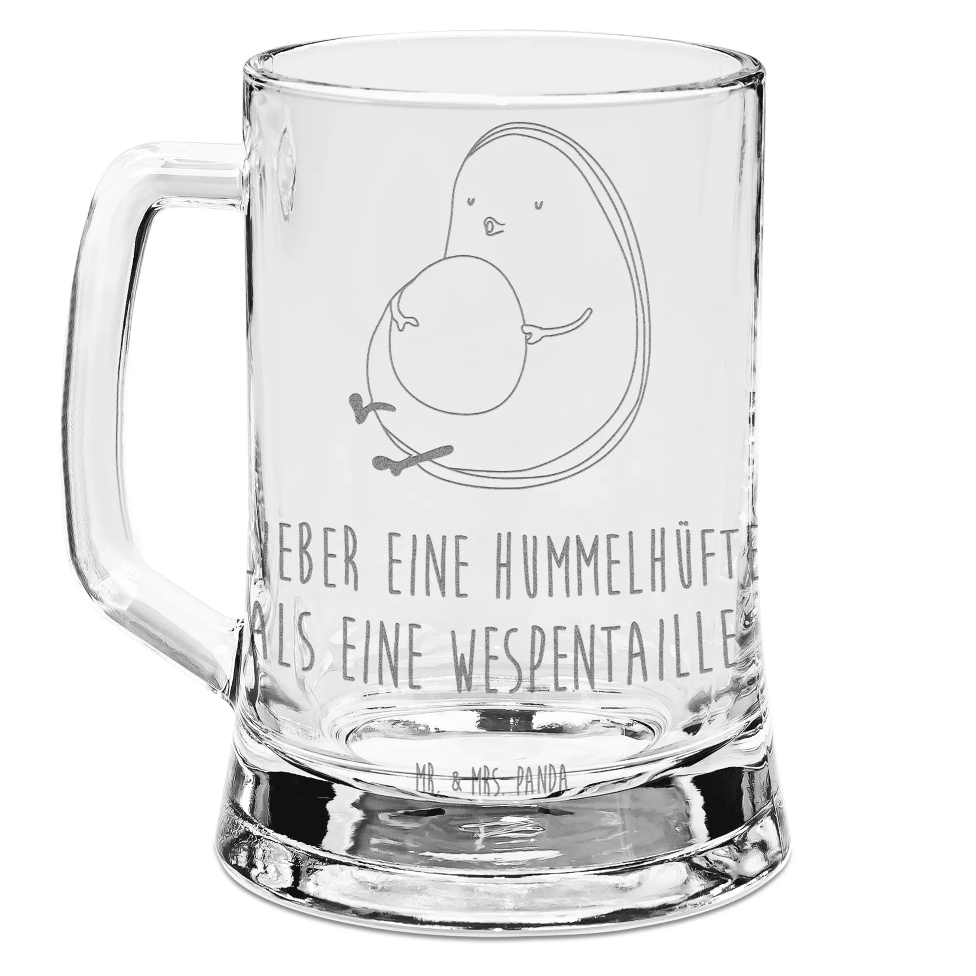 Mit seiner hochwertigen Lasergravur zeigt der Bierkrug eine niedliche Avocado, die pfeift und sich ihren dicken Kern hält. Dazu kommt der spritzige Slogan: "Lieber eine Hummelhüfte als eine Wespentaille", der allen, die Wert auf eine gesunde Ernährung legen, ein Lächeln ins Gesicht zaubert.