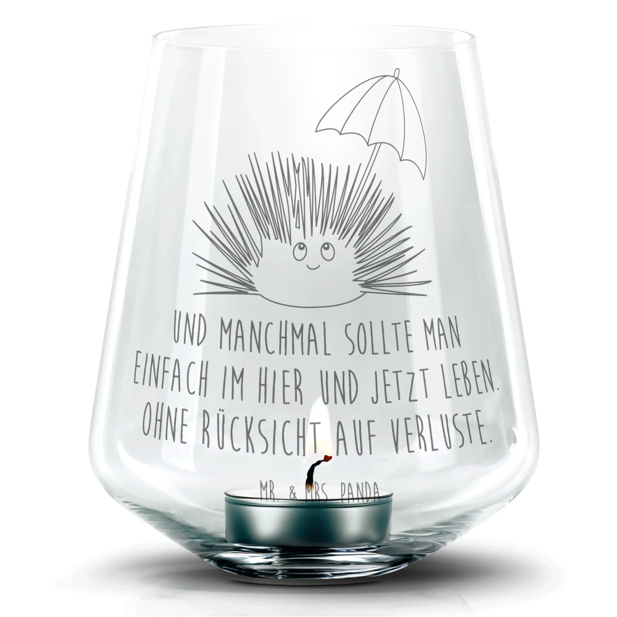 Das wunderschöne Gravur Windlicht mit dem niedlichen Seeigel-Motiv aus der Meerestiere Kollektion von Mr. & Mrs. Panda ist das perfekte Geschenk für all jene, die den Zauber des Meeres lieben! Mit seinem charmanten Design und dem ansprechenden Slogan 'Und manchmal sollte man einfach im Hier und Jetzt leben. Ohne Rücksicht auf Verluste.' inspiriert dieses Teelichtglas dazu, jeden Augenblick zu genießen.