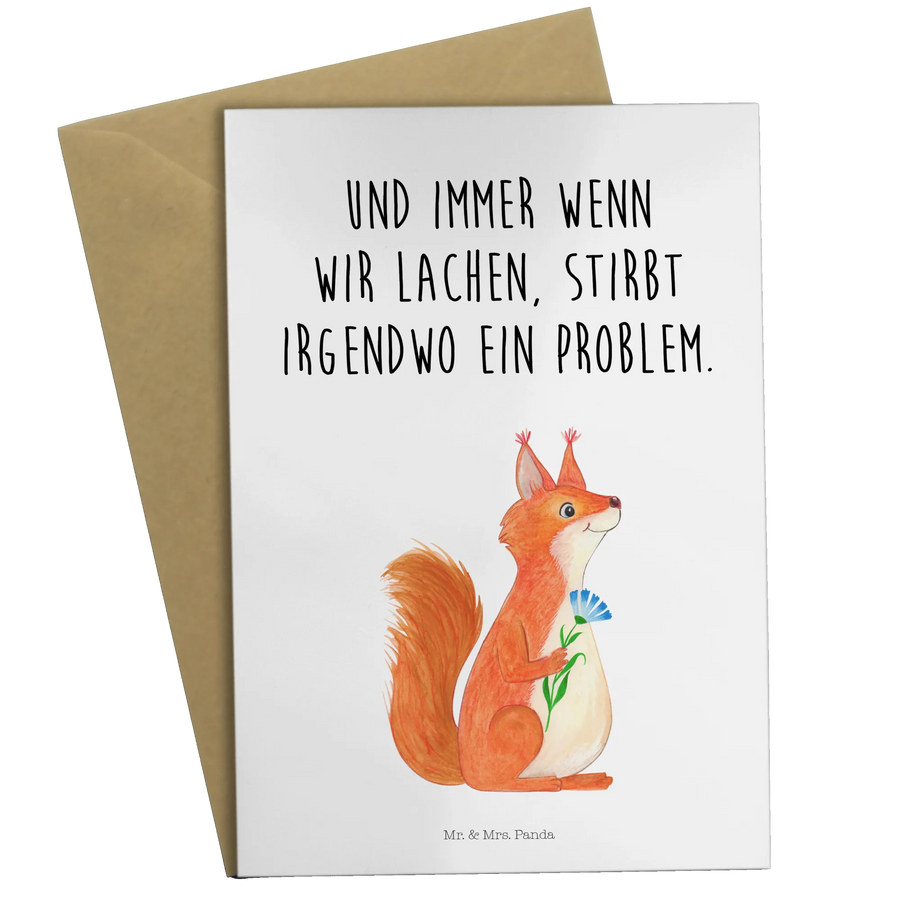 Die Grußkarte "Eichhörnchen Blume" aus der zauberhaften Small World Kollektion von Mr. & Mrs. Panda ist das perfekte Geschenk für alle, die Freude, Glück und gute Laune verbreiten möchten! Diese wunderschöne Karte kombiniert ein niedliches Eichhörnchen mit einer Blume und einem herzerwärmenden Spruch, der sagt: "Und immer wenn wir lachen, stirbt irgendwo ein Problem." Wer kann da schon widerstehen?