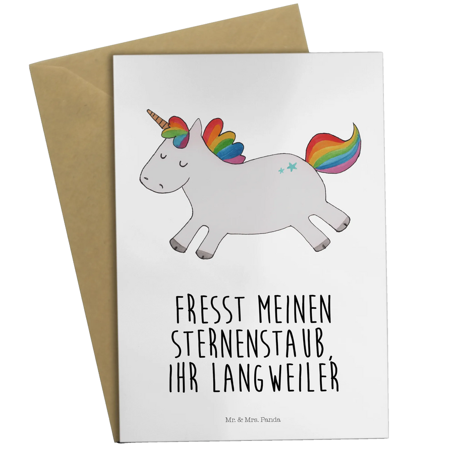 Die Grußkarte "Einhorn Happy" aus der zauberhaften Einhorn-Kollektion von Mr. & Mrs. Panda ist mehr als nur ein Stück Papier – sie ist ein kleiner Lichtblick für jeden, der sie erhält! Diese wunderschöne und einzigartige Grußkarte begeistert durch ihr fröhliches Einhorn-Motiv mit Regenbogen-Mähne und einem witzigen Spruch: "Fresst meinen Sternenstaub, ihr Langweiler." Egal, ob für einen Geburtstag, zur Hochzeit oder einfach nur um jemandem ein Lächeln ins Gesicht zu zaubern – diese Karte ist das perfekte Geschenk.