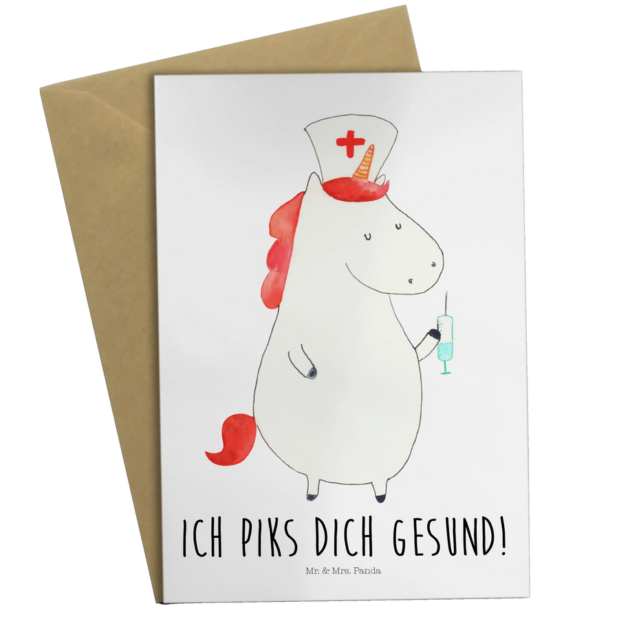 Entdecke die zauberhafte Grußkarte "Einhorn Krankenschwester" aus der einzigartigen Einhorn - Kollektion von Mr. & Mrs. Panda! Diese wunderbare Klappkarte ist das perfekte Geschenk für all die tapferen Krankenschwestern und Krankenschwestern, die ihre Patienten mit einem Lächeln wieder gesund piksens. Der niedliche Einhorn-Motiv stellt einen besonderen Charakter dar, der mit seiner geheimen Superkraft, dem "Gesundpiksen", jeden Patienten wieder auf die Beine bringt.