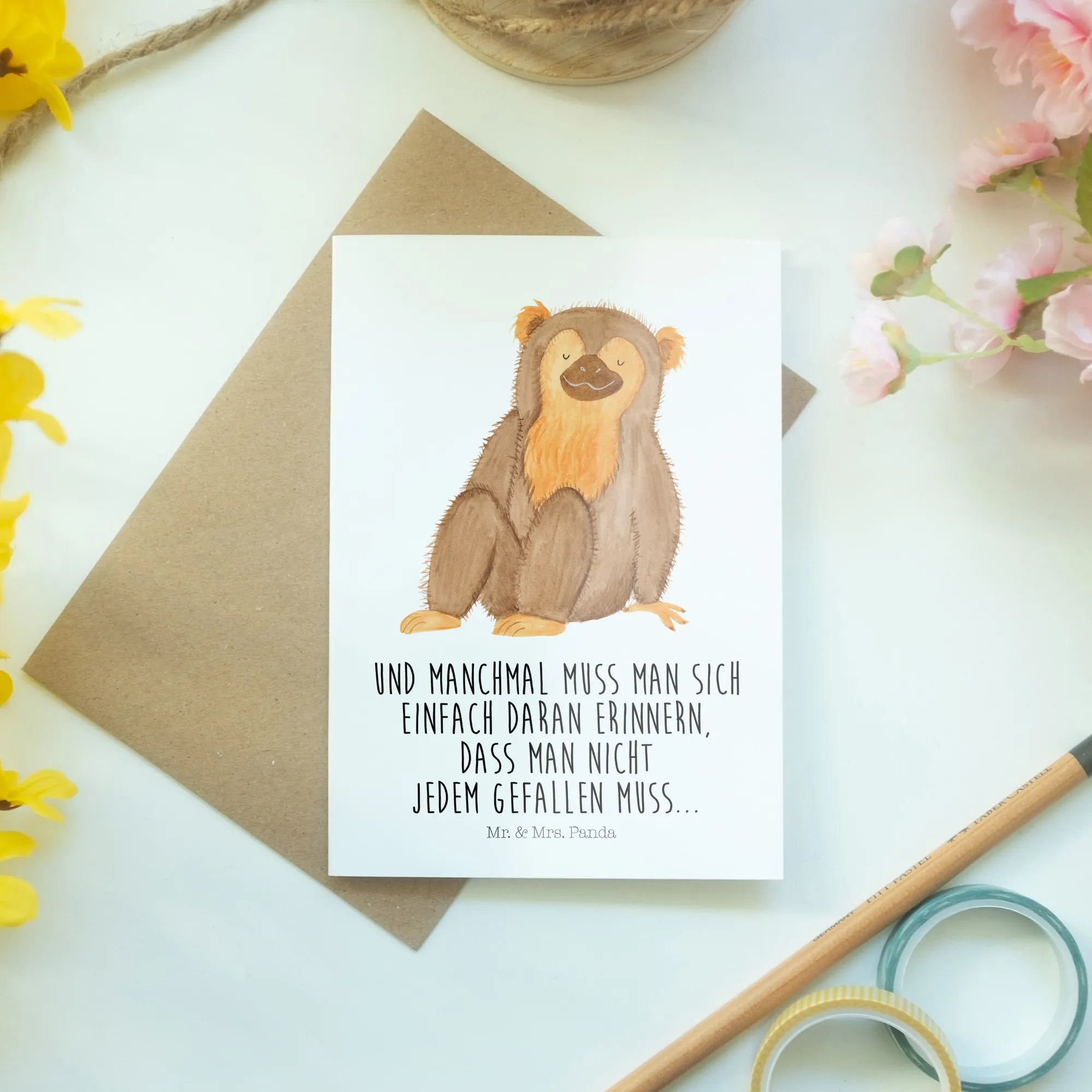 Die wunderschöne Grußkarte mit dem motivierenden Affen aus der Afrika Kollektion von Mr. & Mrs. Panda ist das perfekte Geschenk für jeden Anlass! Dieses süße Motiv zeigt einen kleinen, selbstbewussten Affen, der mit einem charmanten Blick dazu einlädt, an die Selbstliebe zu denken. In einer Welt, in der man oft versucht, es jedem recht zu machen, spricht die Botschaft dieser Karte laut und deutlich: 'Und manchmal muss man sich einfach daran erinnern, dass man nicht jedem gefallen muss...'