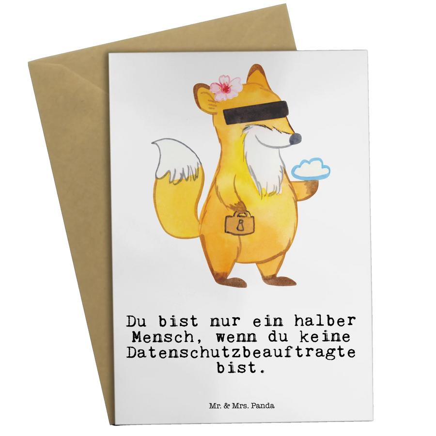 Die Karte beeindruckt nicht nur mit ihrem einzigartigen Design - einem niedlichen, schlauen Fuchs, der mit einem Schloss in der Hand für Datenschutz sorgt - sondern auch mit ihrem herzlichen Spruch: 'Du bist nur ein halber Mensch, wenn du keine Datenschutzbeauftragte bist.' Das ist eine wunderbare Möglichkeit, um Wertschätzung für die harte Arbeit der Datenschutzbeauftragten auszudrücken.