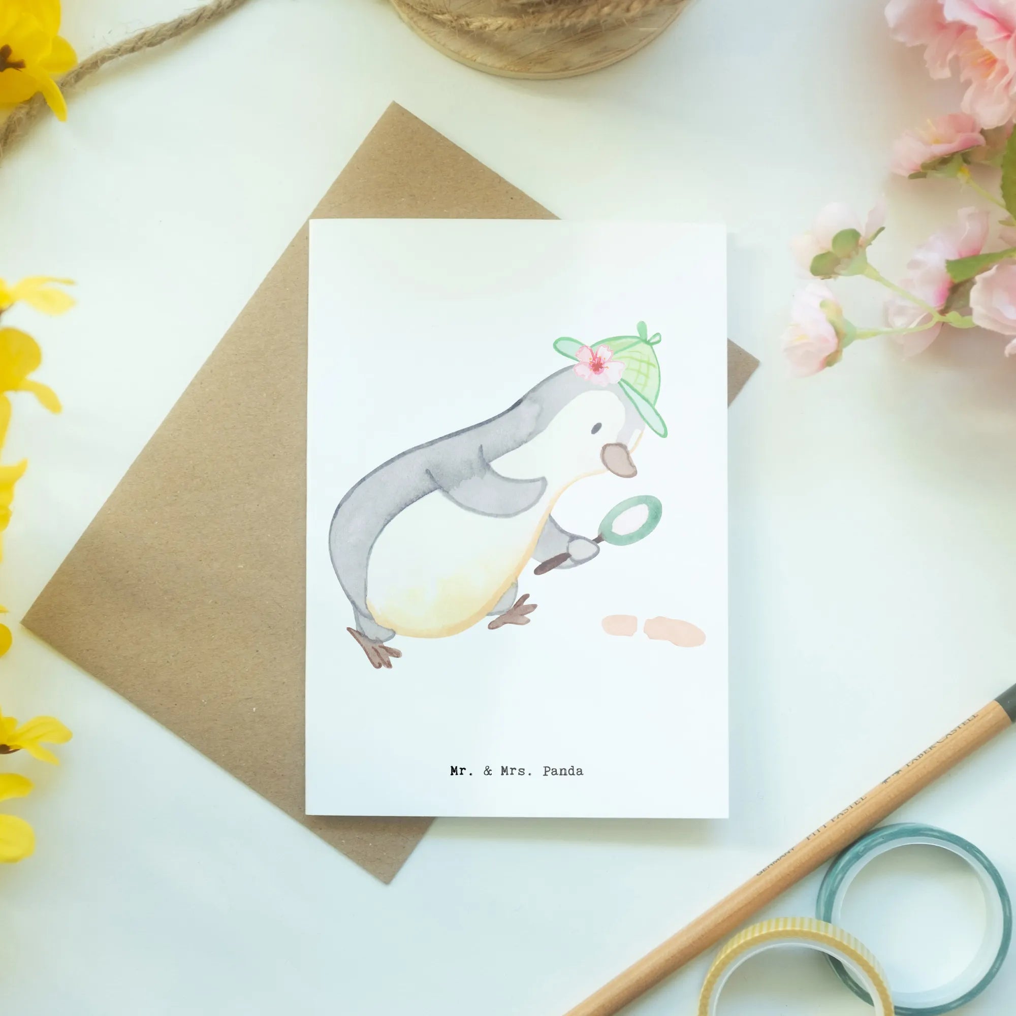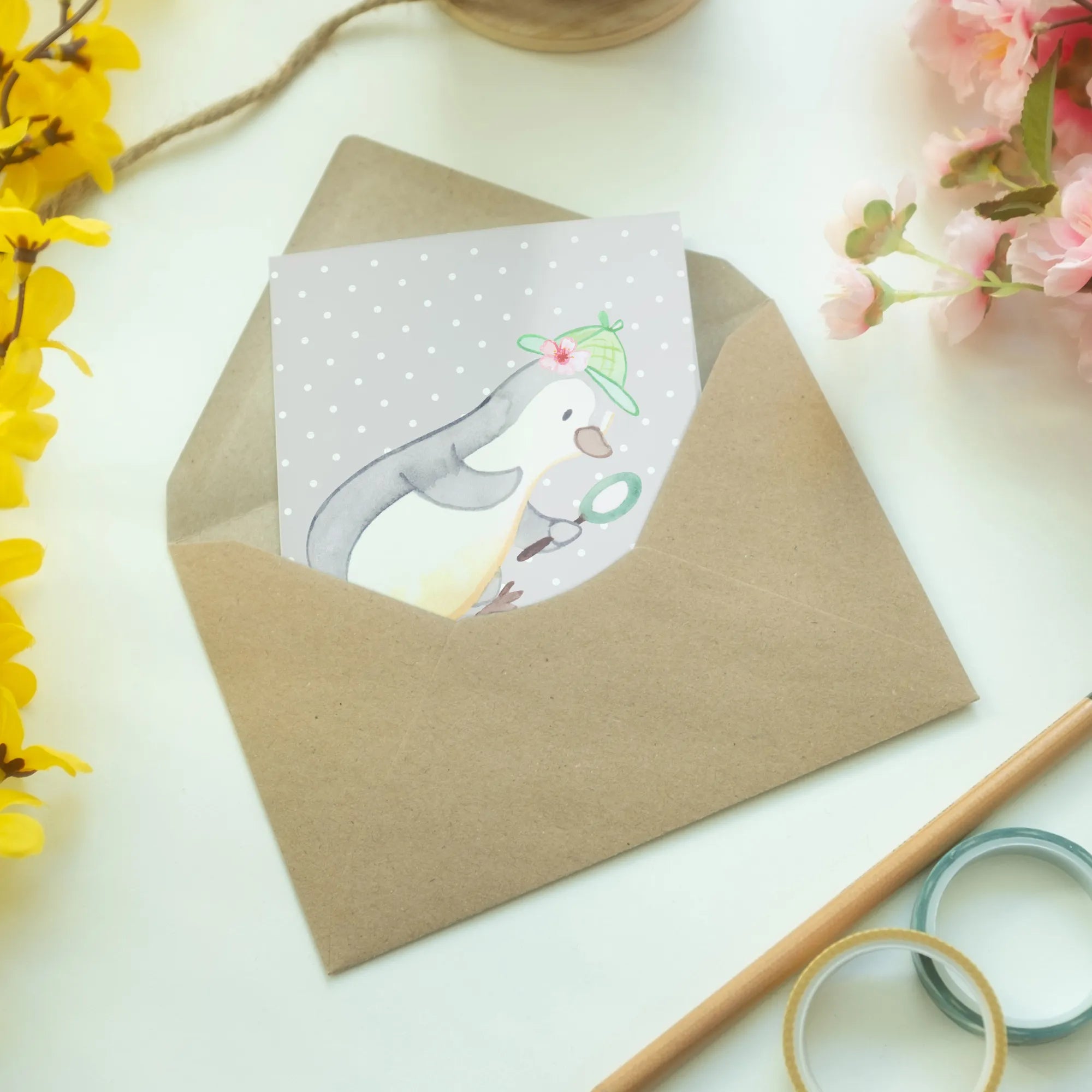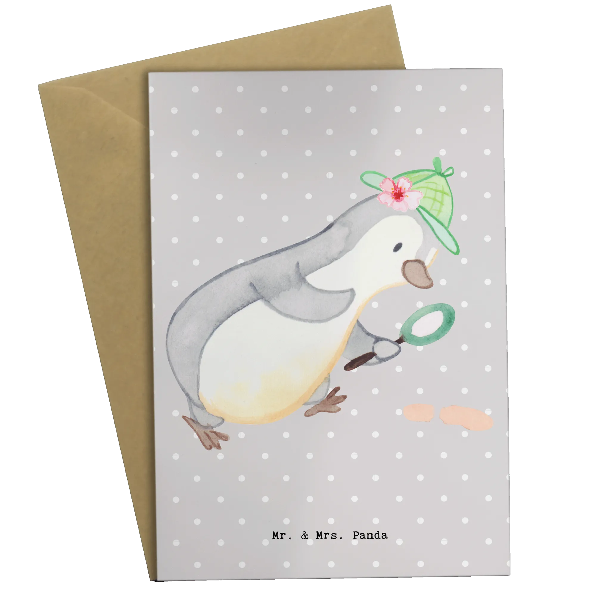 Die Grußkarte "Detektivin mit Herz" aus der einzigartigen Berufe-Kollektion von Mr. & Mrs. Panda ist das perfekte Geschenk für angehende Detektivinnen oder leidenschaftliche Ermittlerinnen! Diese liebevoll gestaltete Karte bringt nicht nur ein Lächeln ins Gesicht, sondern vermittelt auch, wie wichtig und spannend der Beruf der Detektivin ist.