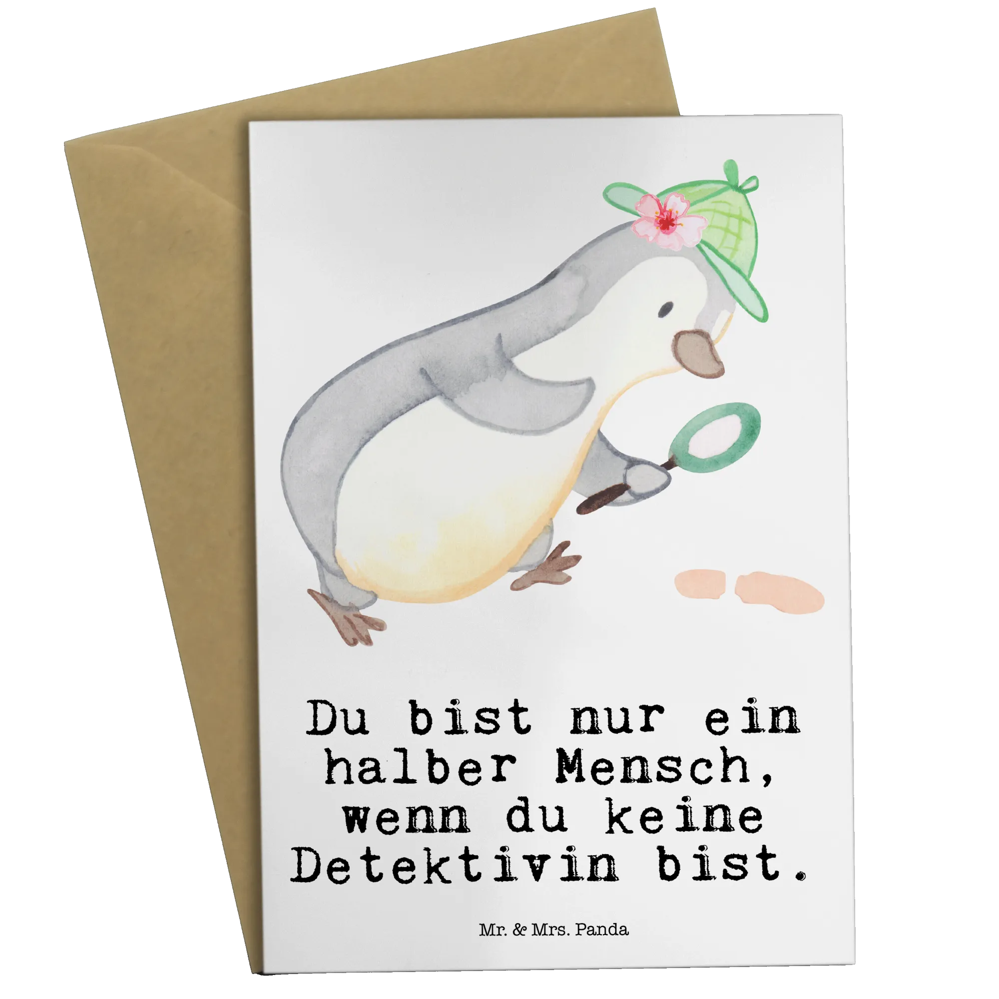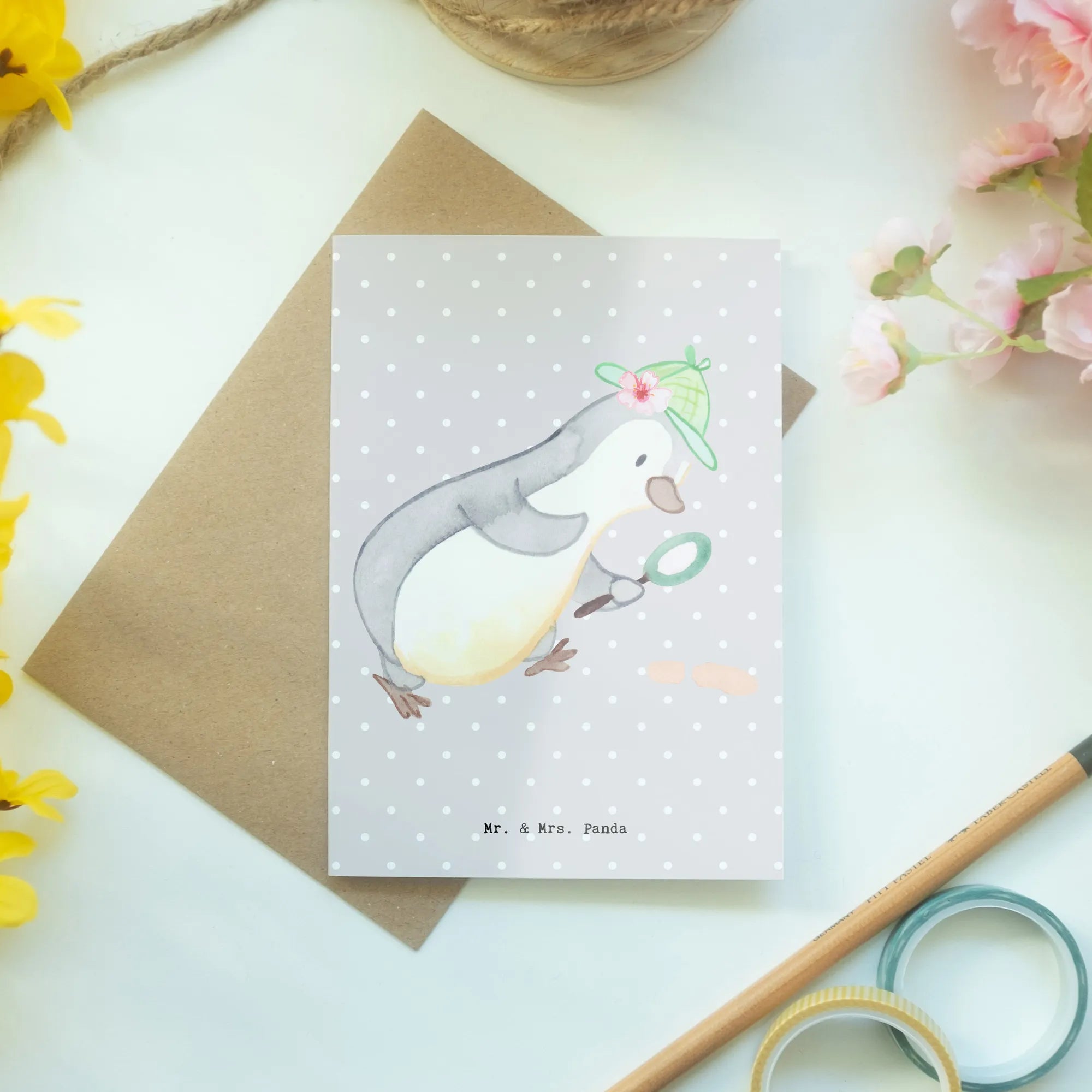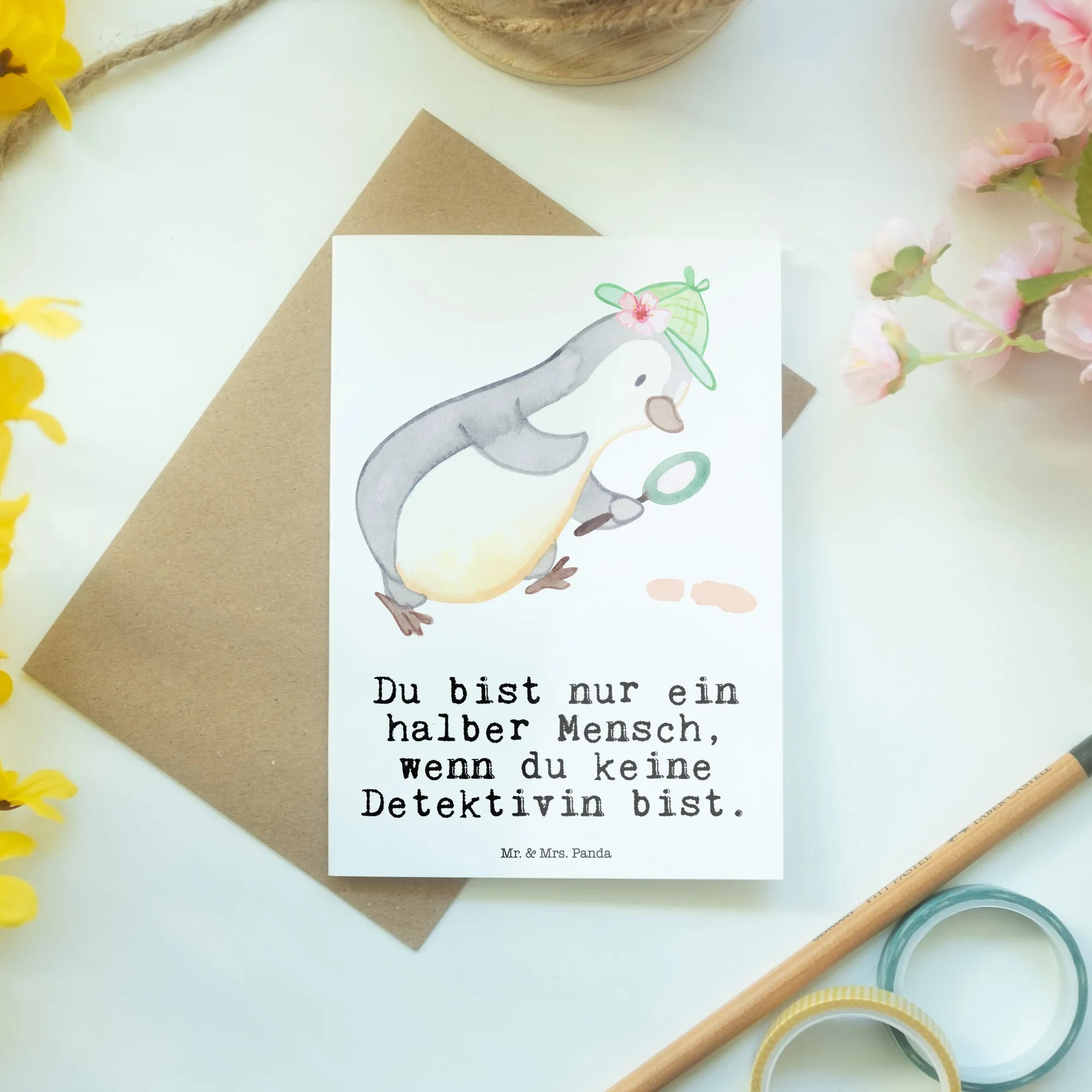 Die Grußkarte "Detektivin mit Herz" aus der einzigartigen Berufe-Kollektion von Mr. & Mrs. Panda ist das perfekte Geschenk für angehende Detektivinnen oder leidenschaftliche Ermittlerinnen! Diese liebevoll gestaltete Karte bringt nicht nur ein Lächeln ins Gesicht, sondern vermittelt auch, wie wichtig und spannend der Beruf der Detektivin ist.