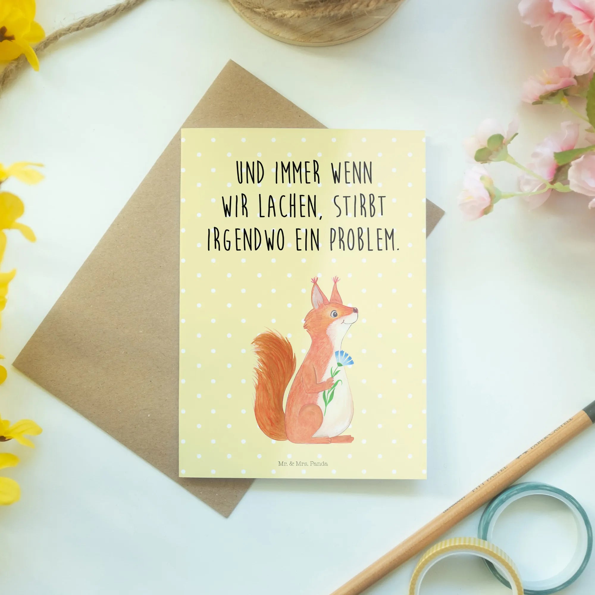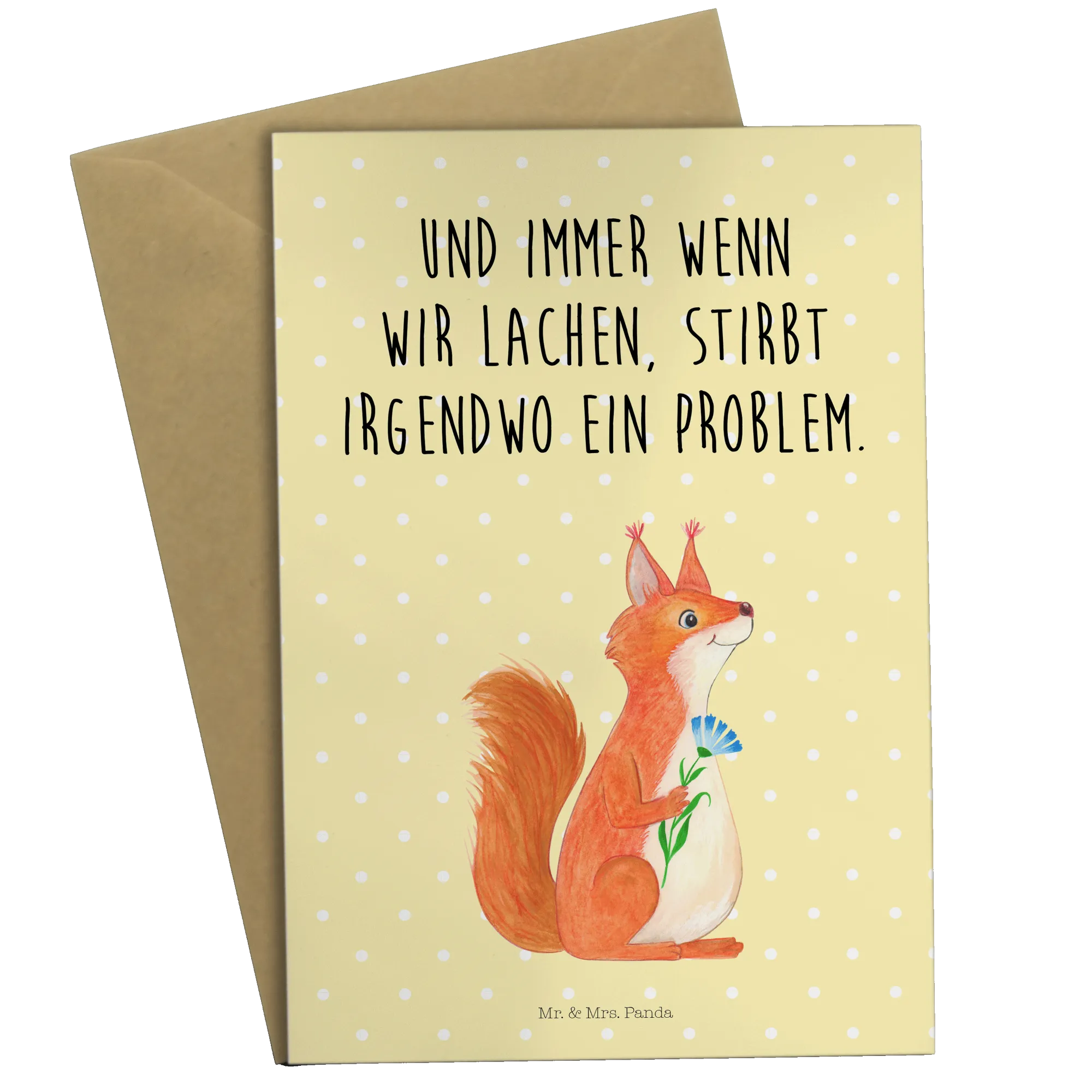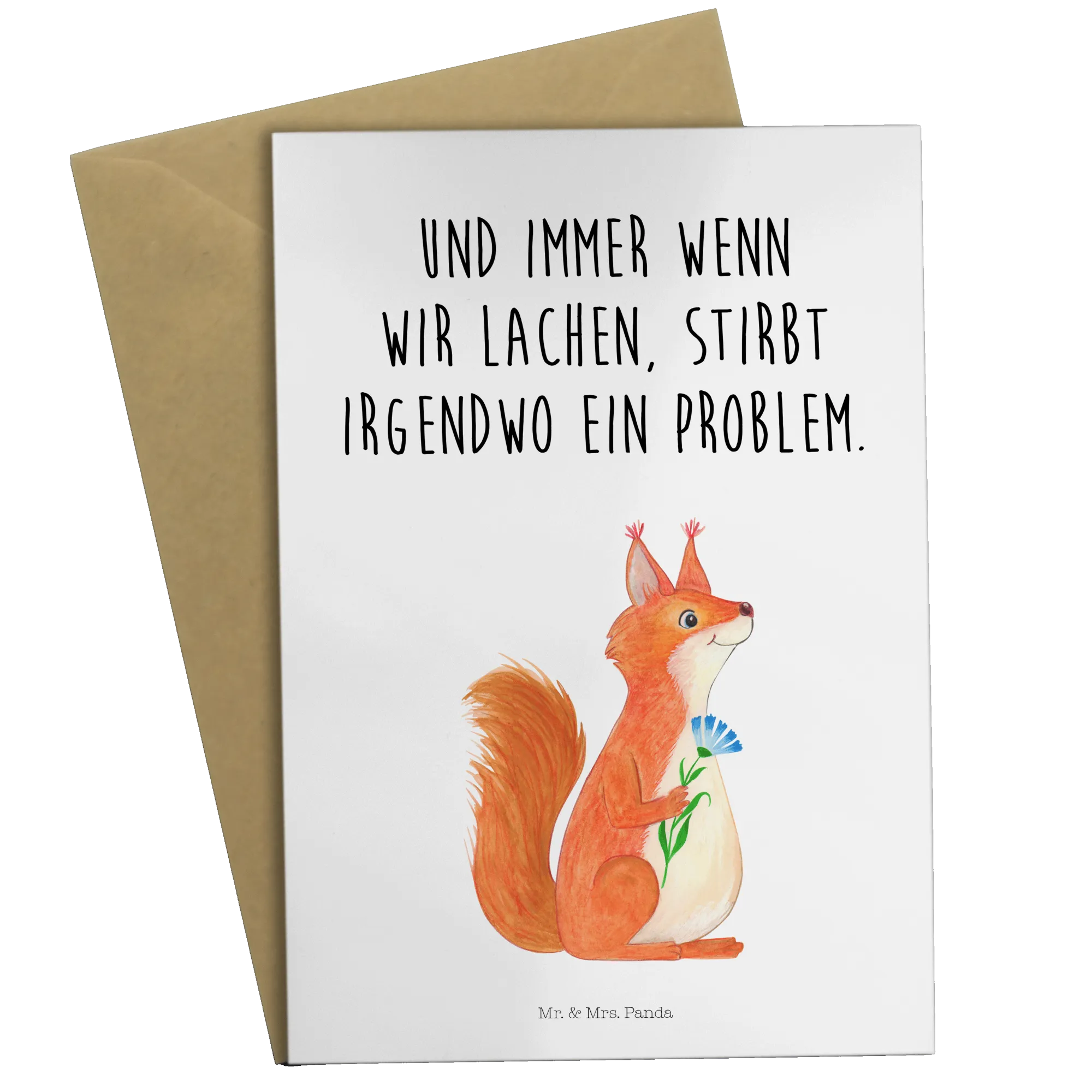 Die Grußkarte "Eichhörnchen Blume" aus der zauberhaften Small World Kollektion von Mr. & Mrs. Panda ist das perfekte Geschenk für alle, die Freude, Glück und gute Laune verbreiten möchten! Diese wunderschöne Karte kombiniert ein niedliches Eichhörnchen mit einer Blume und einem herzerwärmenden Spruch, der sagt: "Und immer wenn wir lachen, stirbt irgendwo ein Problem." Wer kann da schon widerstehen?