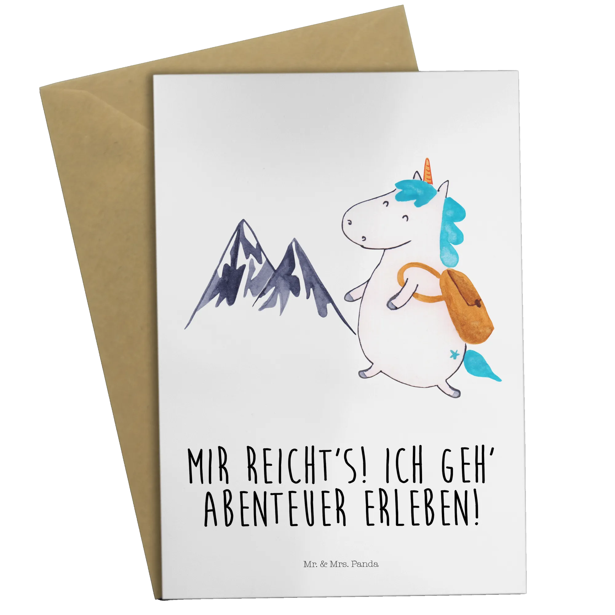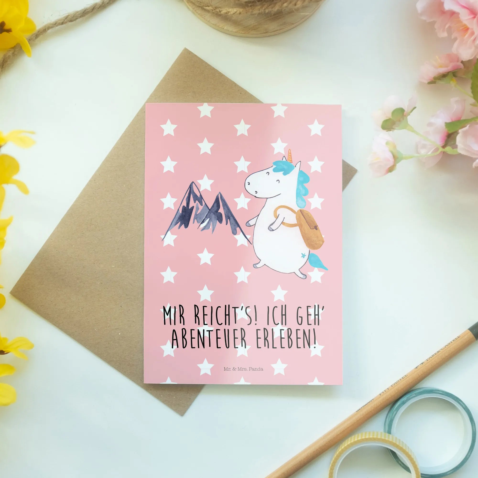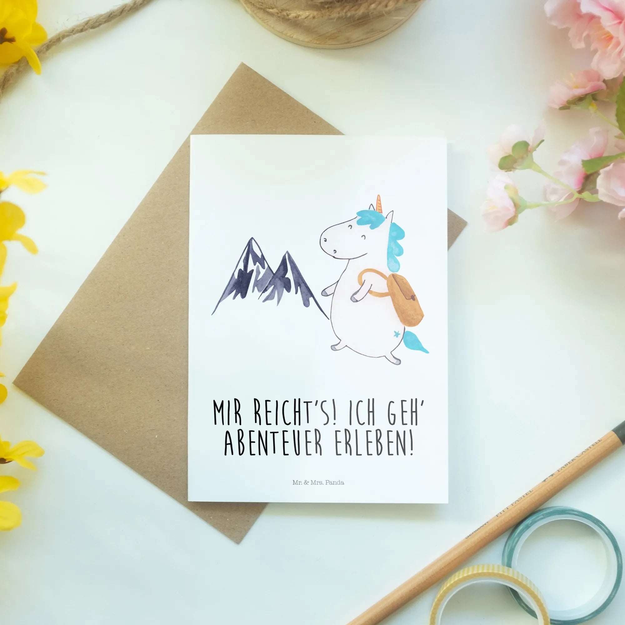 Das liebevoll gestaltete Einhorn mit Rucksack symbolisiert den Drang, die Welt zu erkunden und neue Abenteuer zu erleben. Der eingängige Slogan "Mir reicht's! Ich gehe Abenteuer erleben!" spricht den Entdecker in jedem von uns an und macht die Karte zu einem ganz besonderen Highlight.