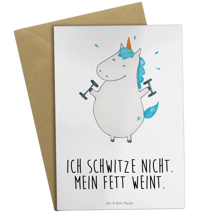 Die Grußkarte "Einhorn Fitness" aus der einzigartigen Einhorn Kollektion von Mr. & Mrs. Panda ist das perfekte Geschenk für alle Fitnessbegeisterten und die, die es werden möchten! Diese zauberhafte Karte zeigt ein fröhliches Einhorn mit Hanteln, das motiviert und ein Lächeln ins Gesicht zaubert.