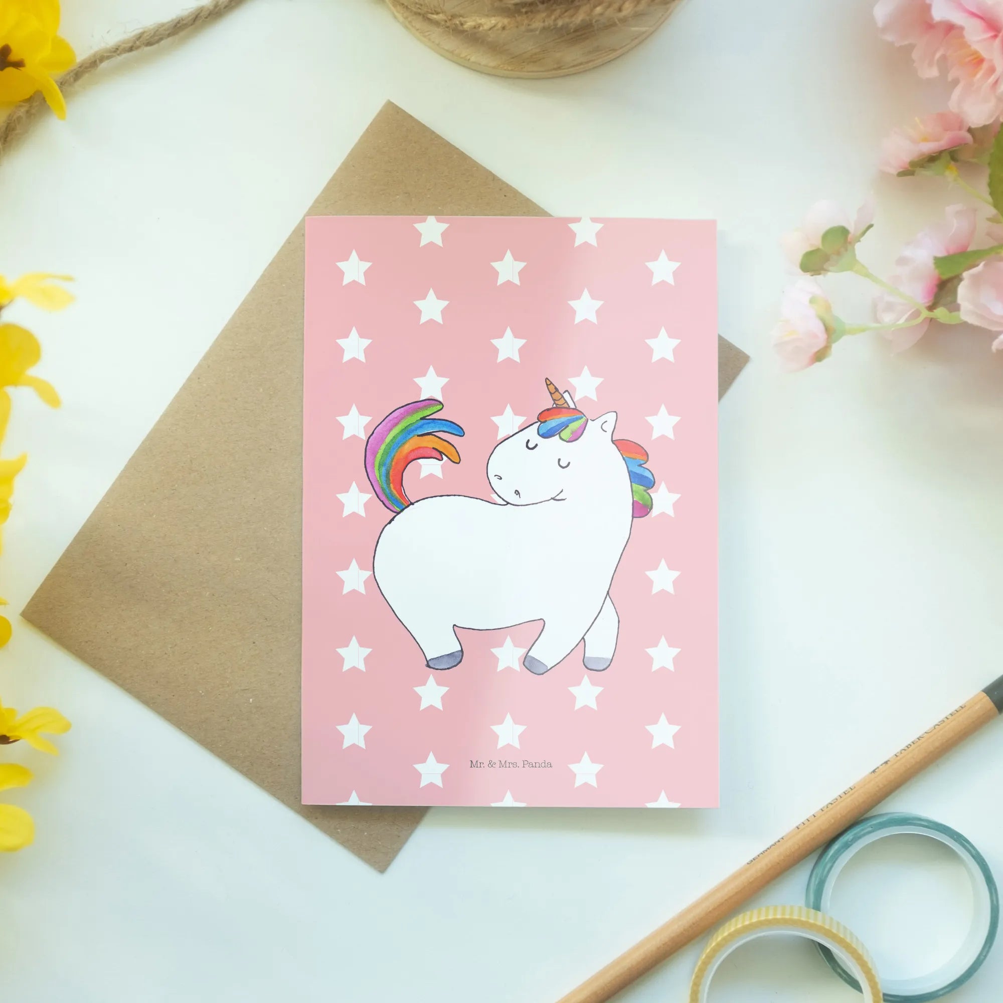 Mit einem edlen Umschlag inklusive ist sie außerdem perfekt für jede feierliche Gelegenheit. Die Einhorn-Kollektion von Mr. & Mrs. Panda zeigt die zauberhafte Welt der Einhörner – ideal für alle Einhornliebhaber, die die bunten und einzigartigen Designs schätzen. Hol dir die stolzierende Einhorn-Karte und verbreite Freude mit einem Hauch von Magie! Diese Grußkarte ist das ideale Geschenk für alle, die Einhörner lieben und sich gerne mit kreativen und bunten Designs umgeben.