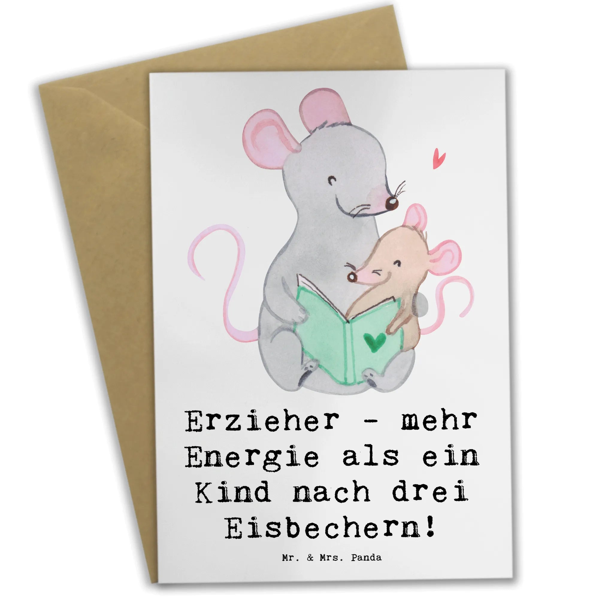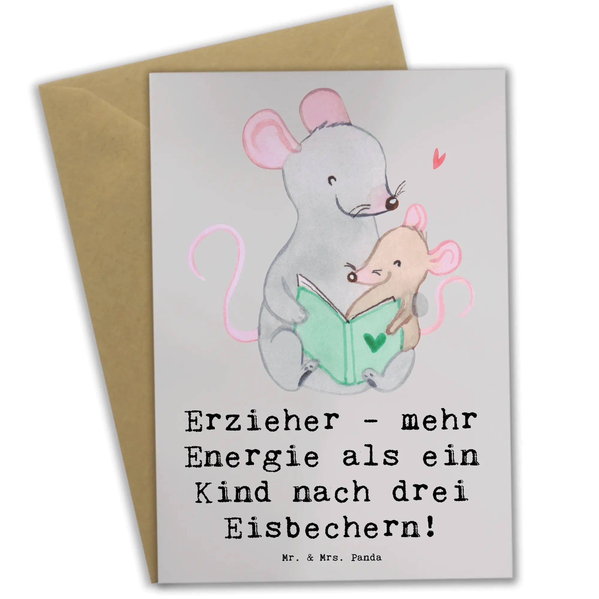 Die Grußkarte "Erzieher - mehr Energie als ein Kind nach drei Eisbechern!" von Mr. & Mrs. Panda ist das perfekte Geschenk für alle, die den spannenden Beruf eines Erziehers ausüben. Egal ob zu Geburtstagsfeiern, Hochzeiten oder einfach nur, um ein Dankeschön auszusprechen, diese liebevoll gestaltete Klappkarte bringt Freude und Lächeln in den Alltag. Mit einem süßen, handgezeichneten Motiv, das von Mrs. Panda liebevoll kreiert wurde, ist jede Karte ein Kunstwerk für sich.
