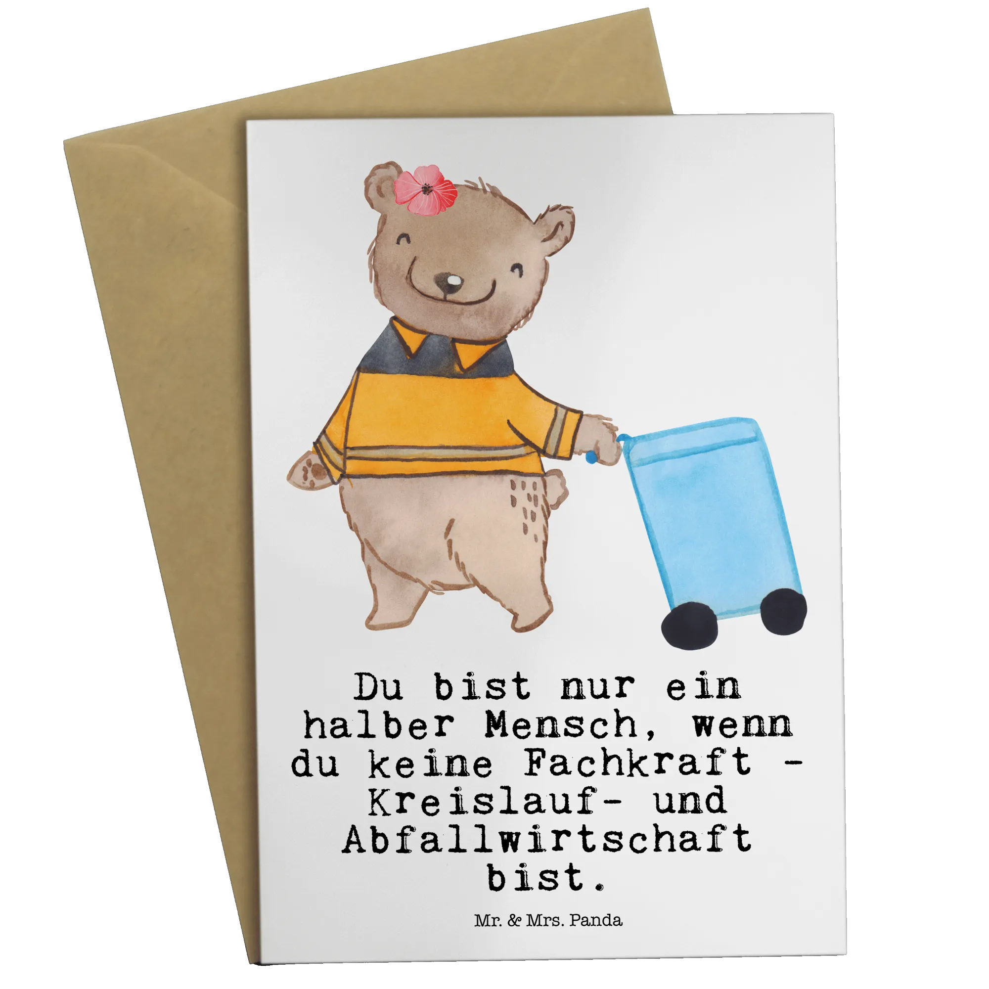 Das süße Design zeigt einen niedlichen Bären, der verantwortungsvoll eine Mülltonne hinter sich herzieht und damit für die Sauberkeit unserer Städte sorgt. Mit dem Slogan "Du bist nur ein halber Mensch, wenn du keine Fachkraft - Kreislauf- und Abfallwirtschaft bist" bietet die Karte eine humorvolle Note, die bei jedem Müllwerker ein Lächeln hervorruft.