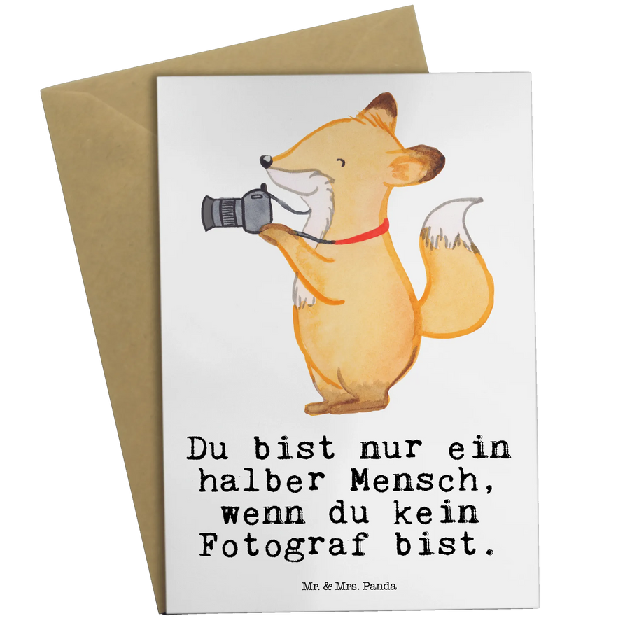 Entdecke die wunderschöne Grußkarte "Fotograf mit Herz" aus der kreativen Kollektion Berufe von Mr. & Mrs. Panda! Diese charmante Karte zeigt einen niedlichen Fuchs, der mit einer Kamera um den Hals umherläuft – ein perfektes Motiv für alle Fotografie-Liebhaber.