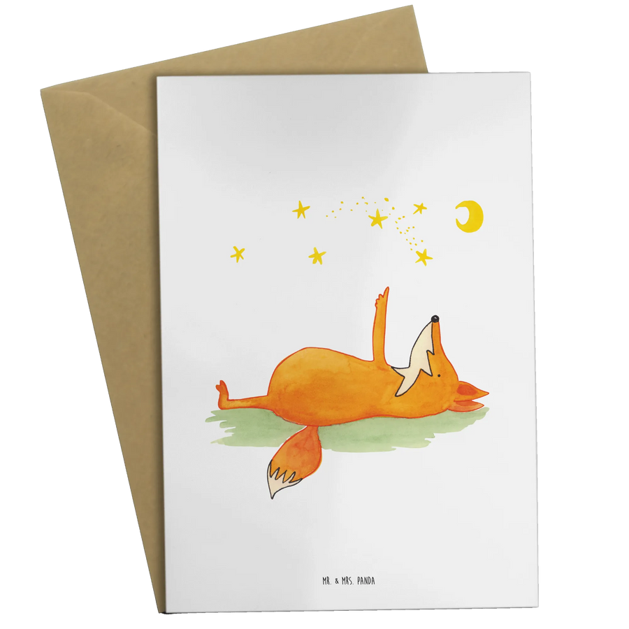 Die Grußkarte "Fuchs Sterne" aus der liebevollen Fuchs Kollektion von Mr. & Mrs. Panda ist das perfekte Geschenk für alle, die schöne, romantische und positive Botschaften lieben. Mit ihrem verspielten Fuchs-Motiv, das liebevoll auf dem Rücken liegend zum Sternenhimmel blickt, bringt sie ein Lächeln auf jedes Gesicht.