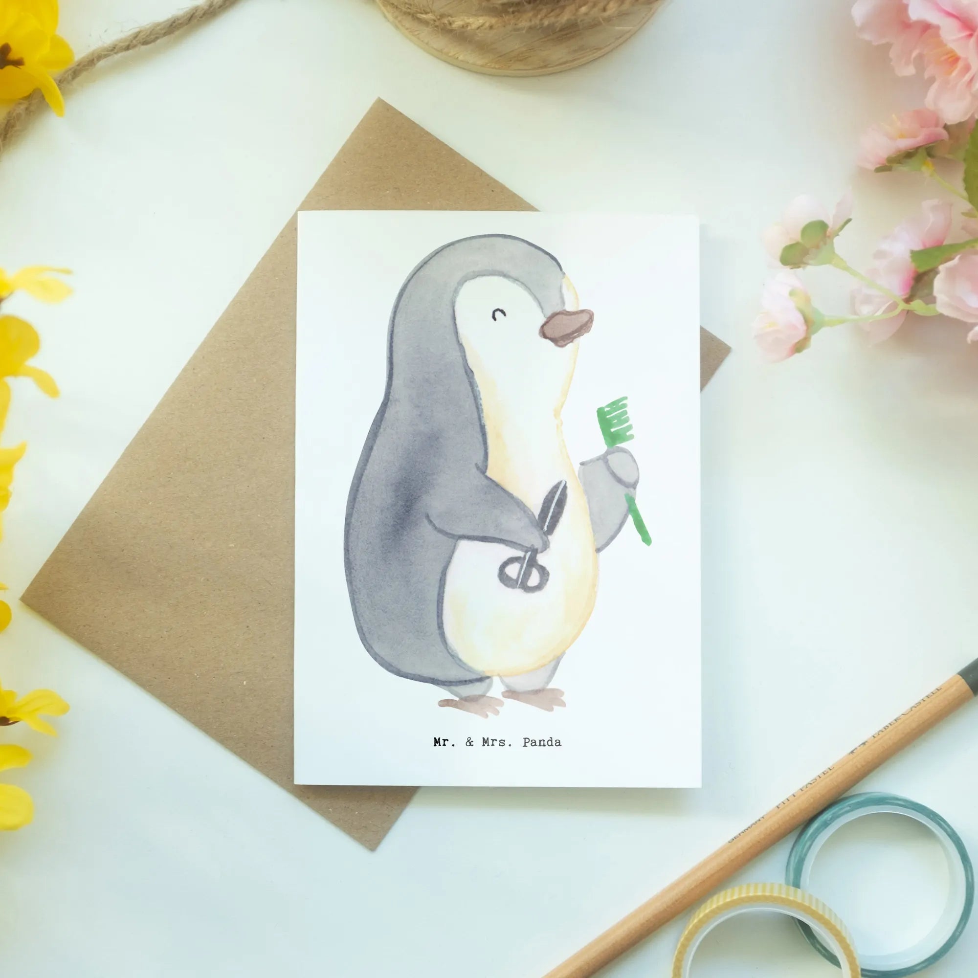 Diese einzigartige Grußkarte, bedruckt auf hochwertigem 300-Gramm-Papier, verbindet einen niedlichen Pinguin mit einem Kamm in der Hand und zeigt, wie viel Herzblut in der Hairstylist-Arbeit steckt. Die Karte hat eine elegante, hochglänzende Vorderseite und eine matte Innenseite, die sich hervorragend zum individuellen Beschriften eignet.